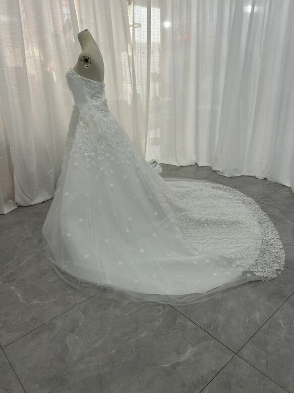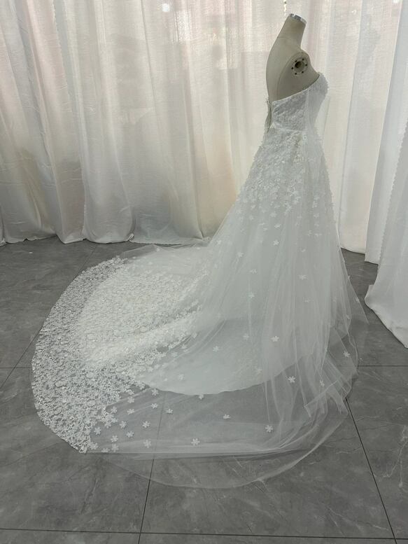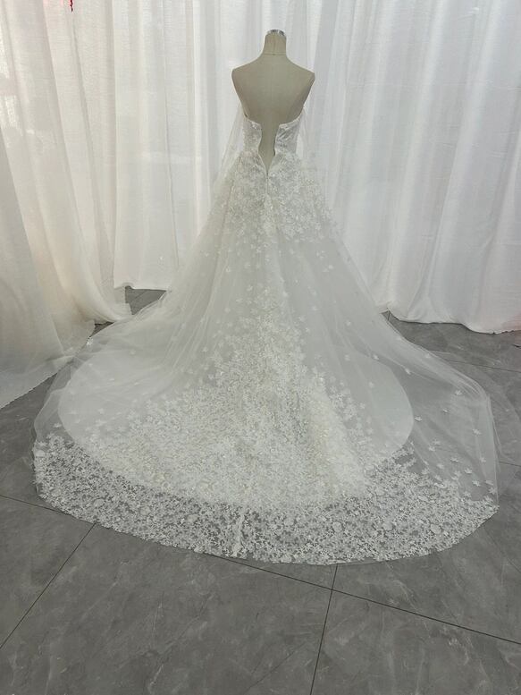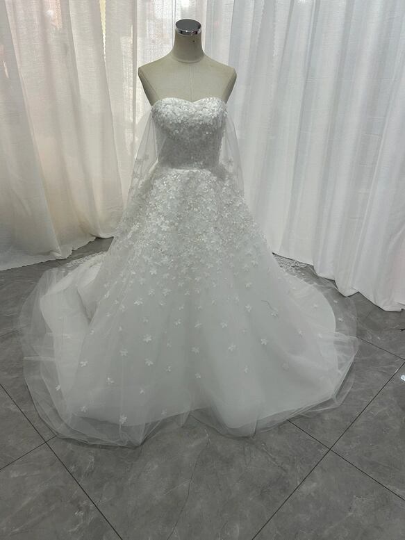 輝きな光彩を放つ !ベアトップ ウエディングドレス 上品レース ソフトチュール 華やかなトレーン /結婚式/披露宴