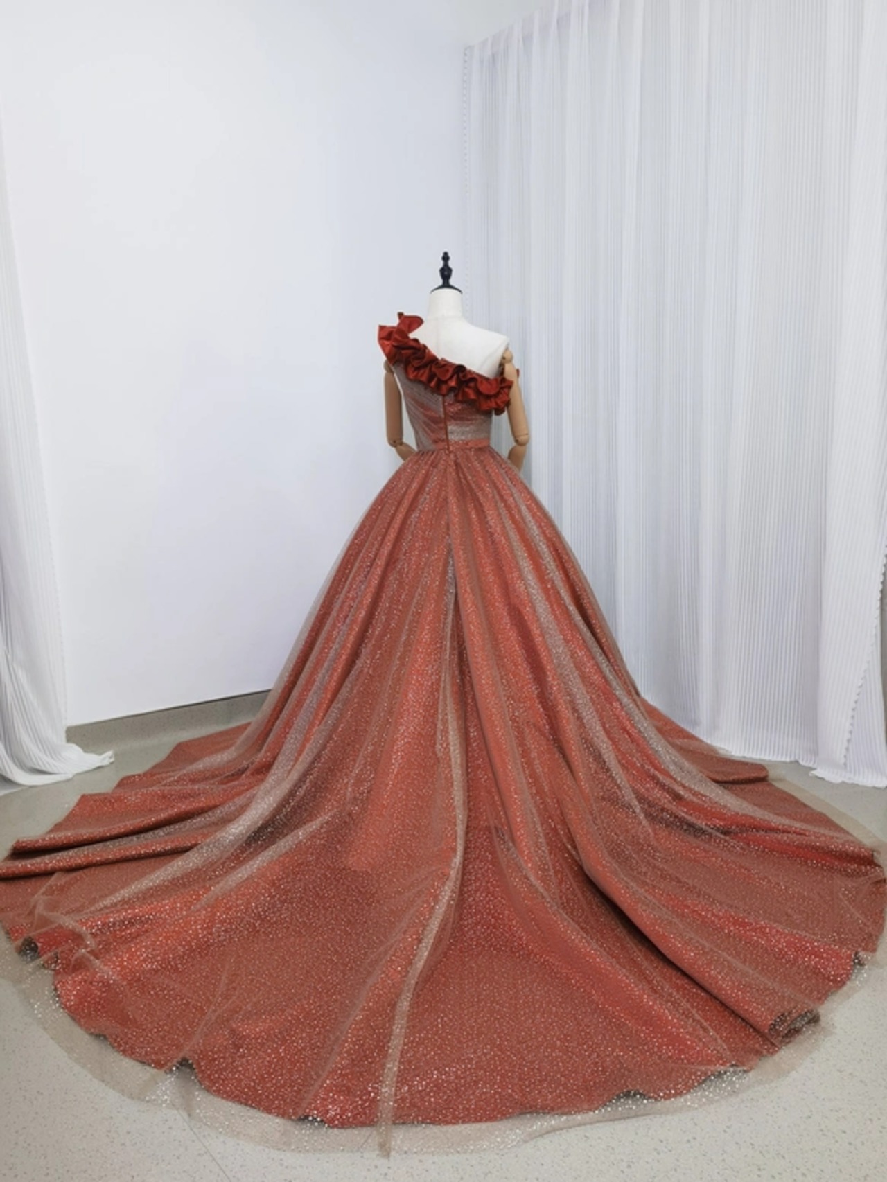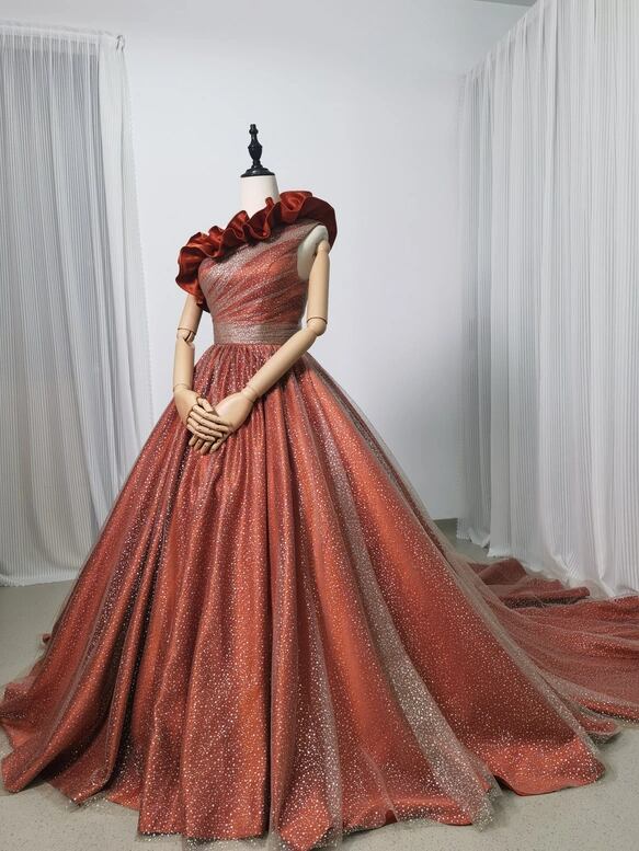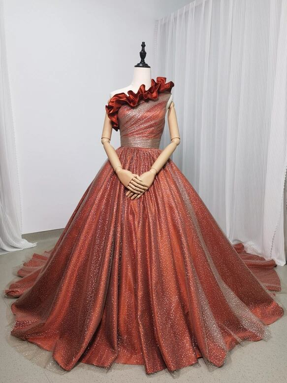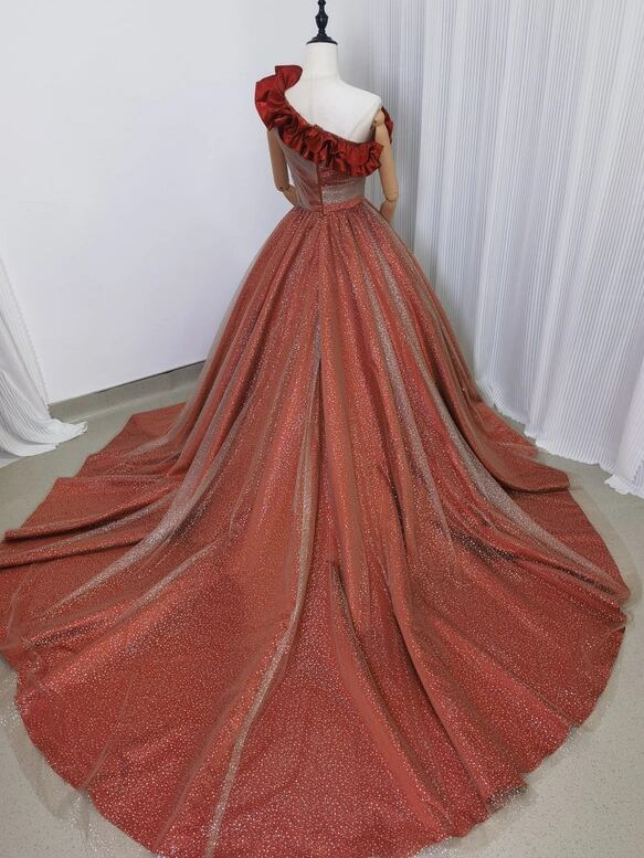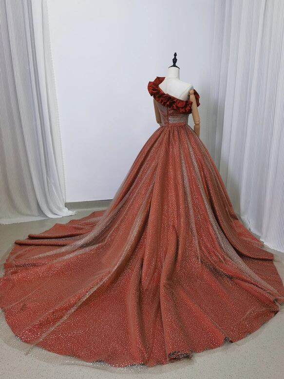カラードレス ショルダー型 キラキラグリッターチュール 華やかなトレーン ブライダル 抜群のおしゃれ見え