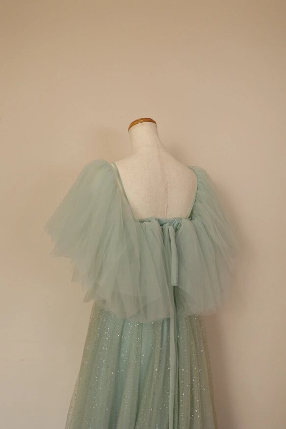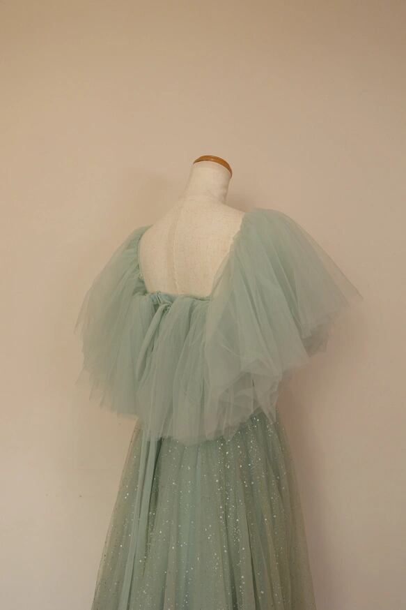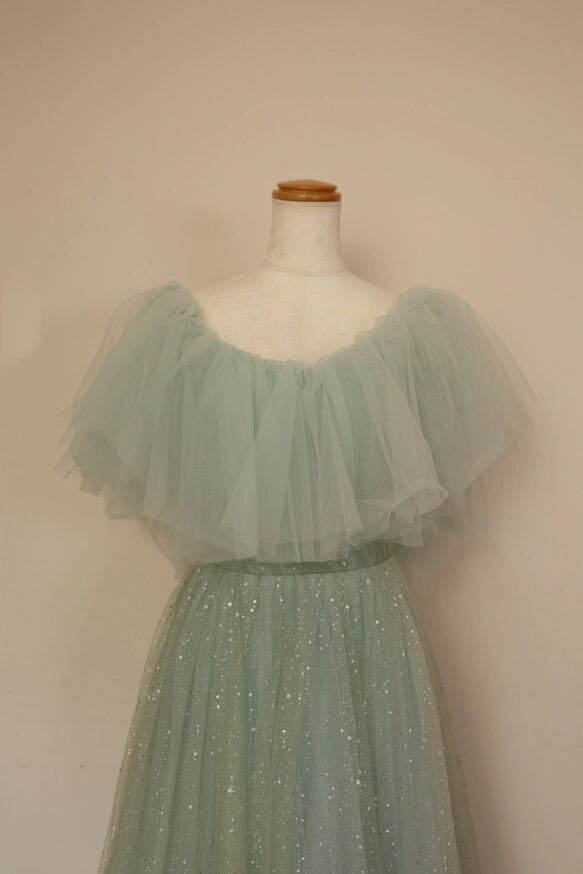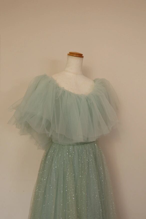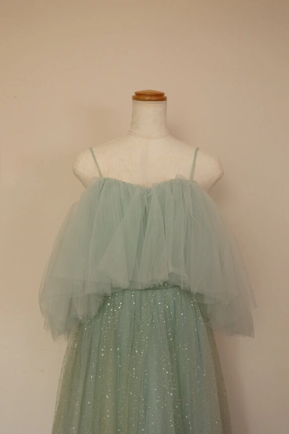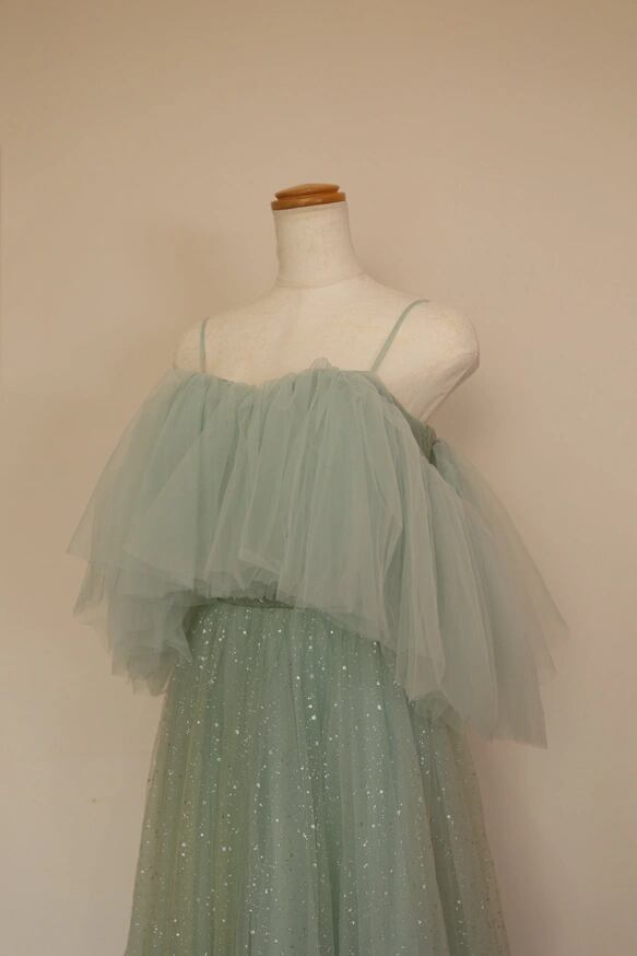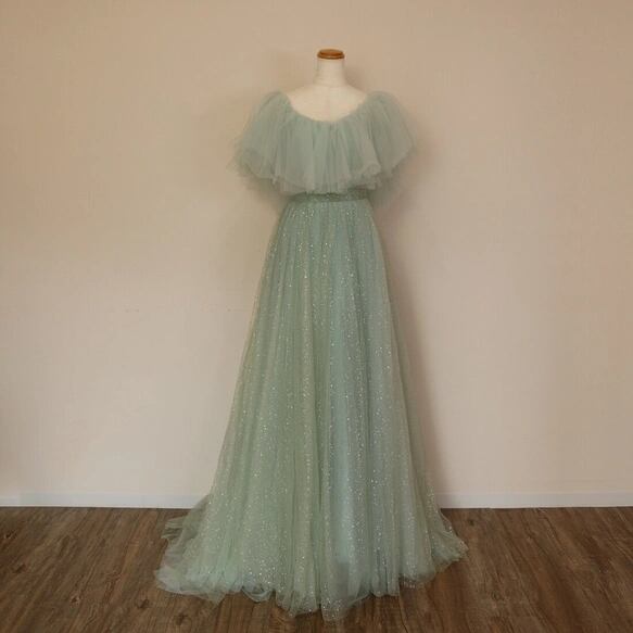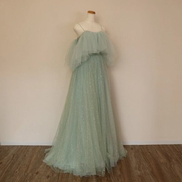 カラードレス オフショル キャミソール グリーン キラキラグリッターチュール ビスチェドレス 床付く