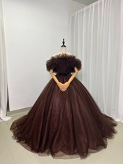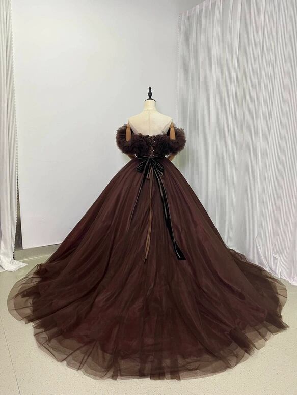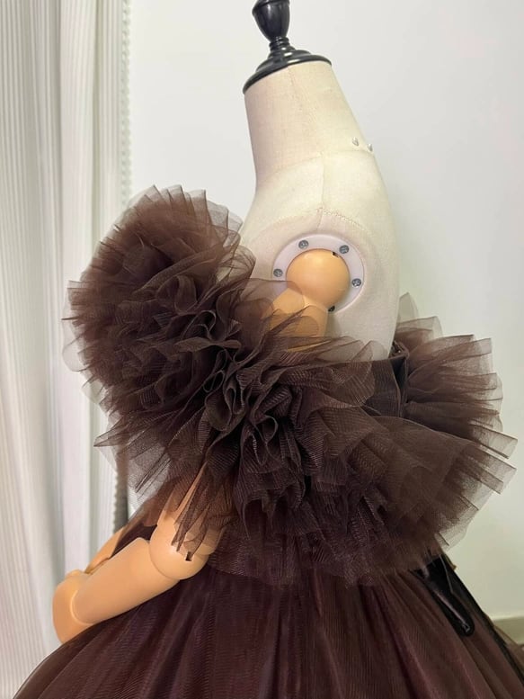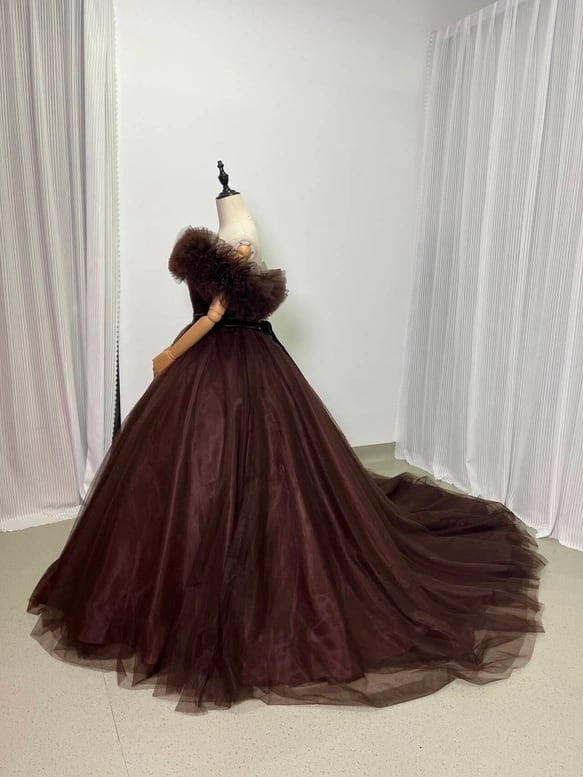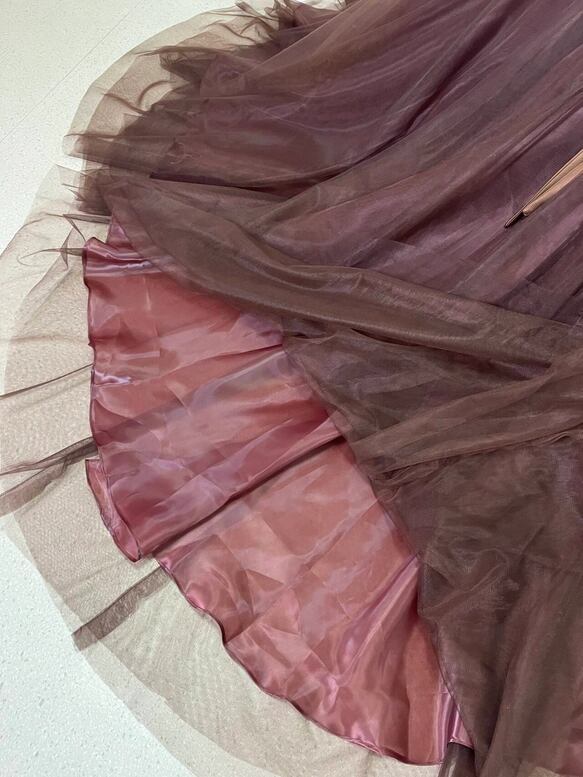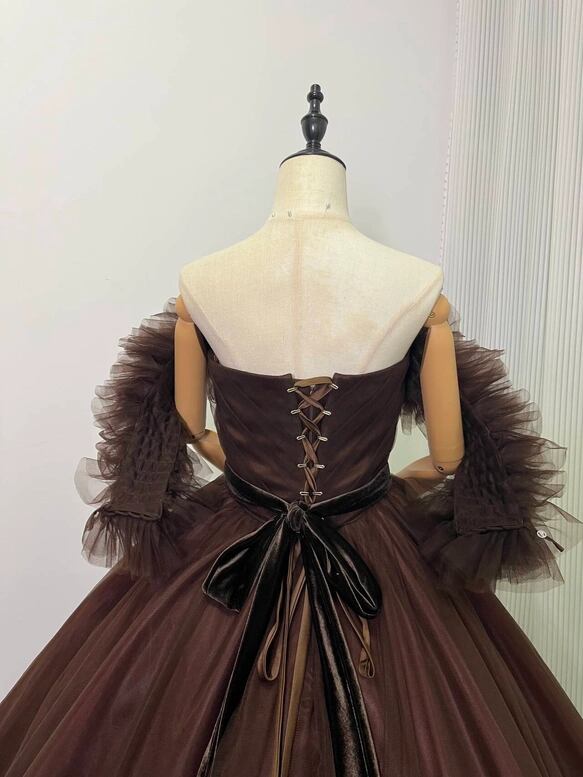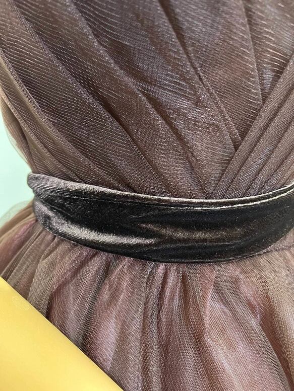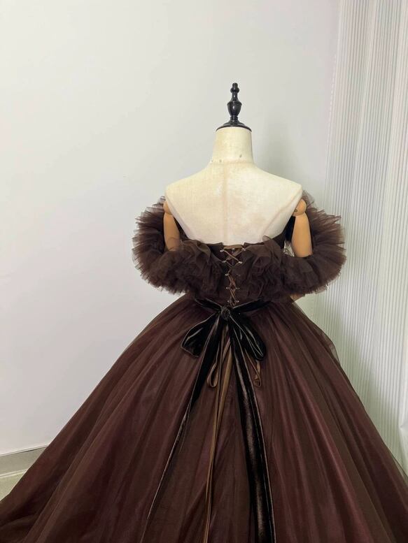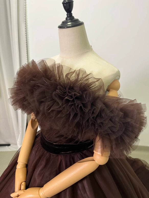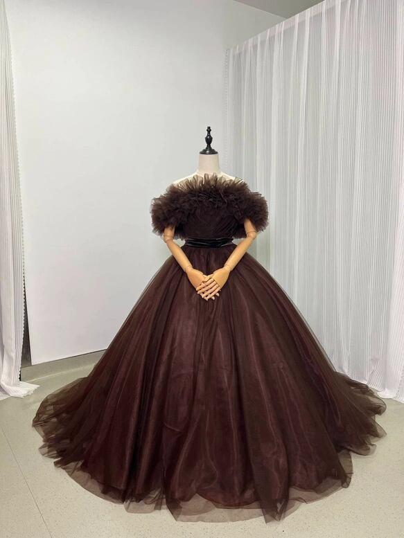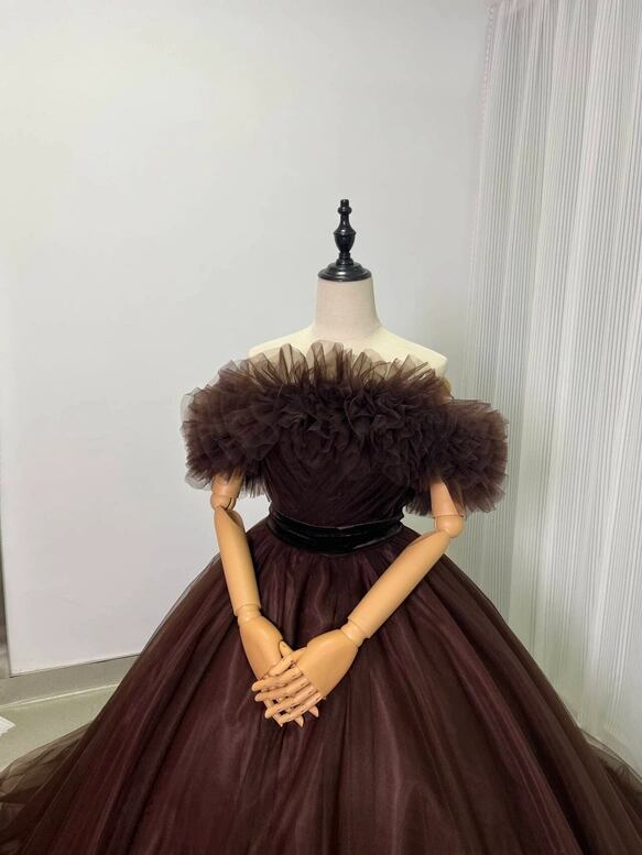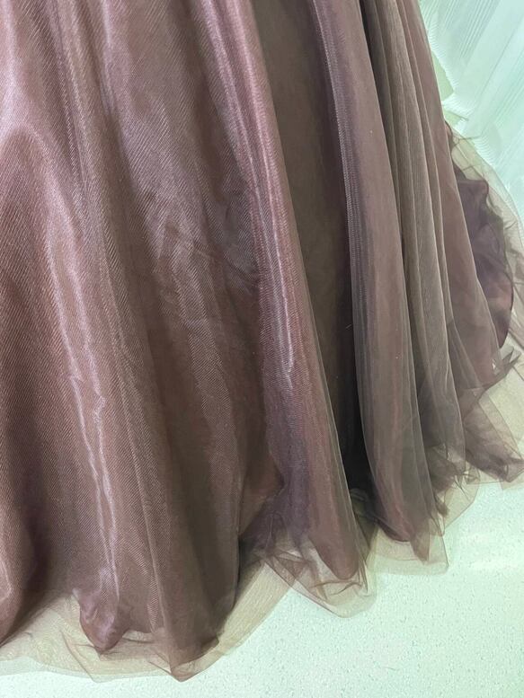 カラードレス ブラウン 取り外しオフショルダー 柔らかく重ねたチュールスカート ビスチェドレス サッシュベルト