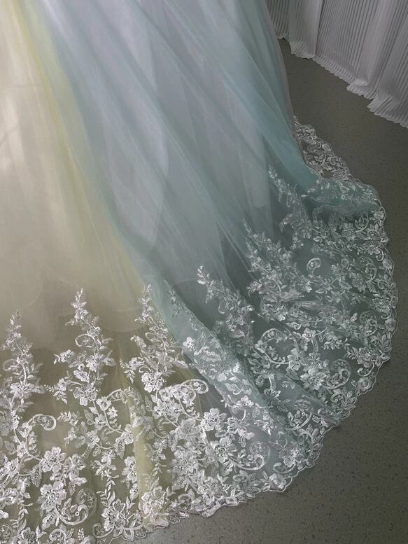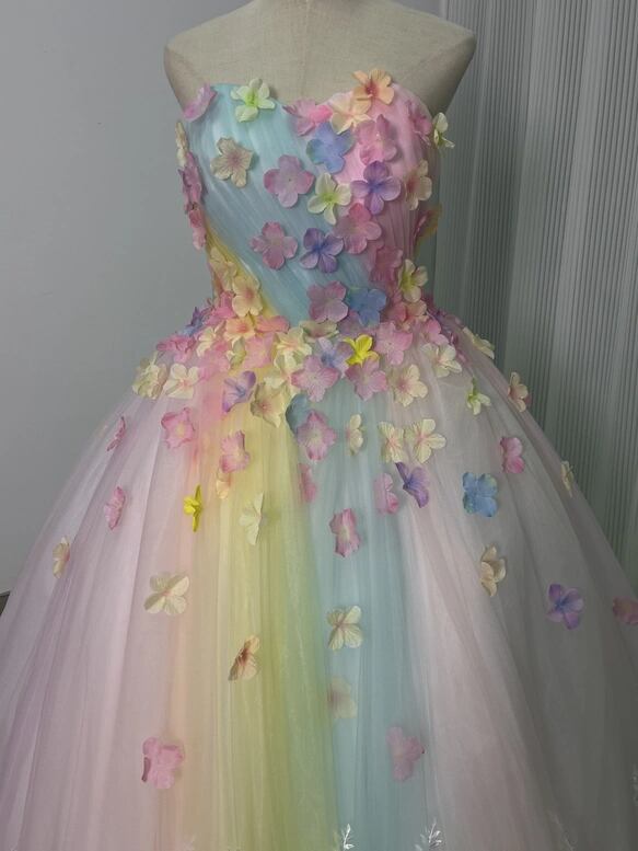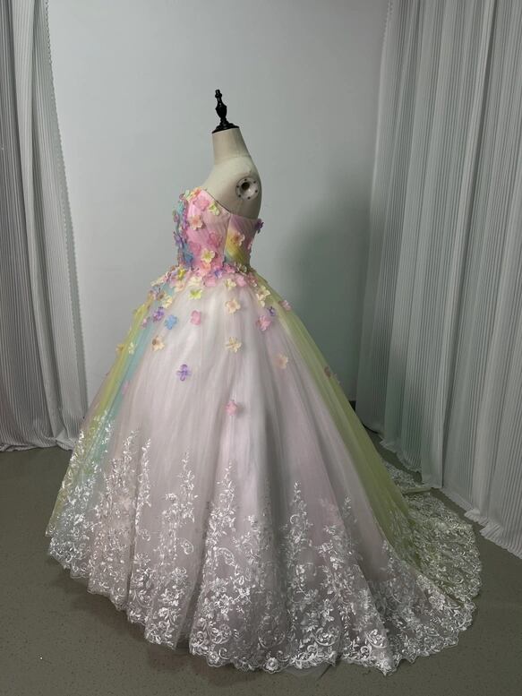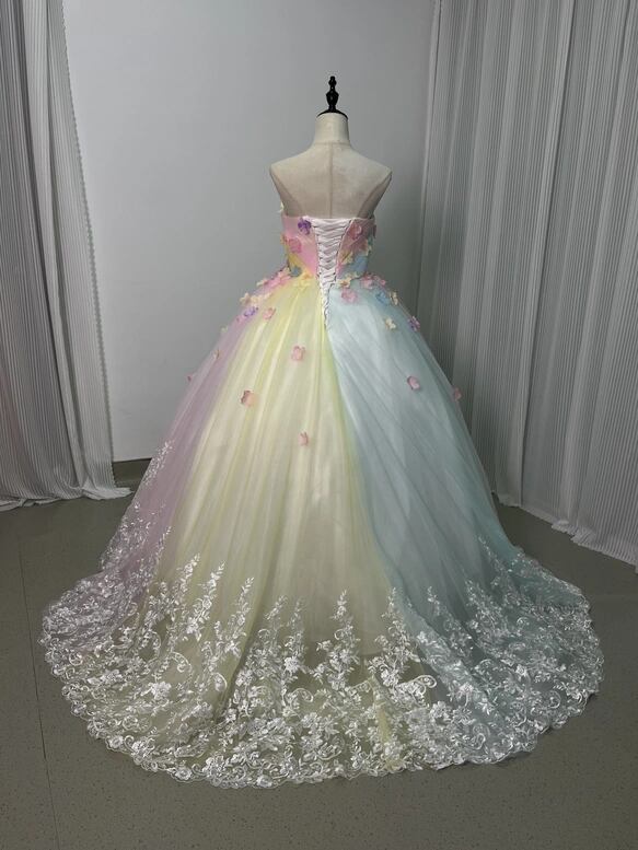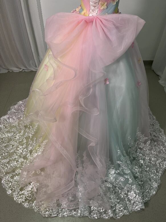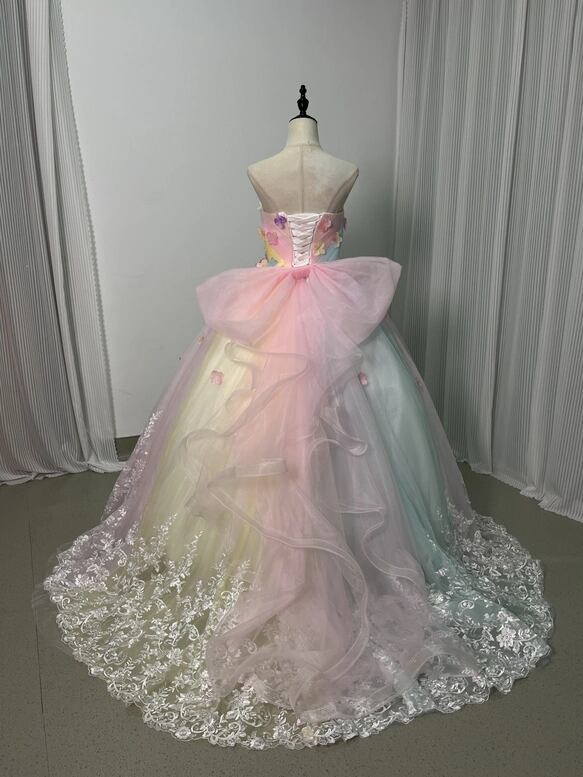 カラードレス レインボー ふっくら柔らかなバックリボン 裾に繊細レースをあしらった 花モチーフ 可愛い
