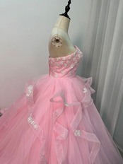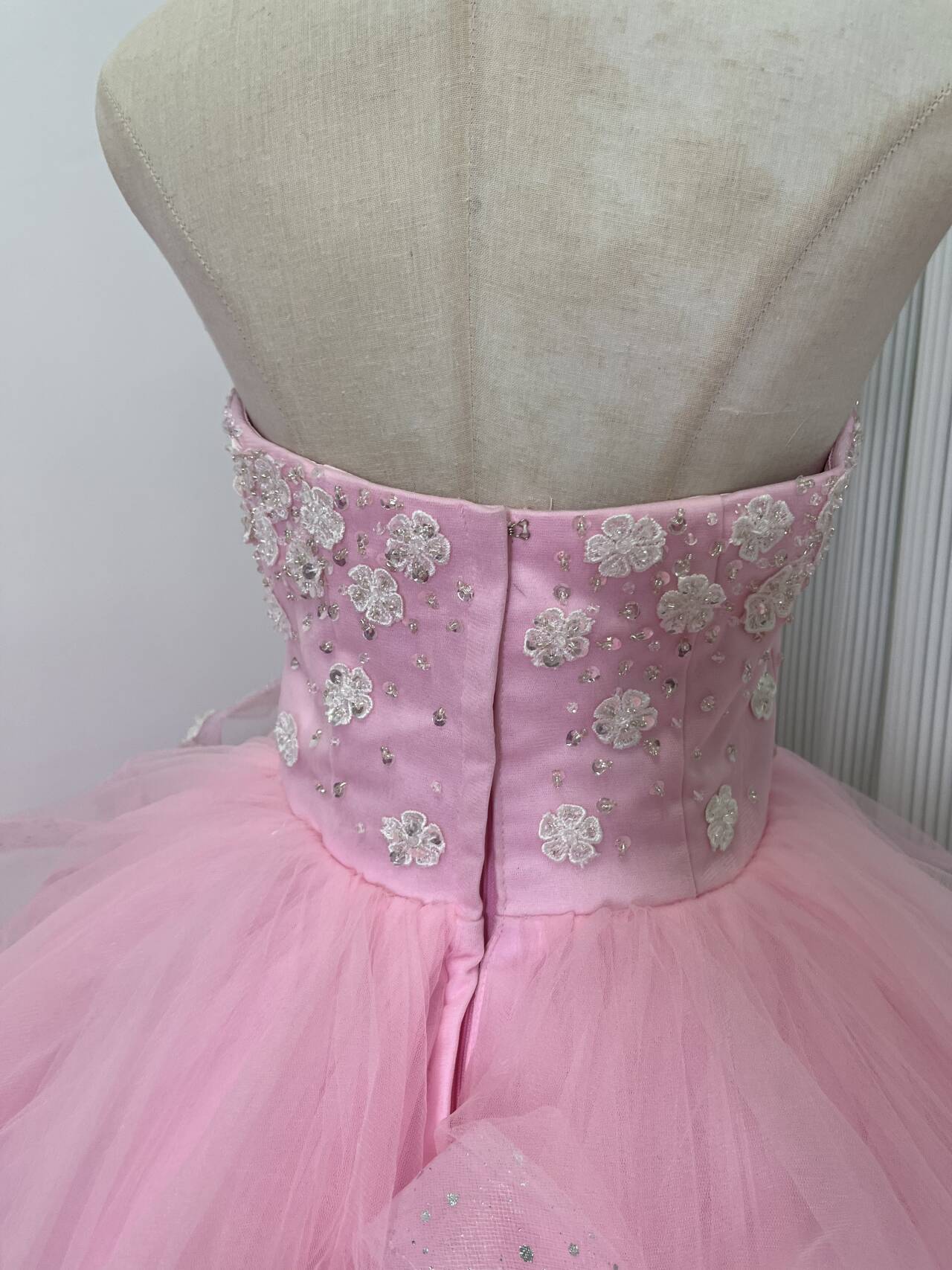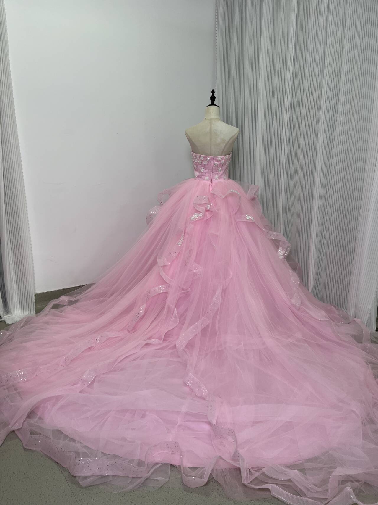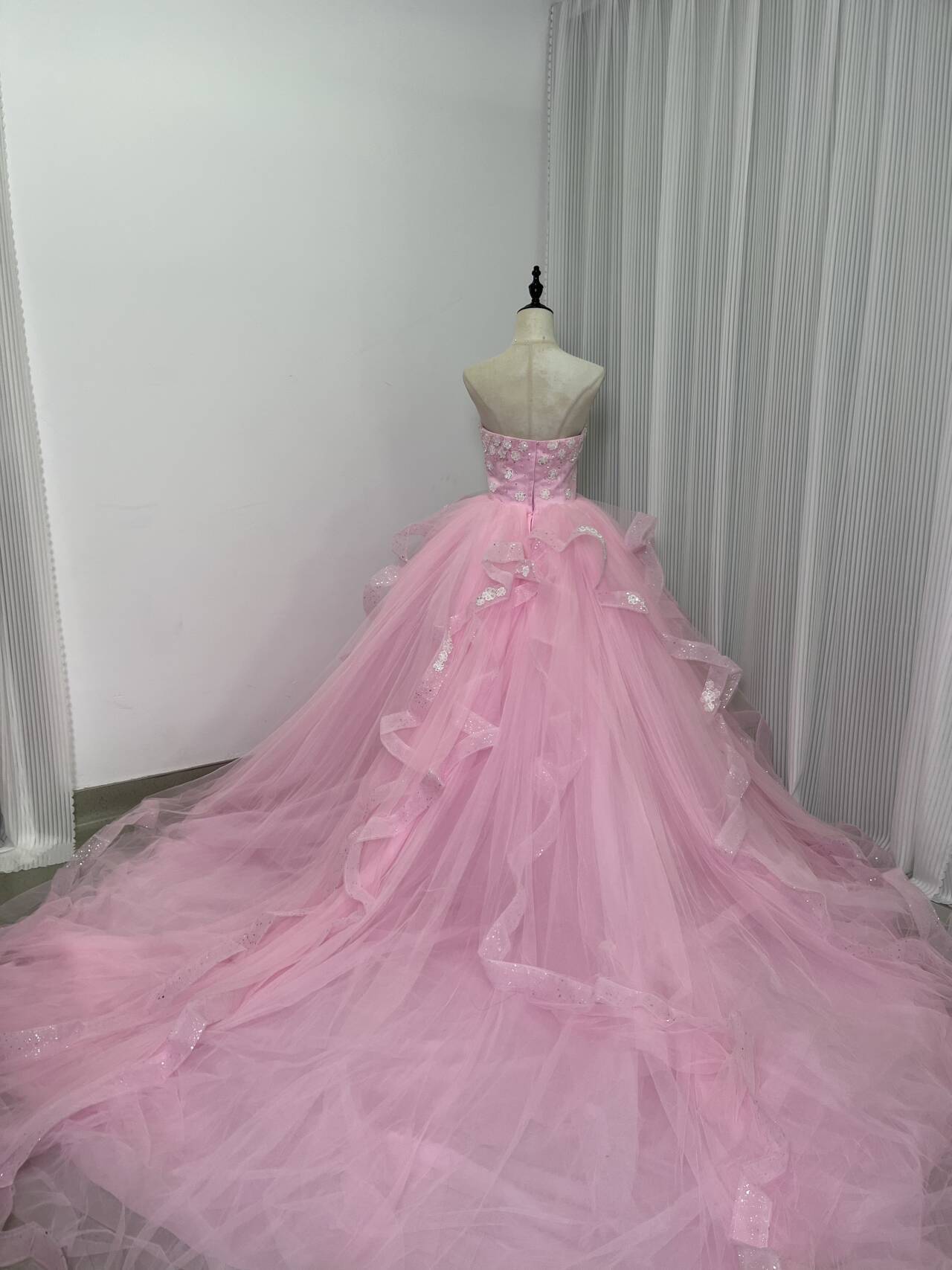 豪華! カラードレス キラキラのハンドビーディング ピンク ラッフルフリル プリンセスライン ロングトレーン