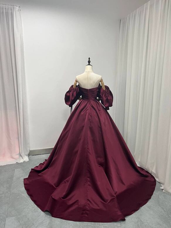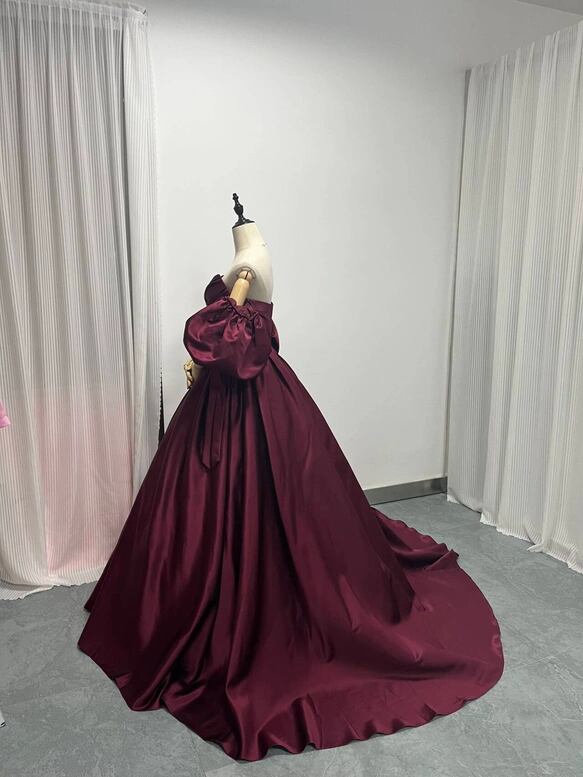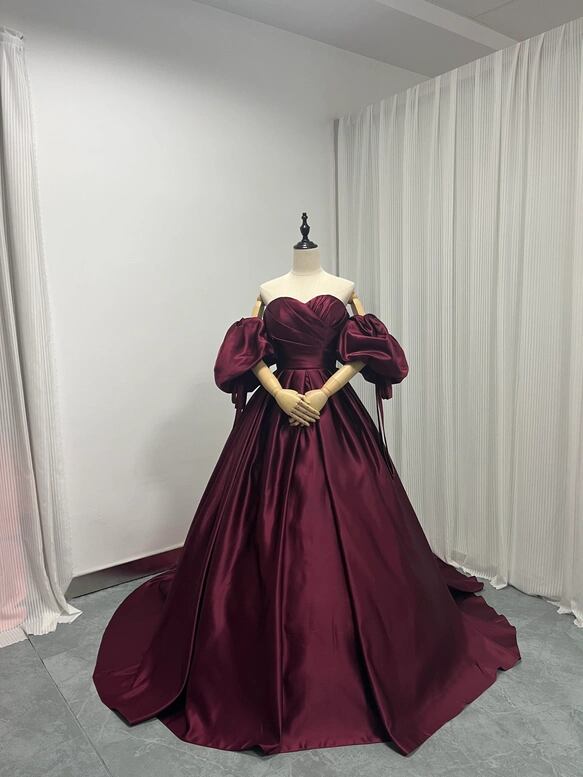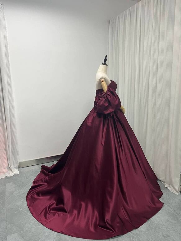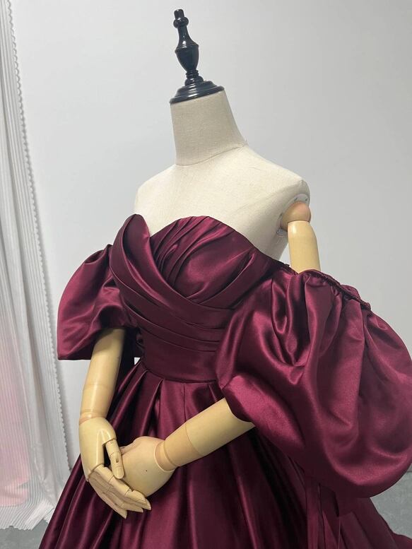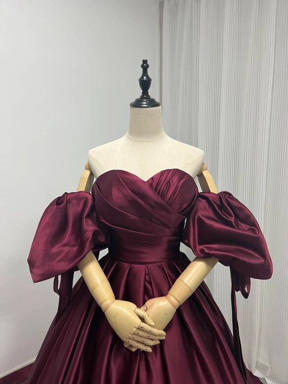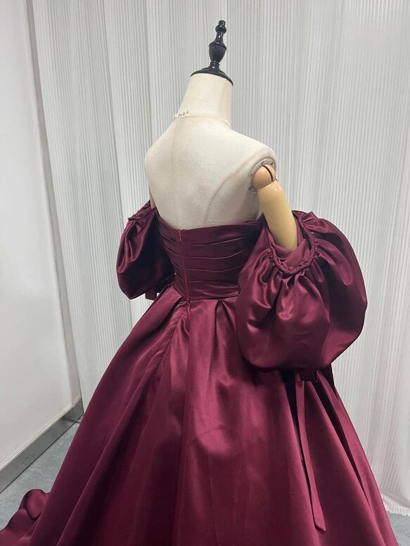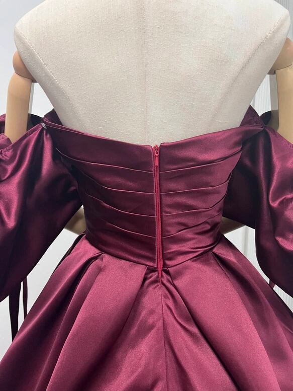 カラードレス 取り外し袖 ボルドー色 ファスナー 光沢サテン プリンセスライン 結婚式 前撮り