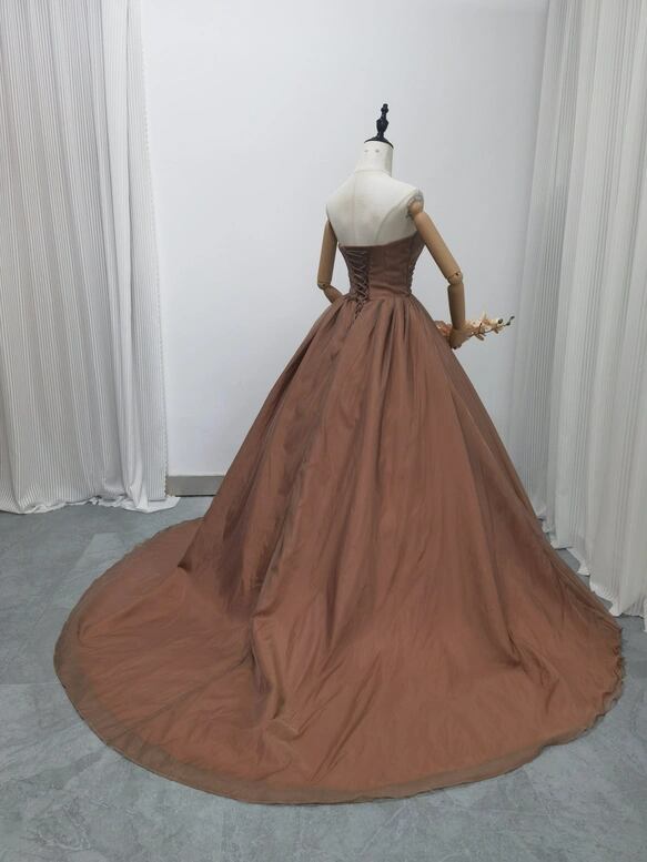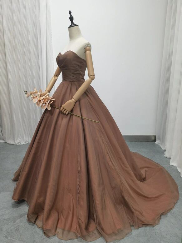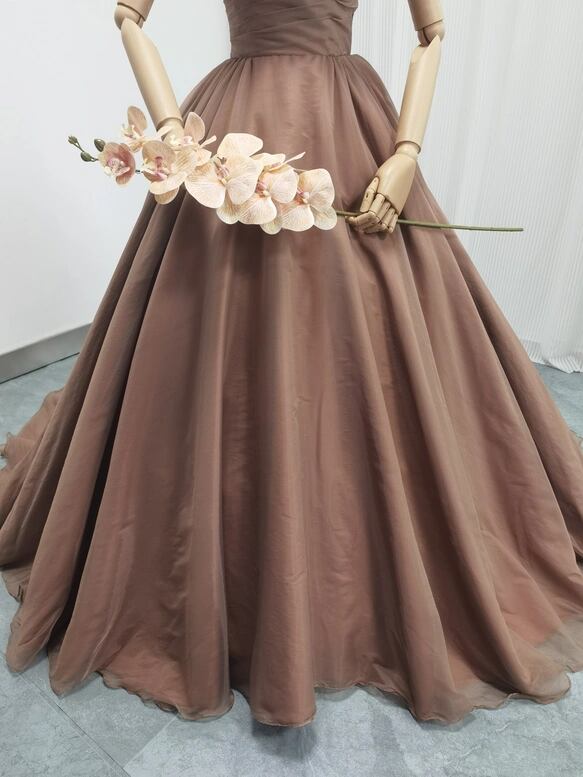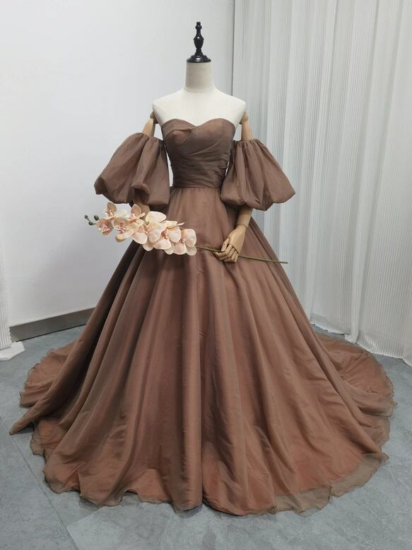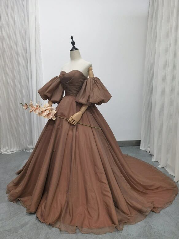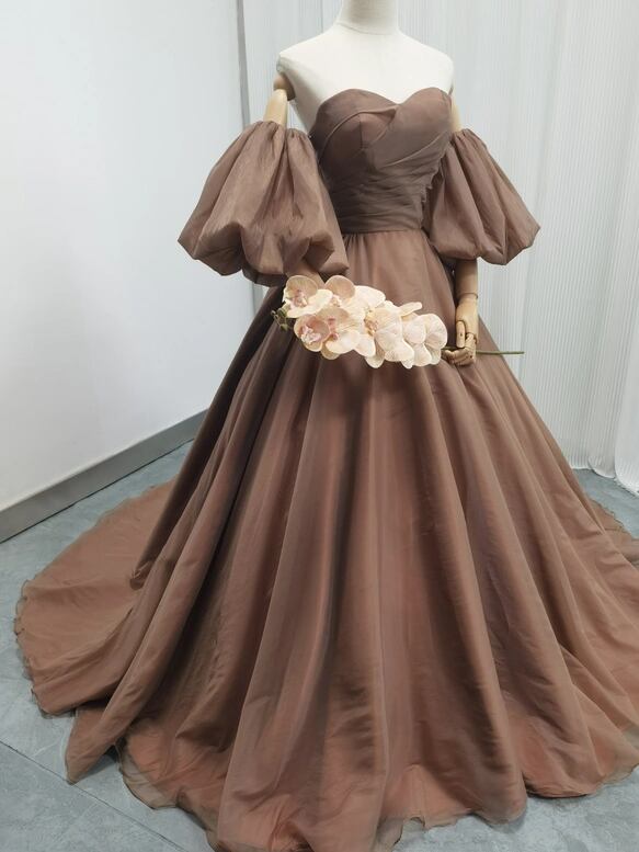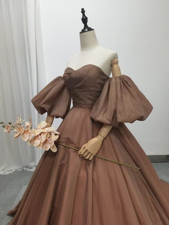 人気上昇!カラードレス 取り外し袖 パフスリーブ テラコッタ色 披露宴/結婚式 大人っぽい