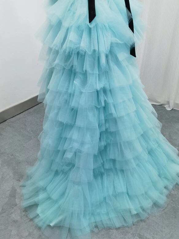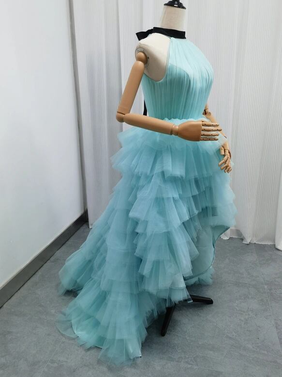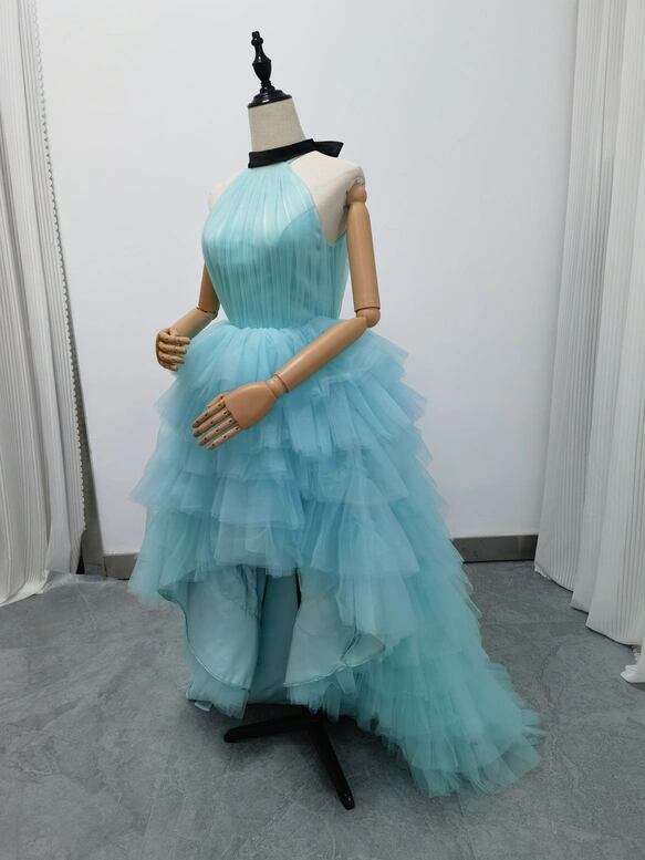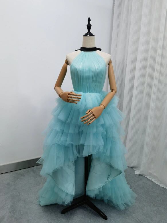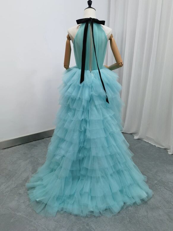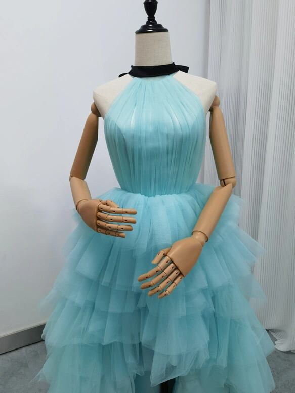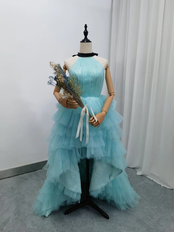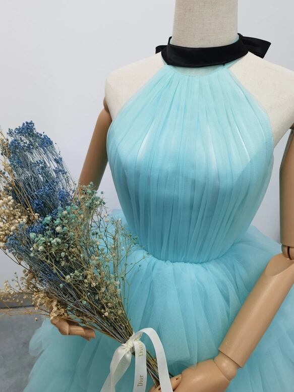 カラードレス 薄青 ホルターネック 柔らかく重ねたチュールスカート フィッシュテール デザイン感 結婚式