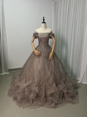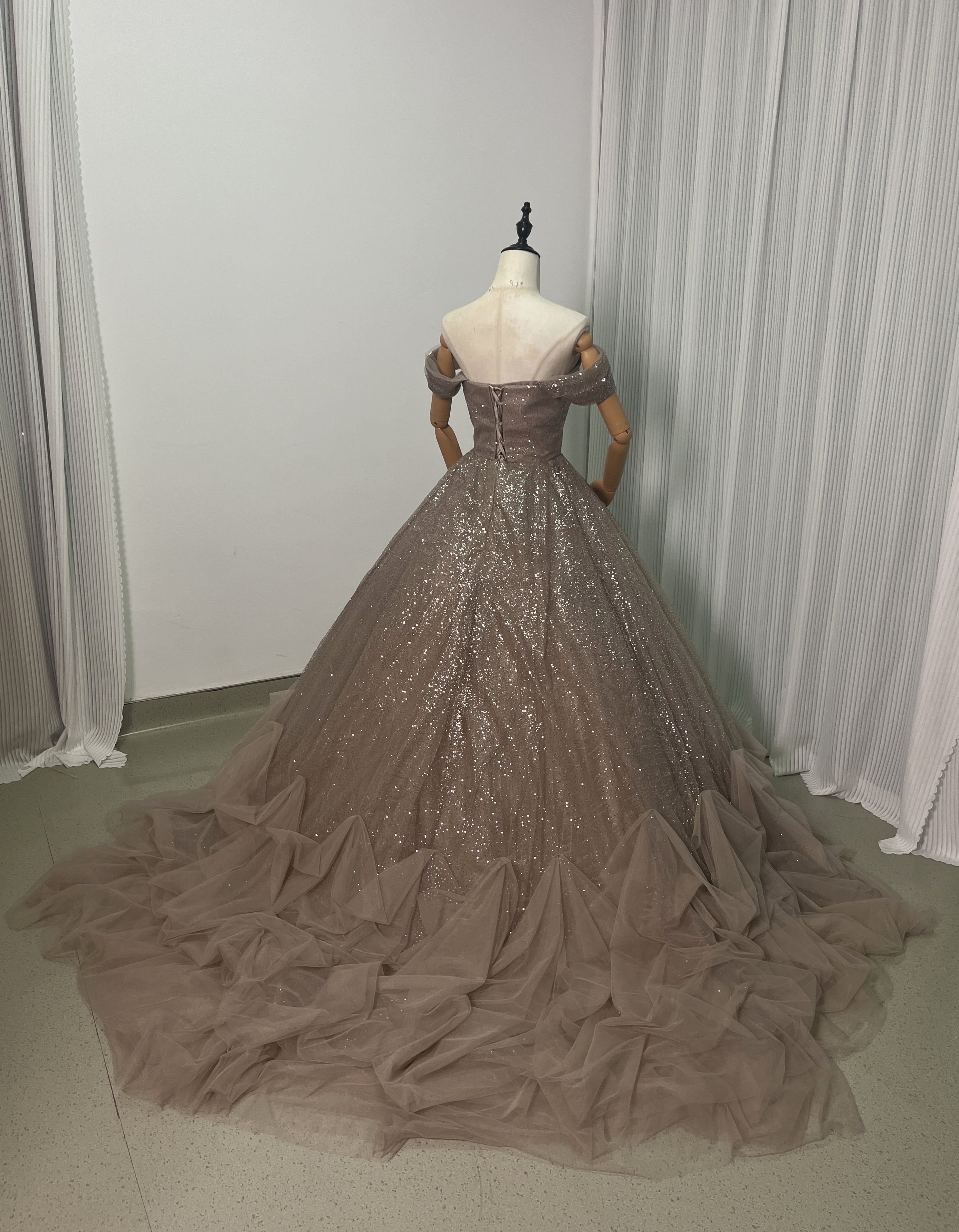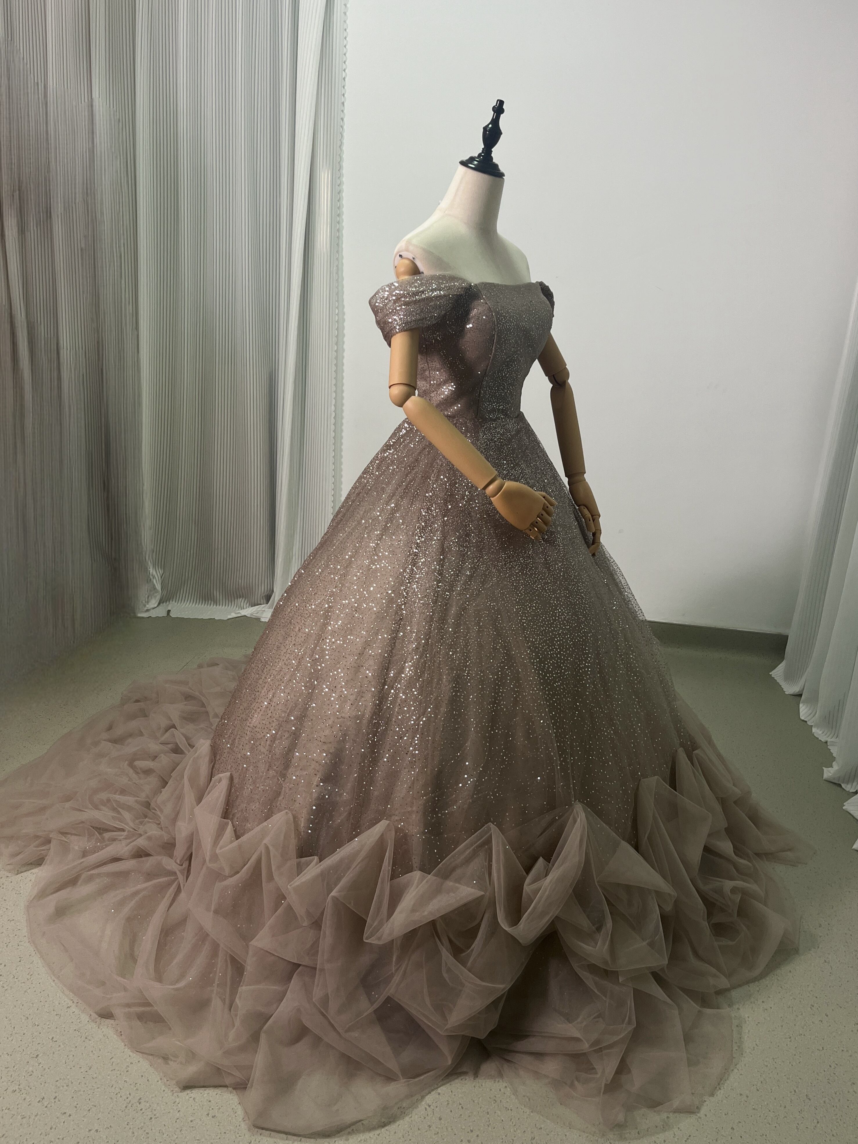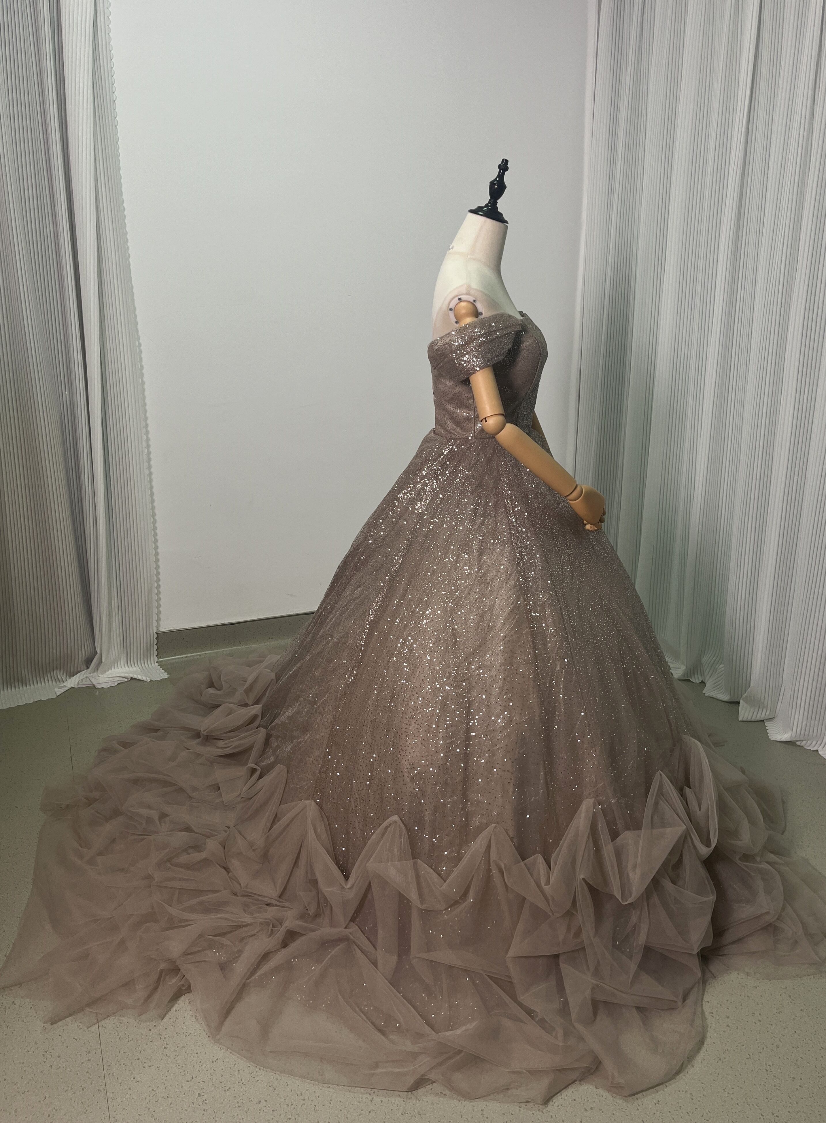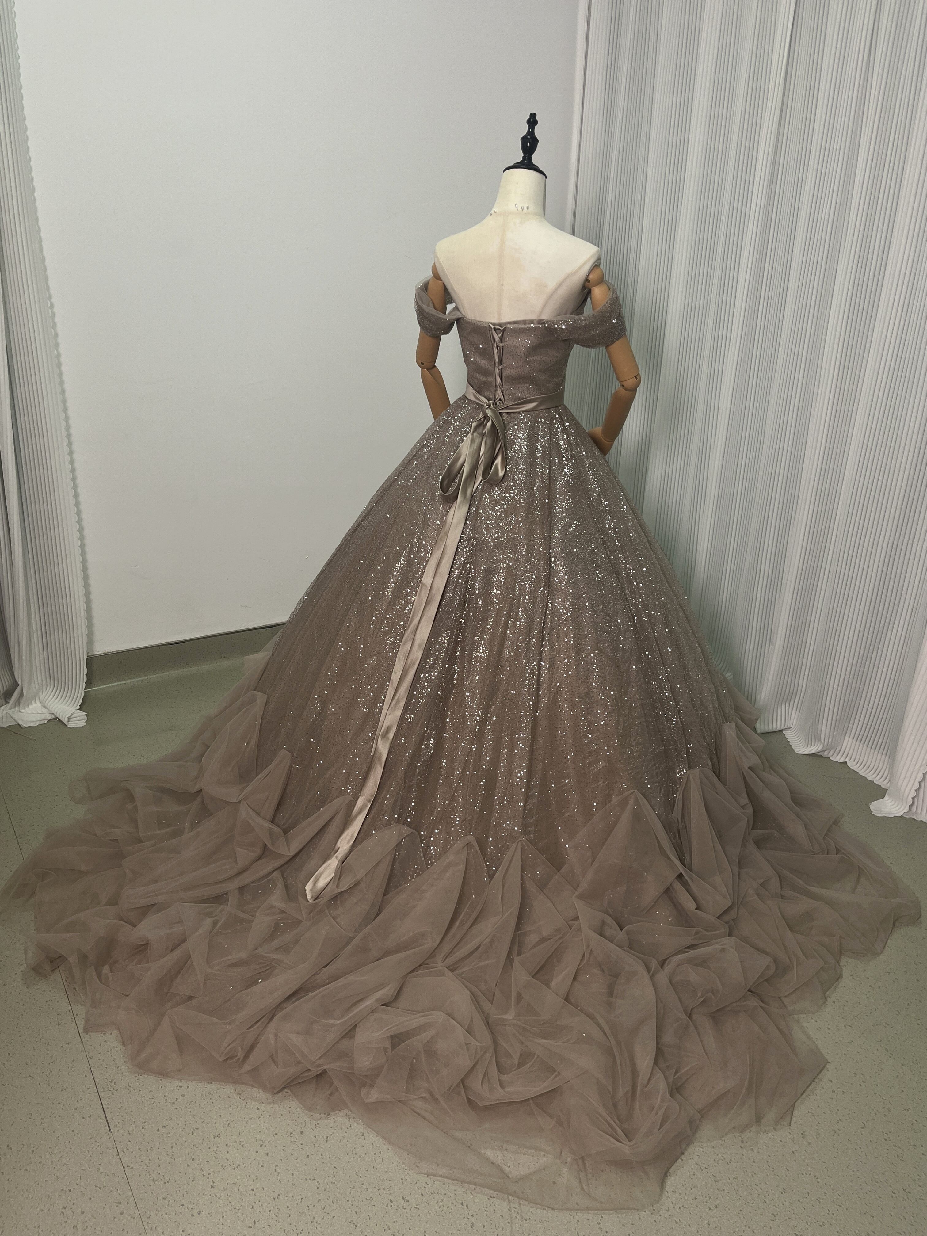 カラードレス シャンパン色 オフショルダー 華やかなトレーン 可愛い 編み上げ ブライダル