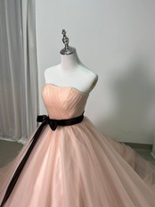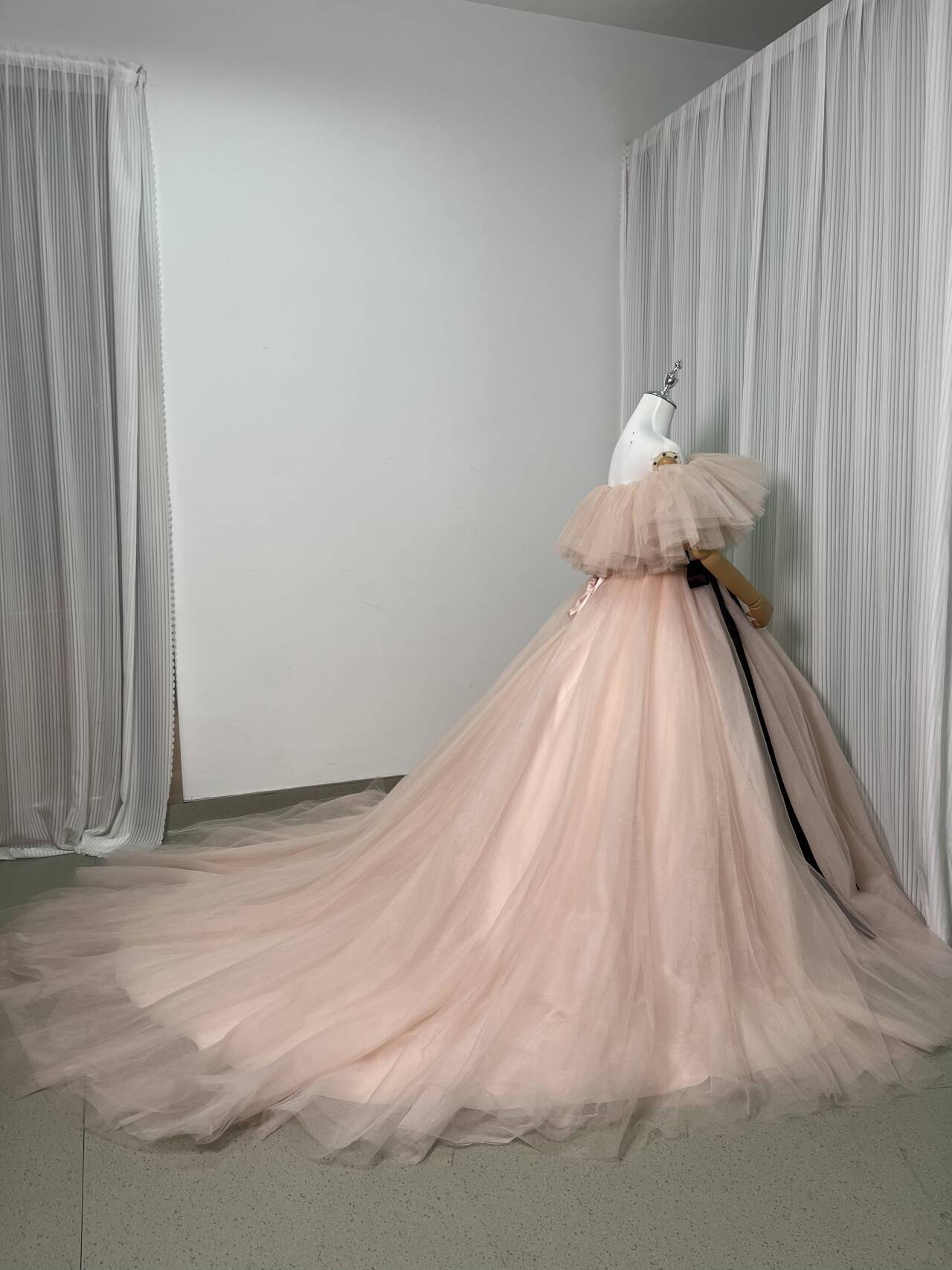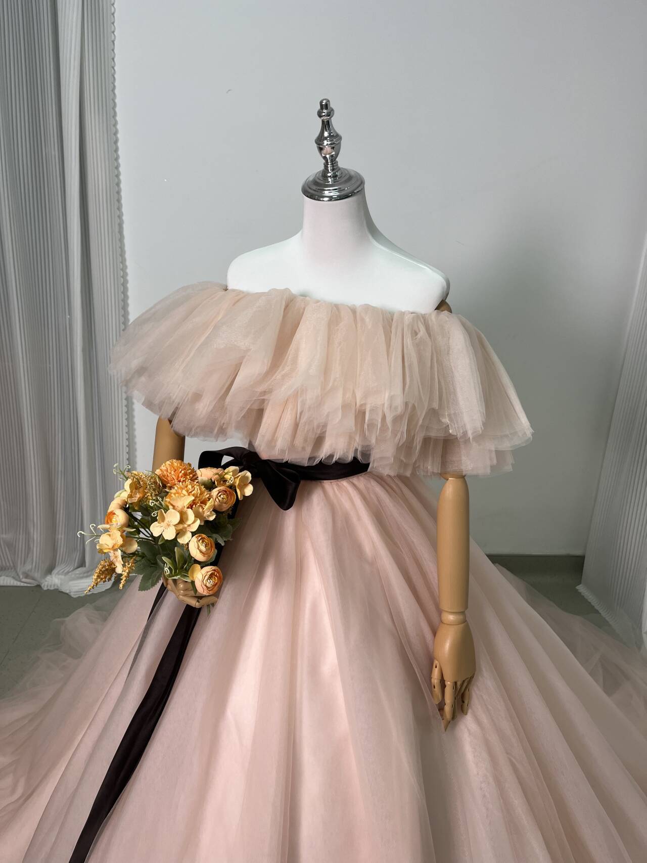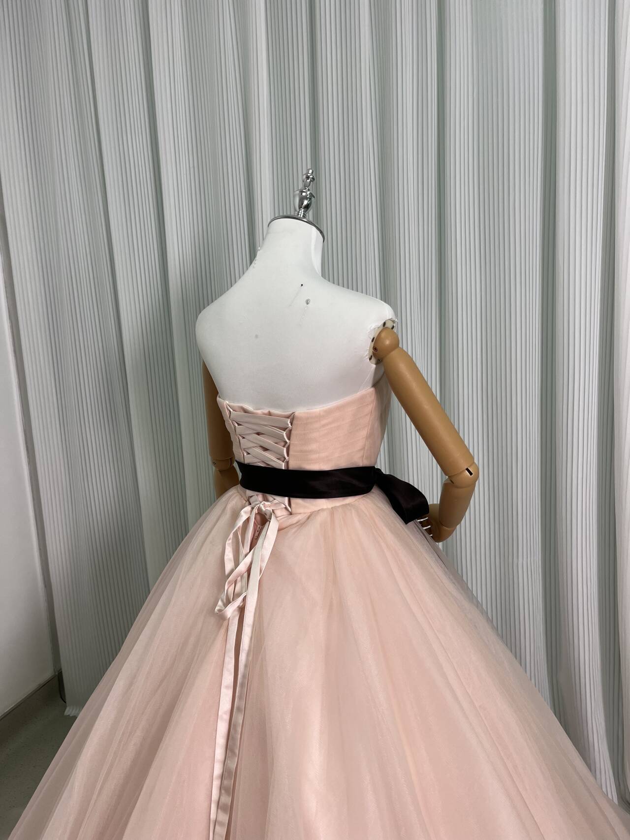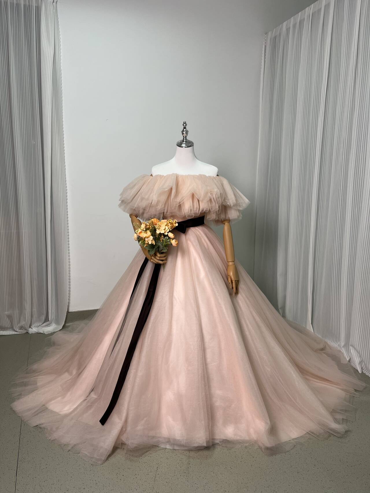ウェディングドレス ピンク 取り外しオフショルダー サッシュベルト 柔らかく重ねたチュールスカート 結婚式