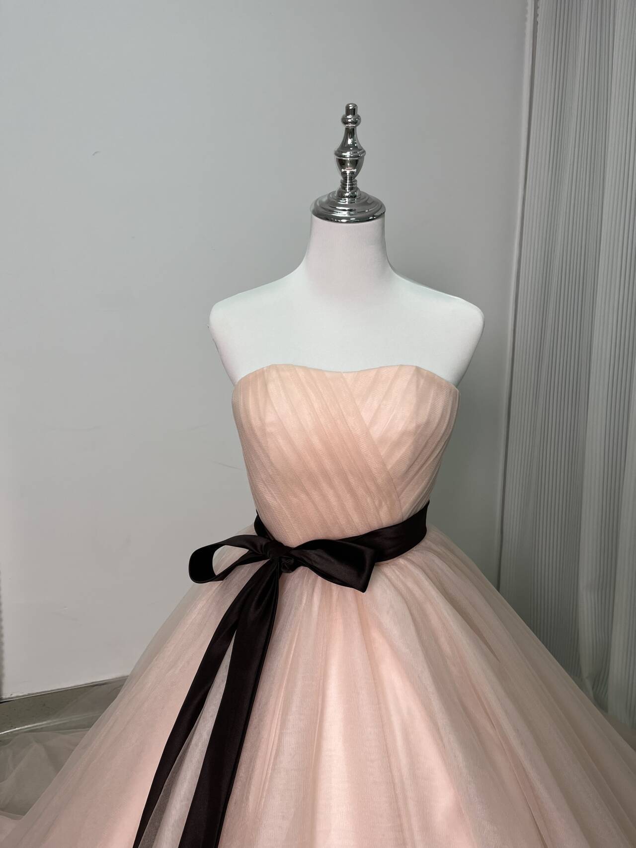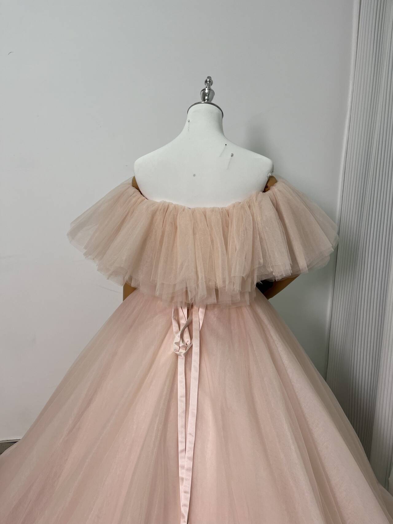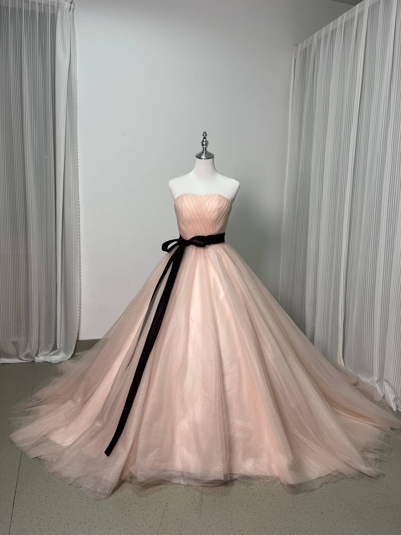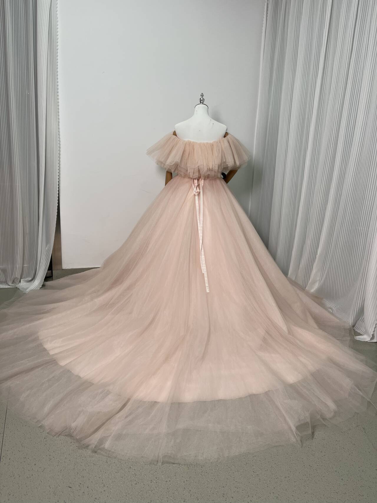 ウェディングドレス ピンク 取り外しオフショルダー サッシュベルト 柔らかく重ねたチュールスカート 結婚式