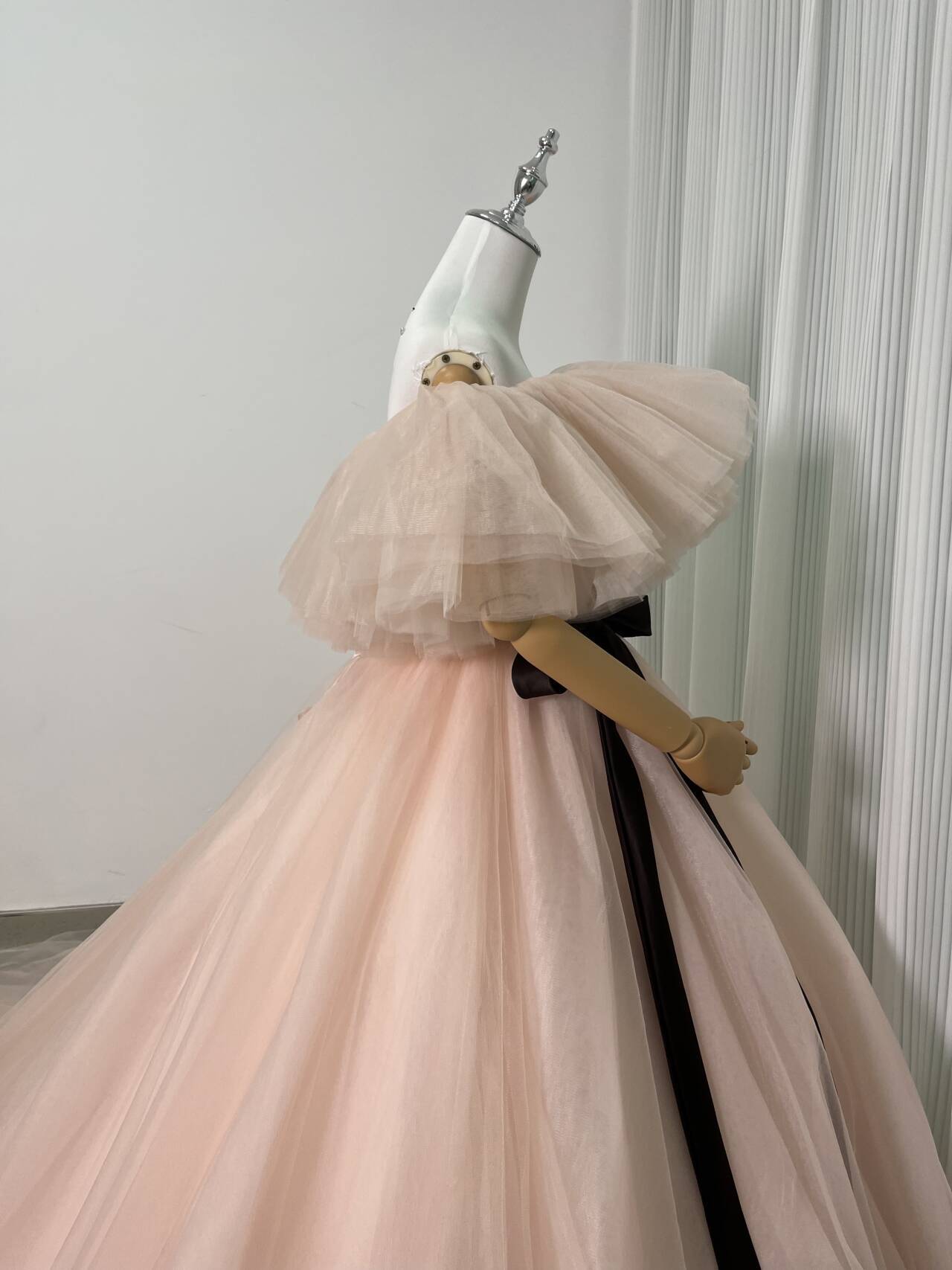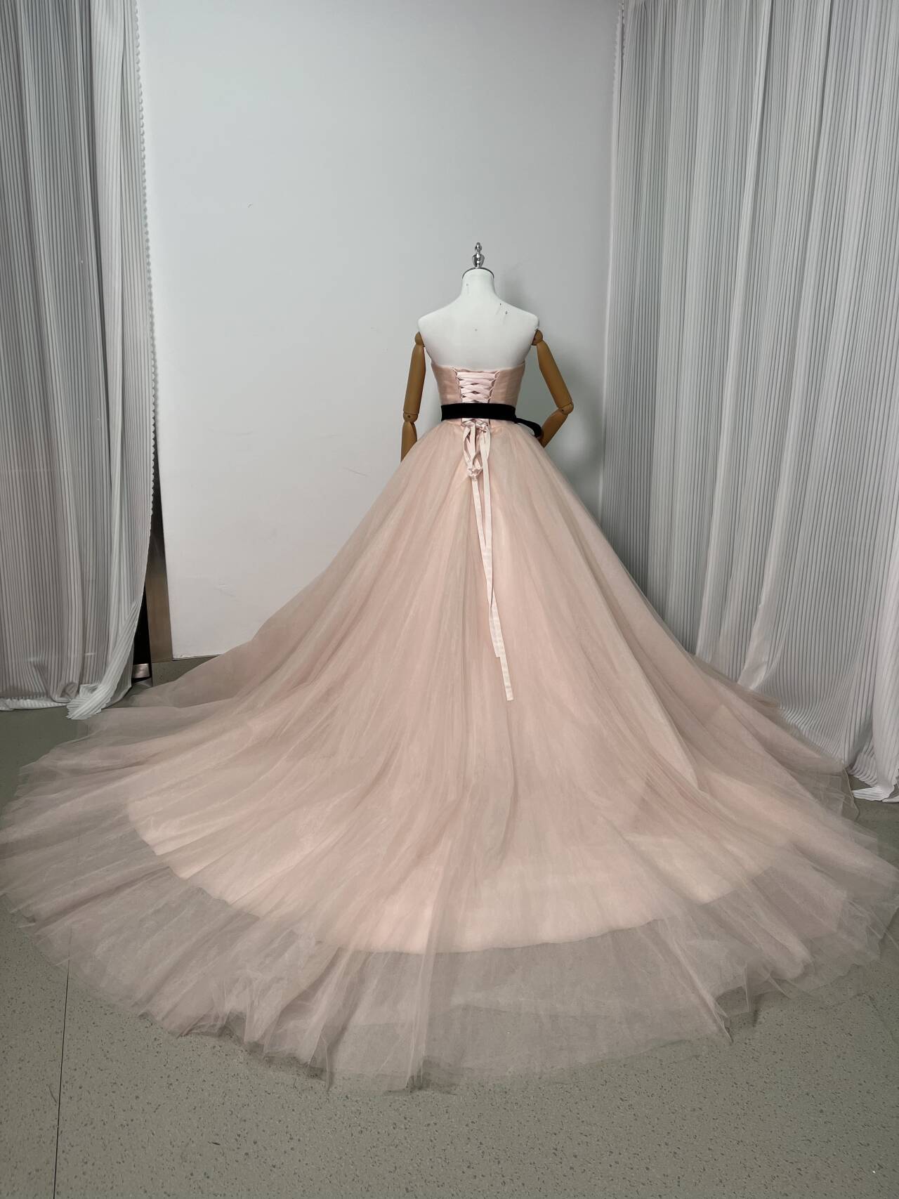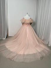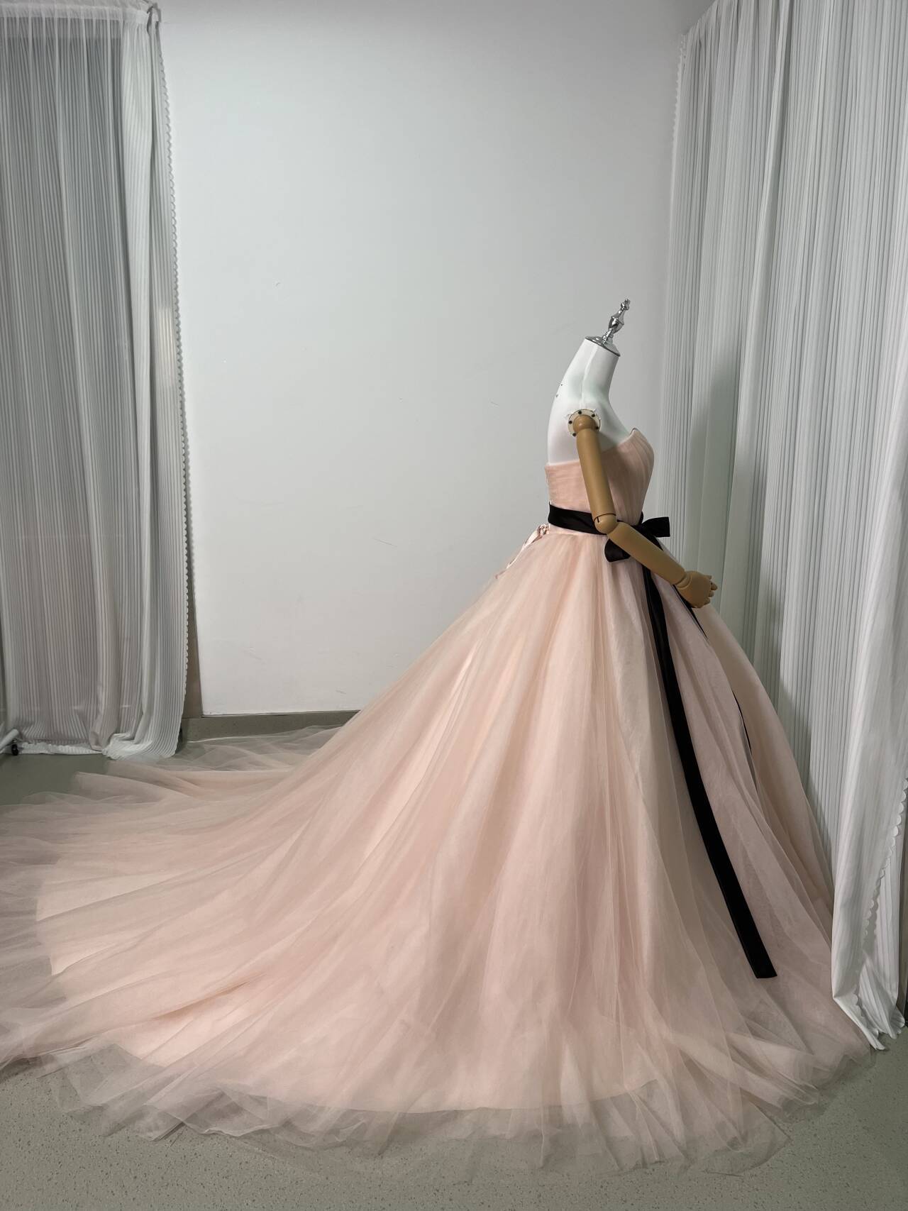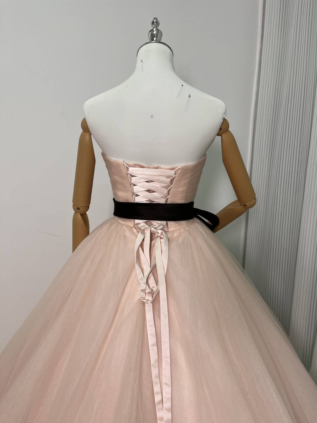ウェディングドレス ピンク 取り外しオフショルダー サッシュベルト 柔らかく重ねたチュールスカート 結婚式