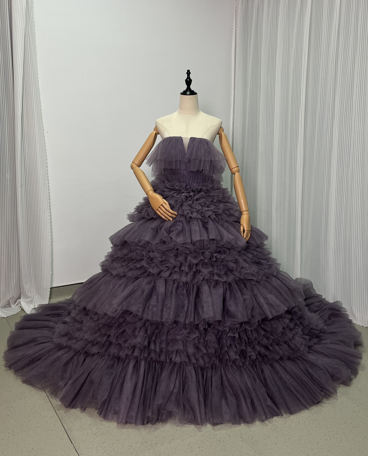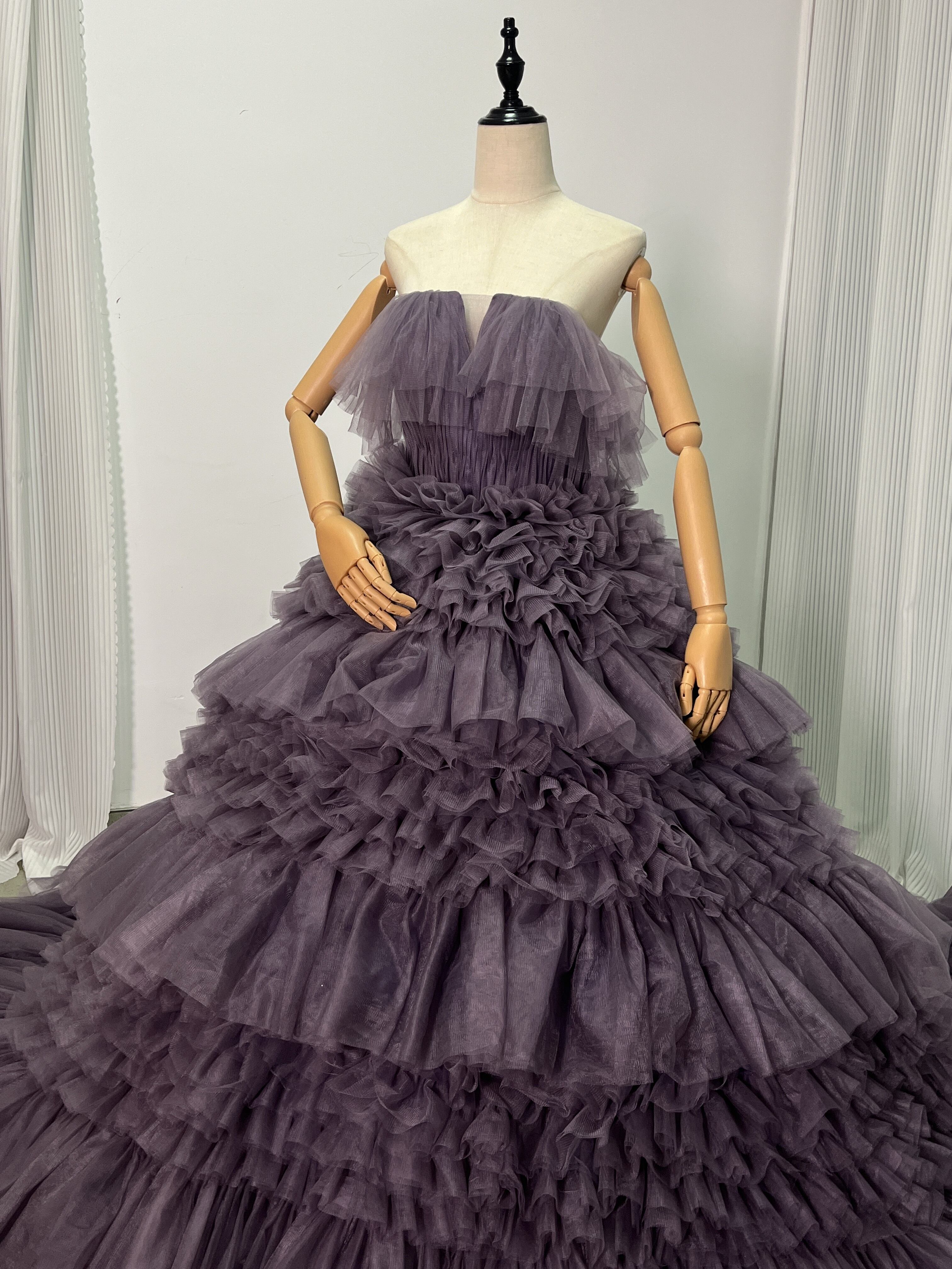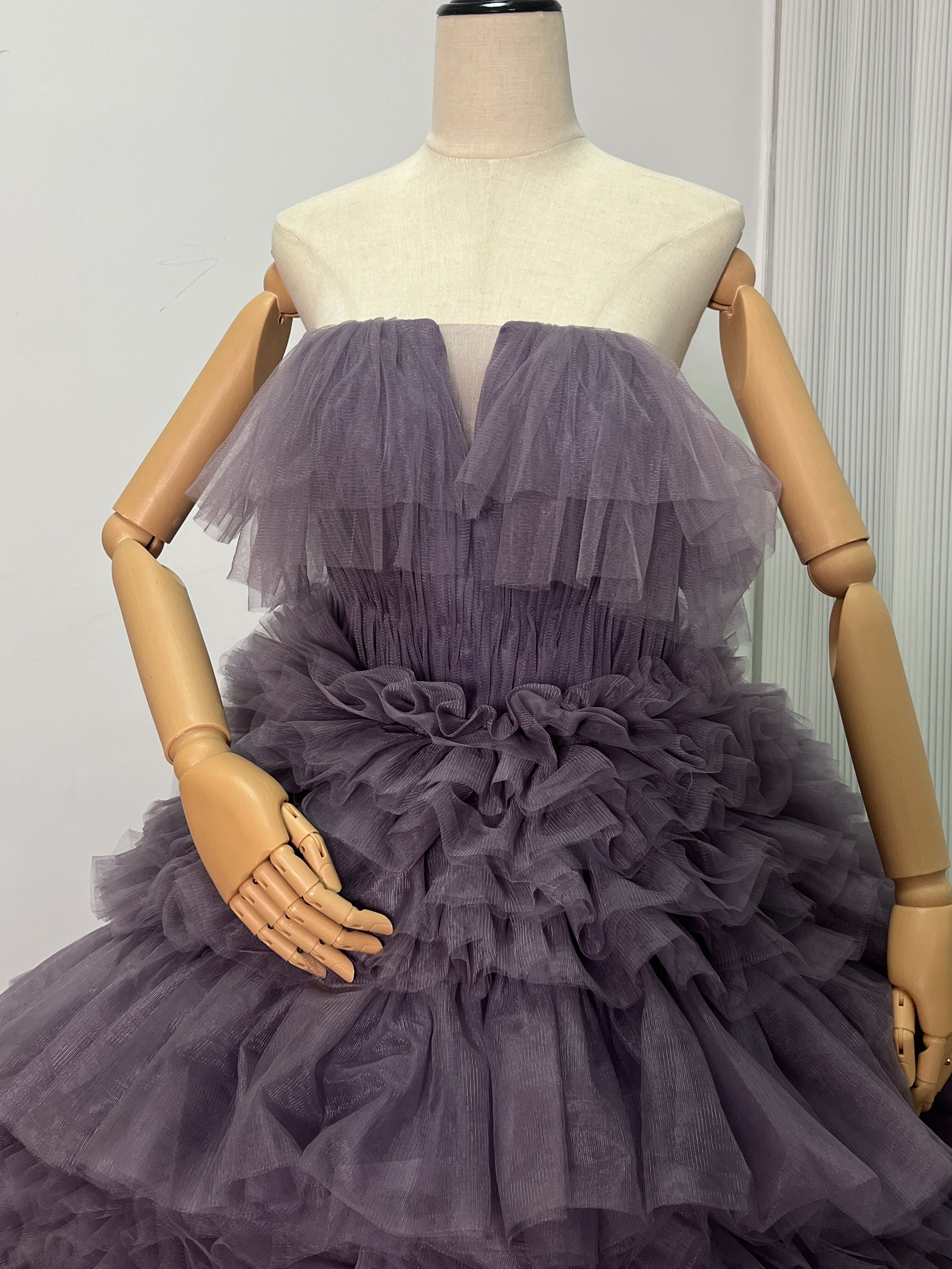 豪華!カラードレス ボリュームドレス ソフトチュール パープル ベアトップ 前撮り 結婚式
