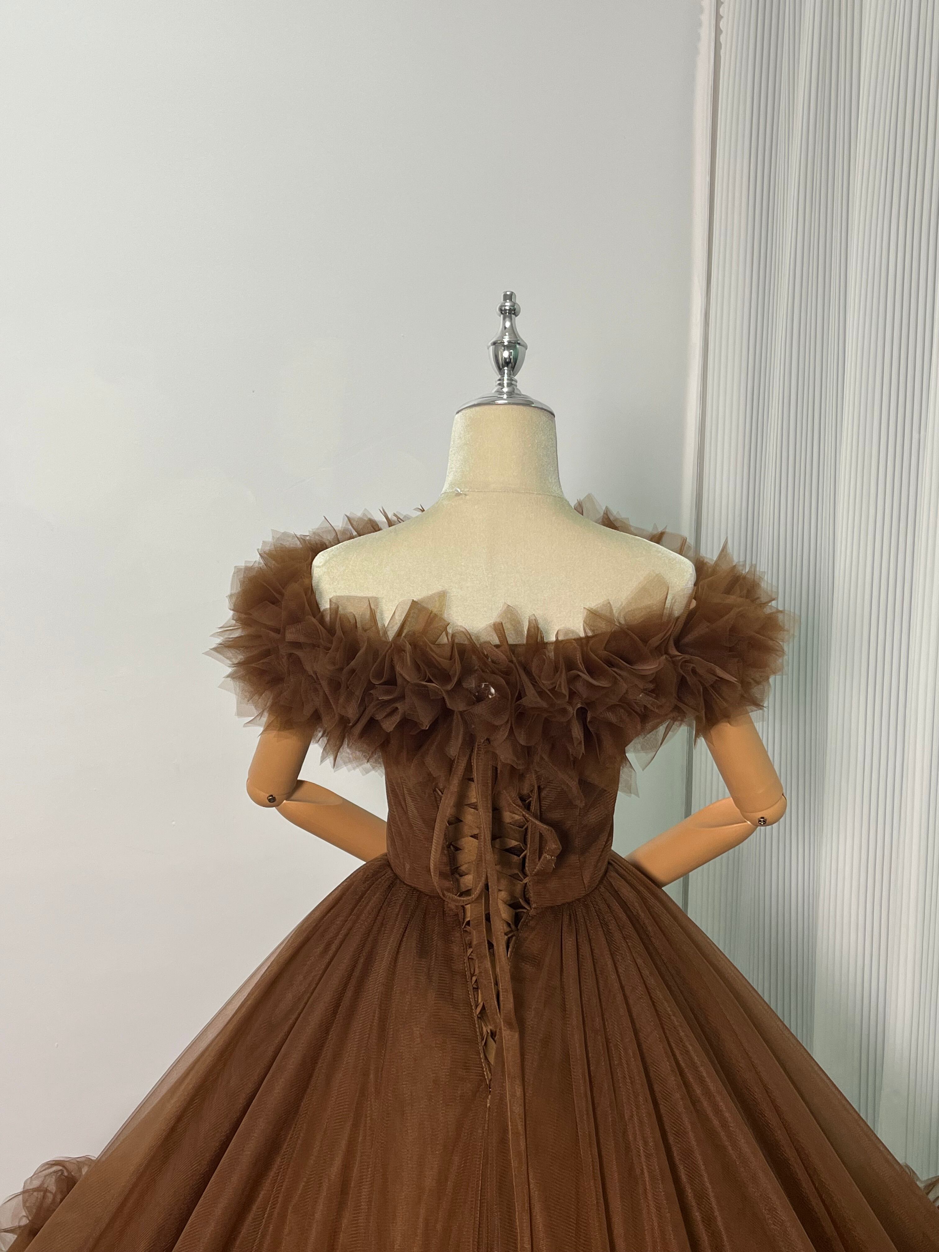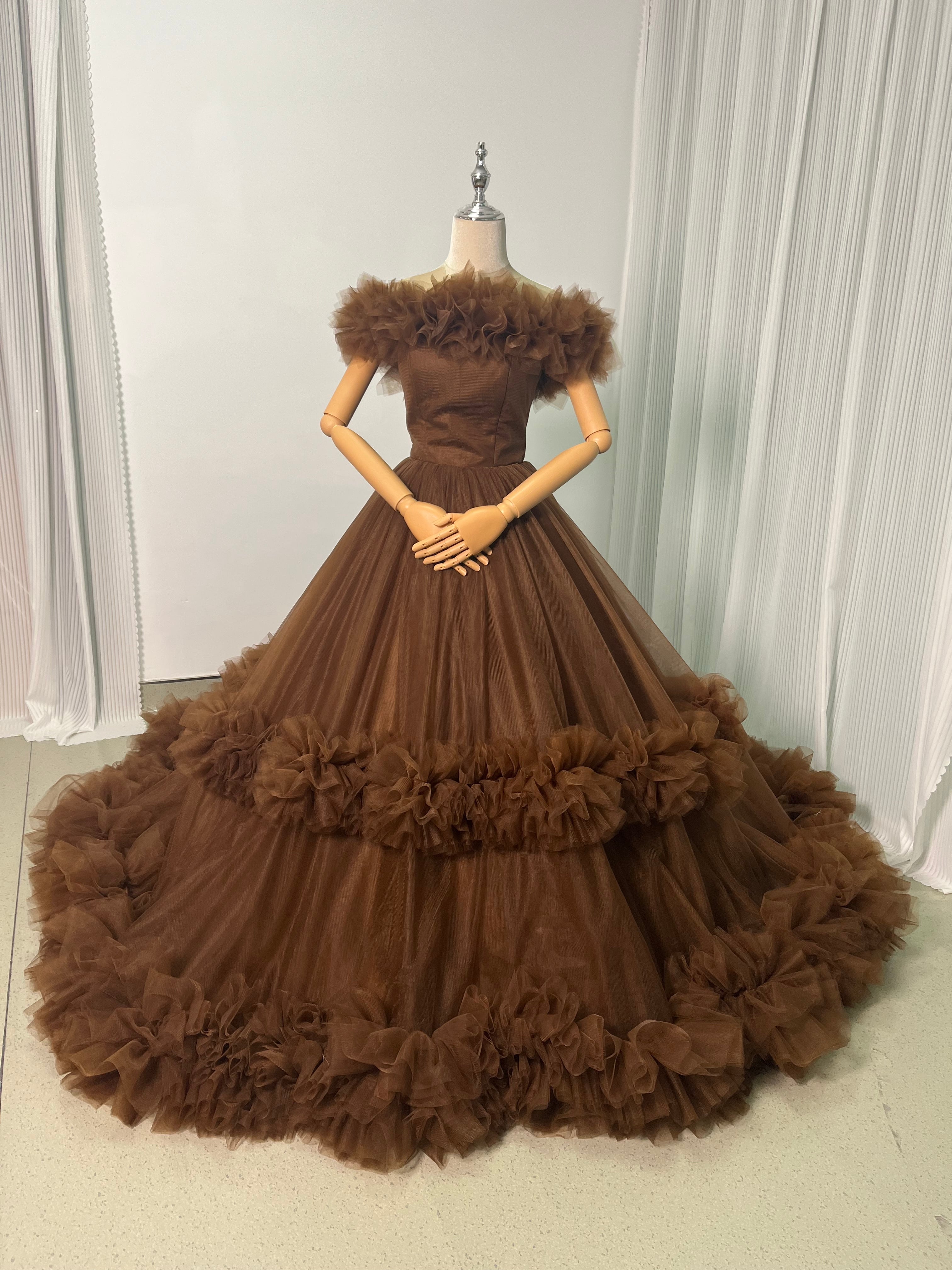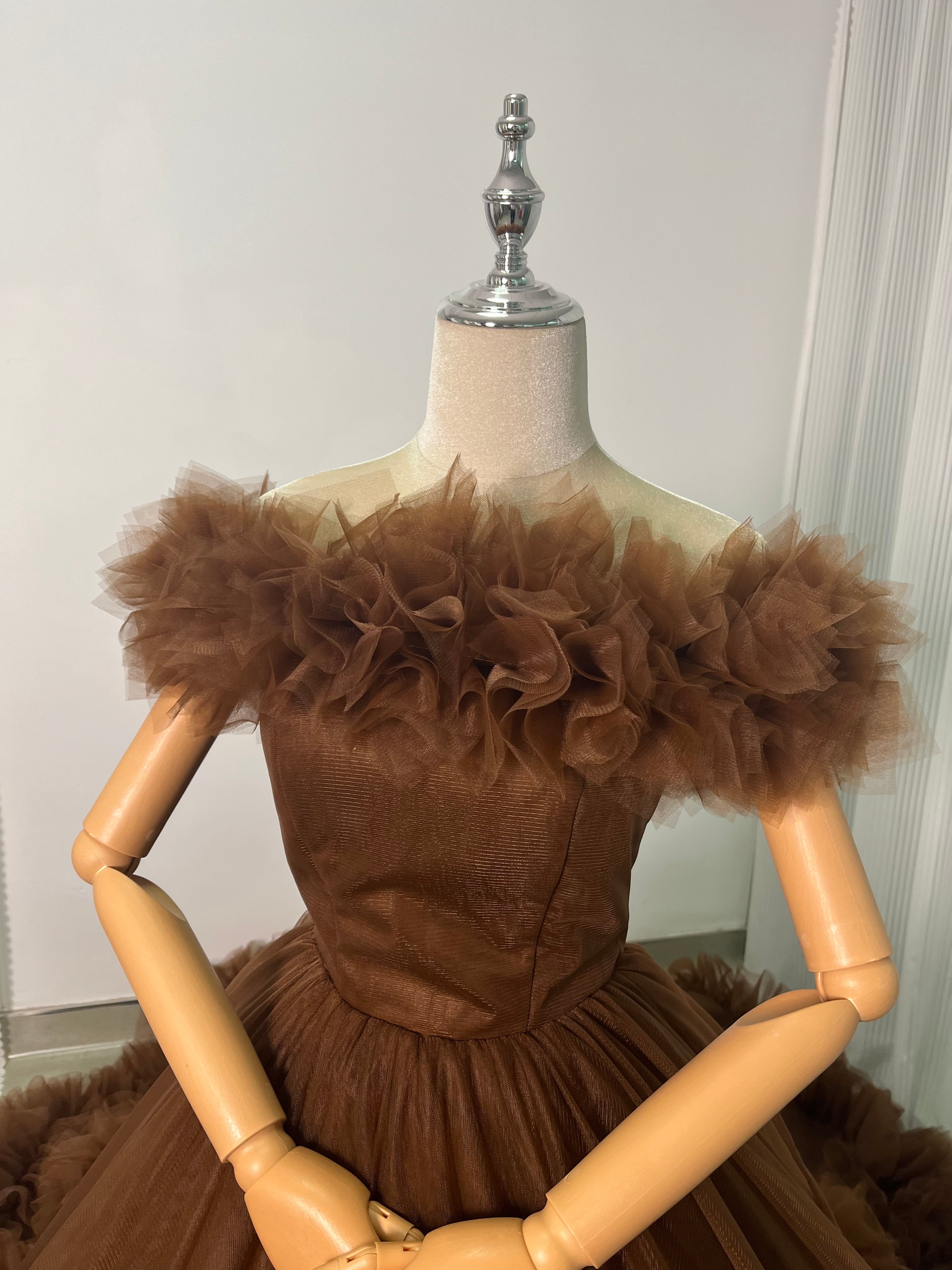 豪華! カラードレス コーヒーの色 取り外しオフショルダー ラッフルフリル フレアスカート エレガント