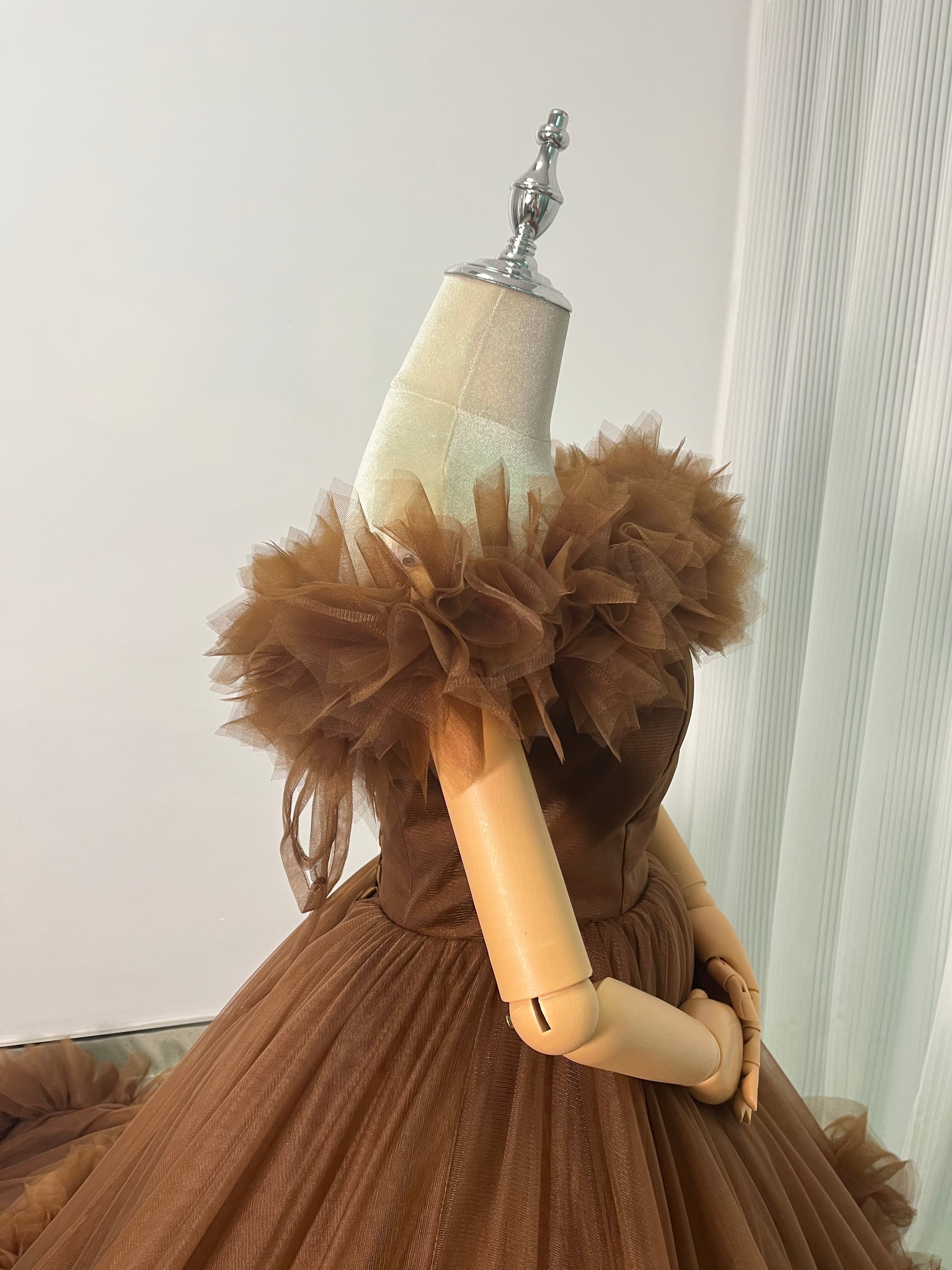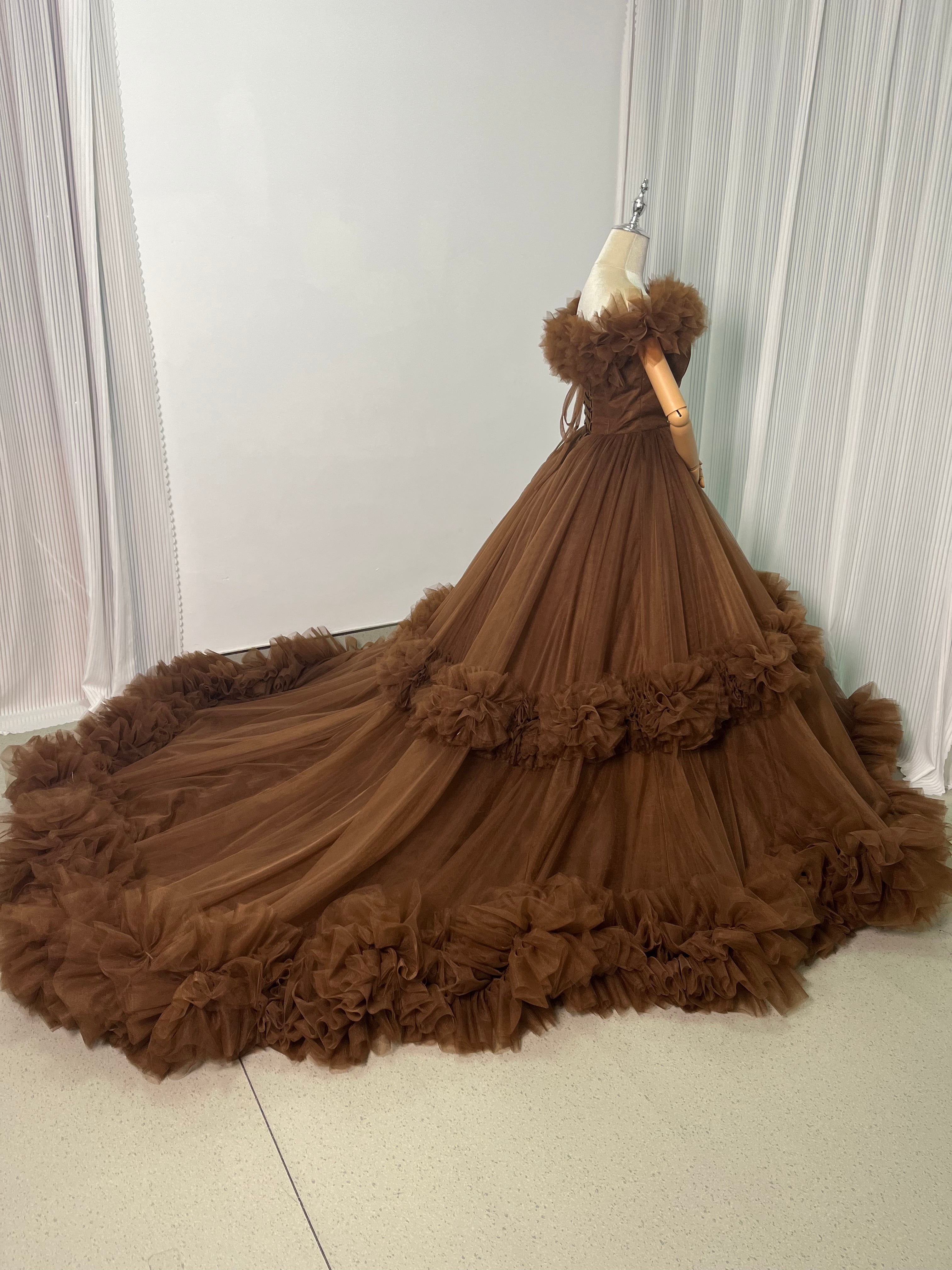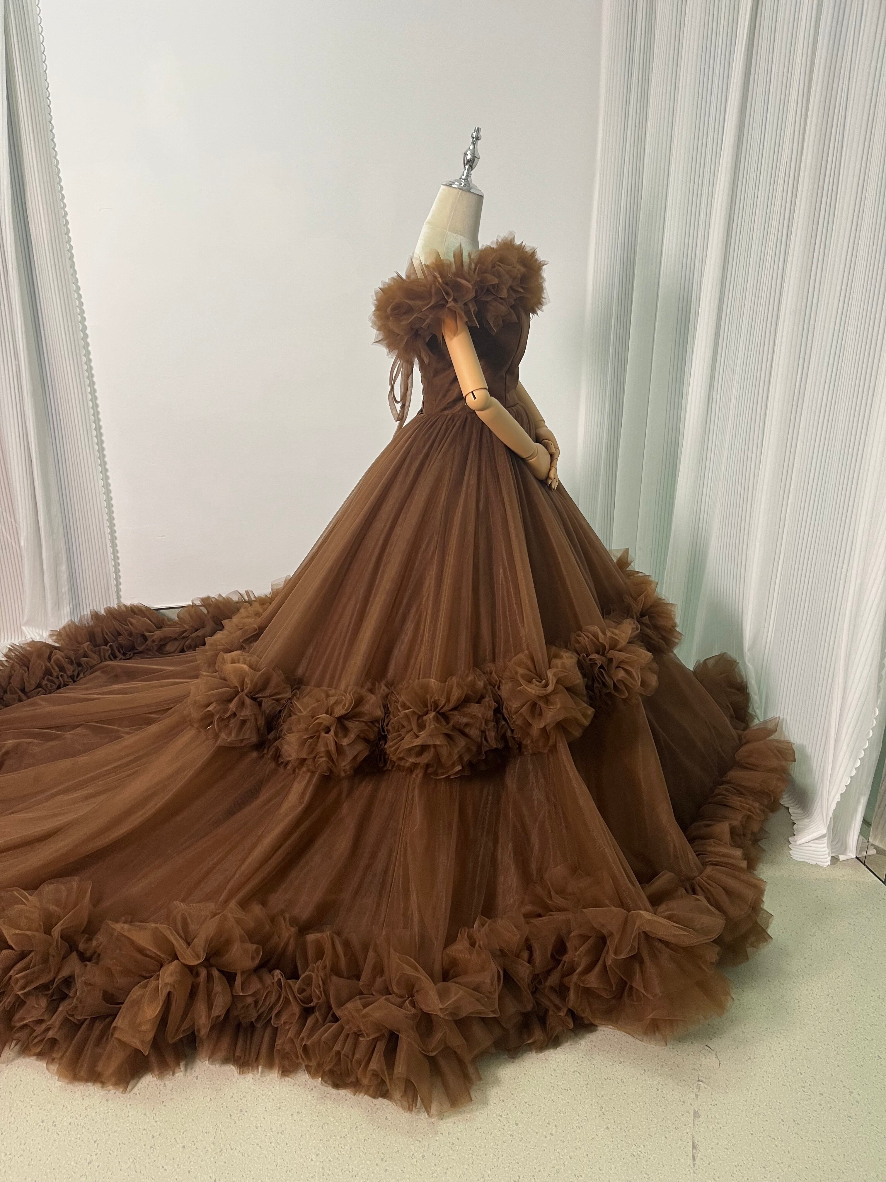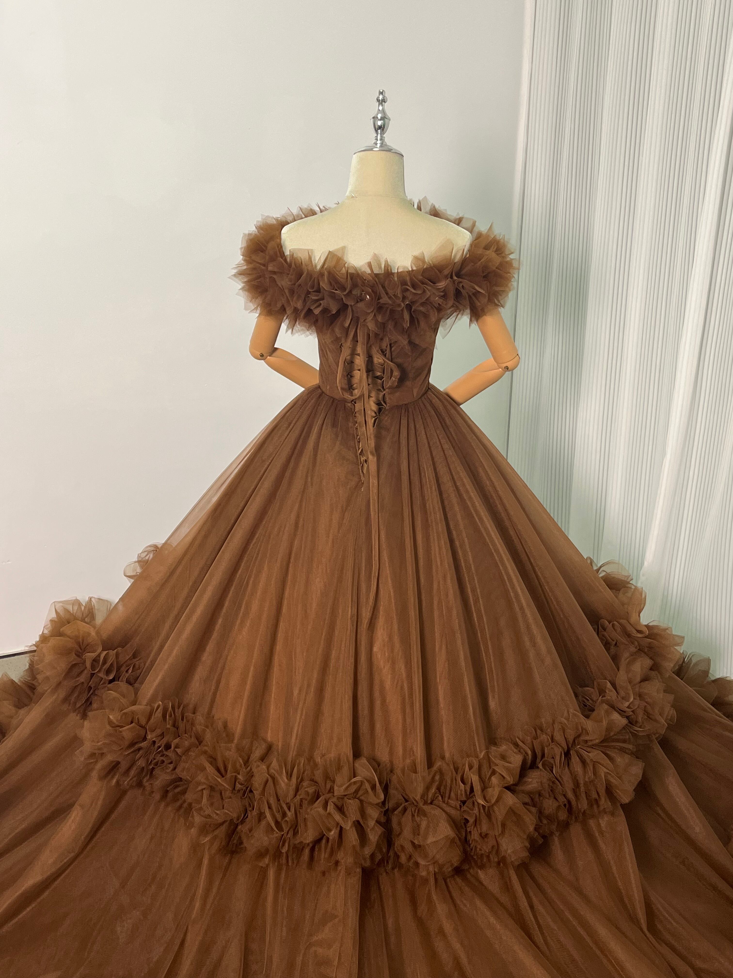 豪華! カラードレス コーヒーの色 取り外しオフショルダー ラッフルフリル フレアスカート エレガント