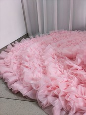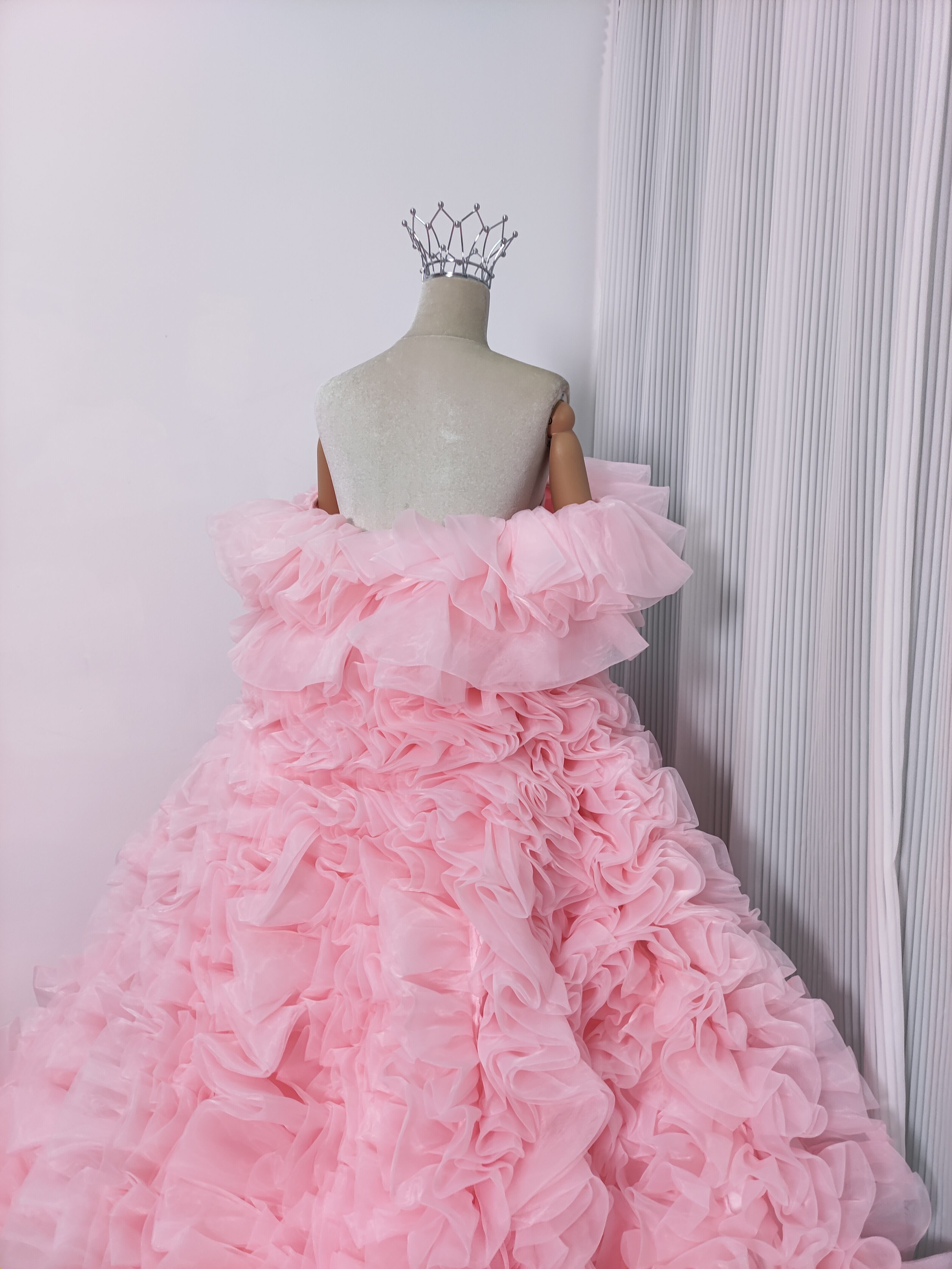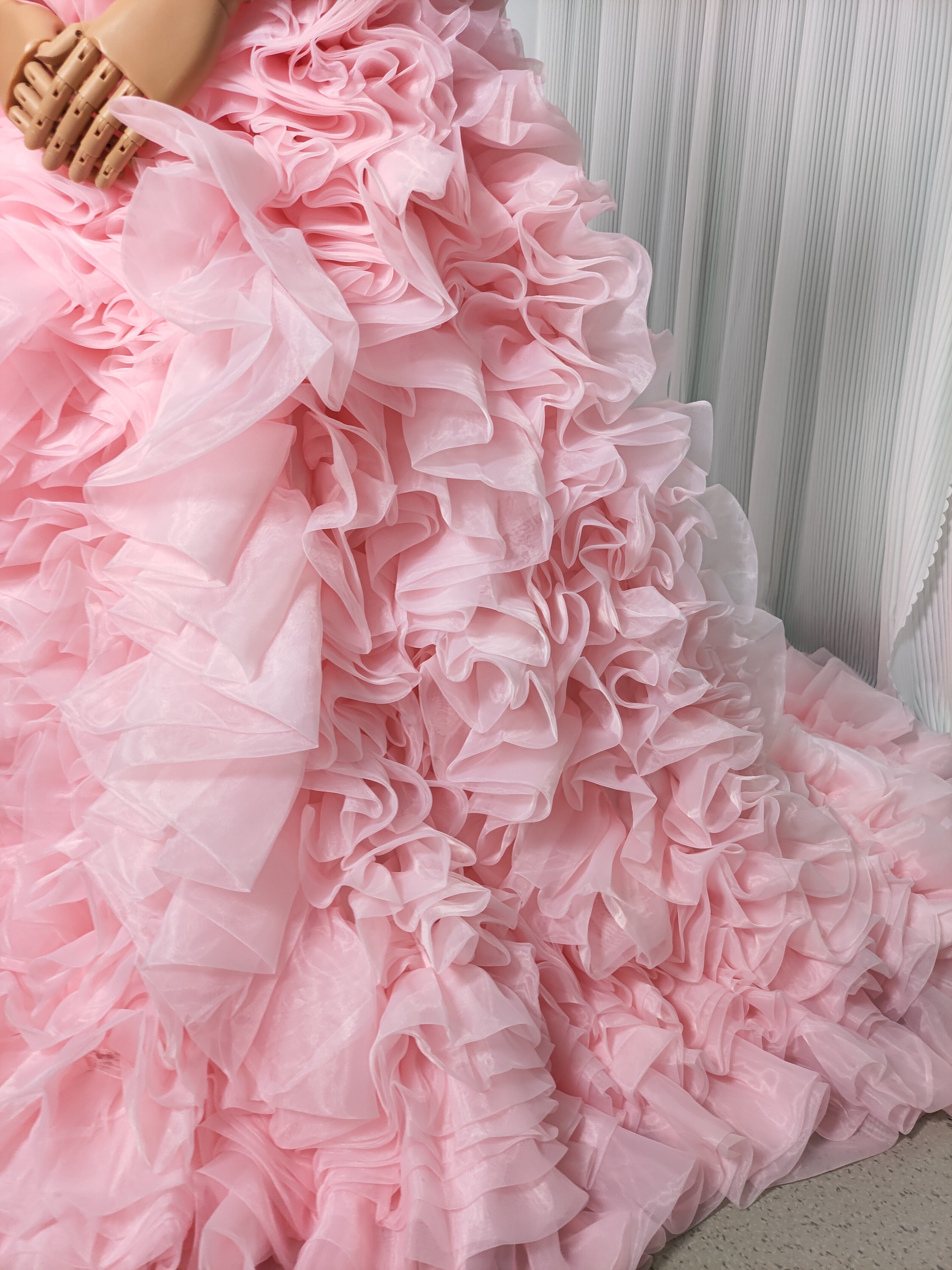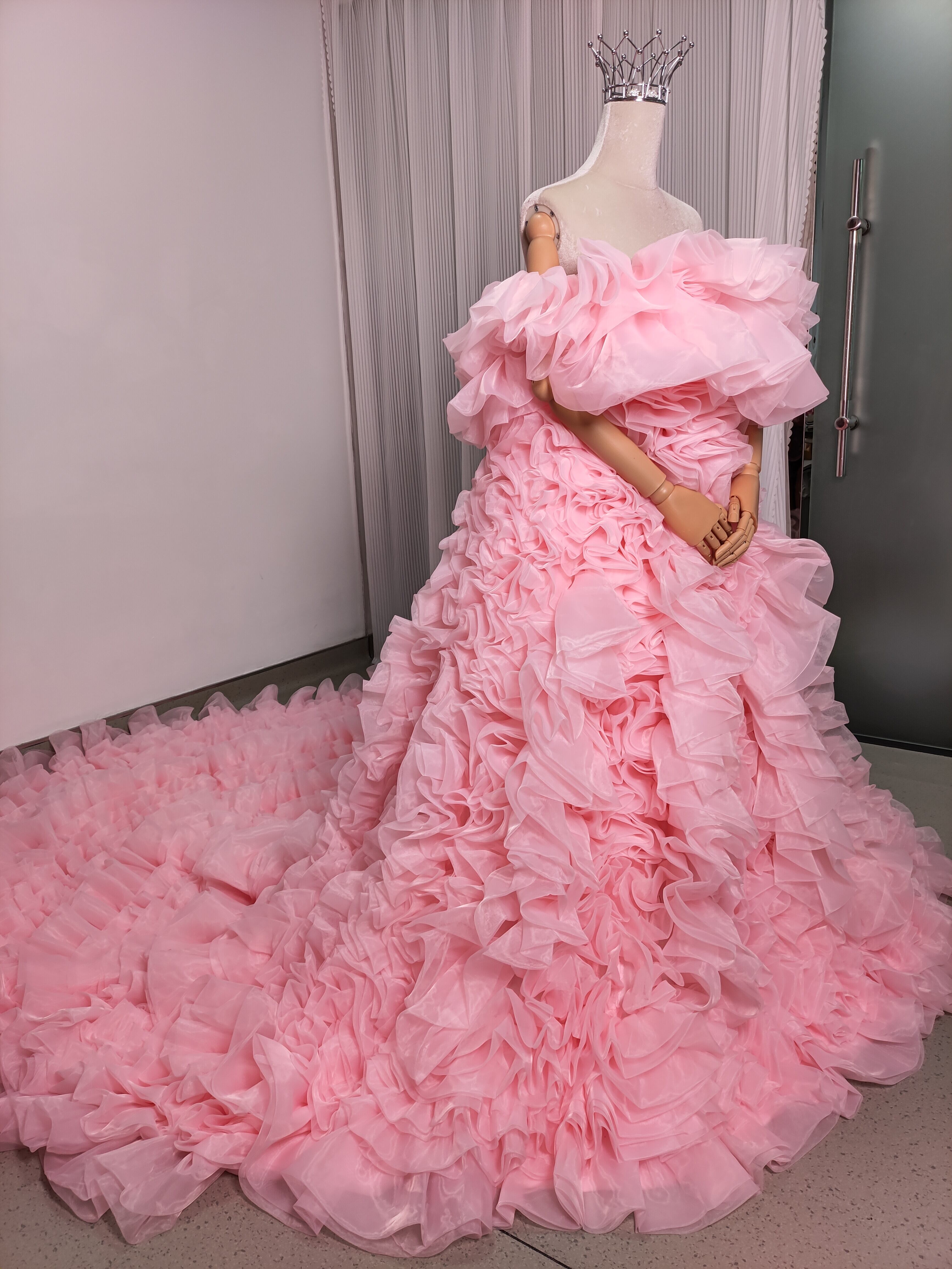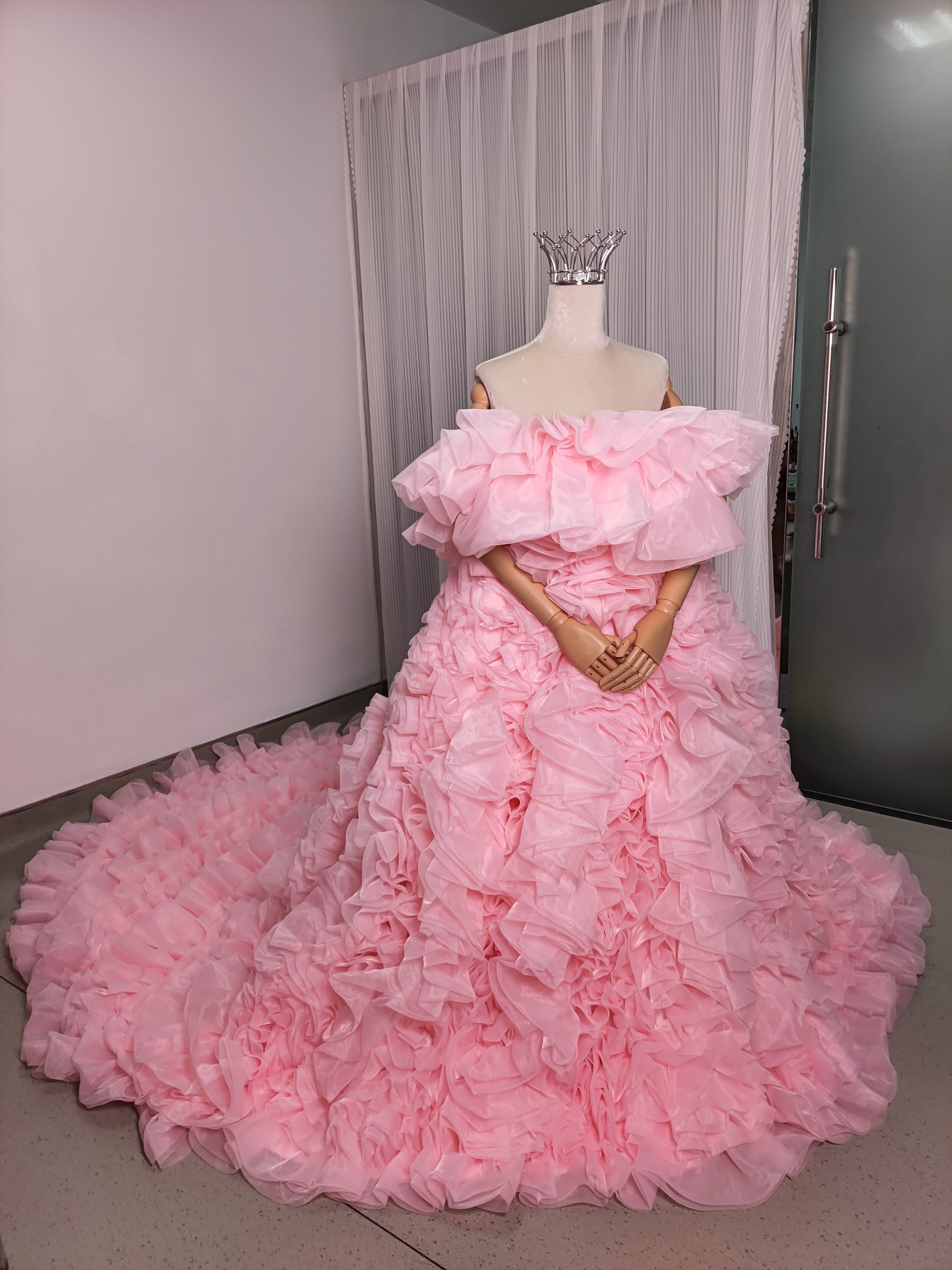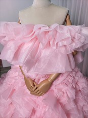 豪華! カラードレス 薄ピンク オフショルダー 上質オーガンジー もこもこドレス 可愛い 花嫁