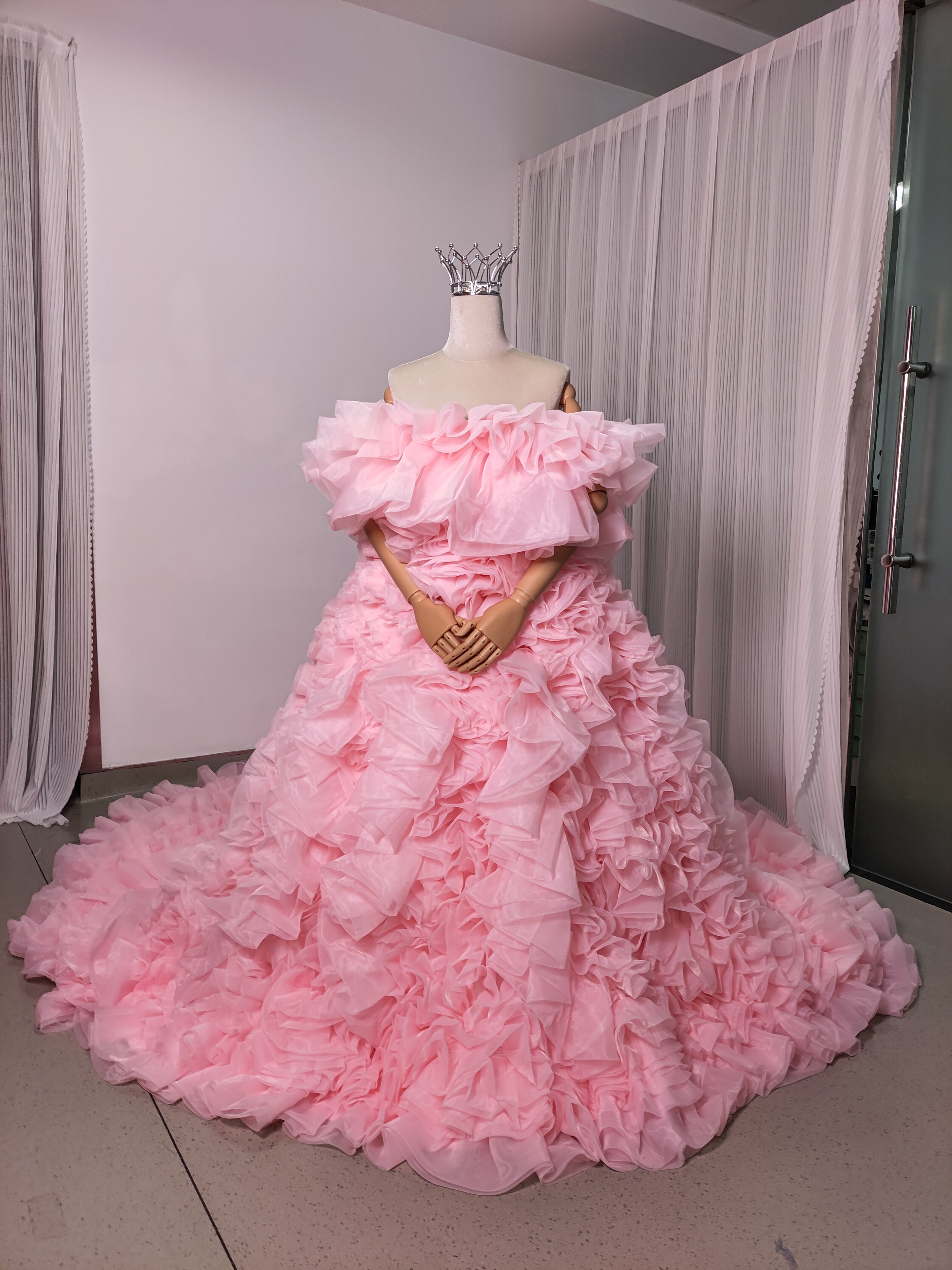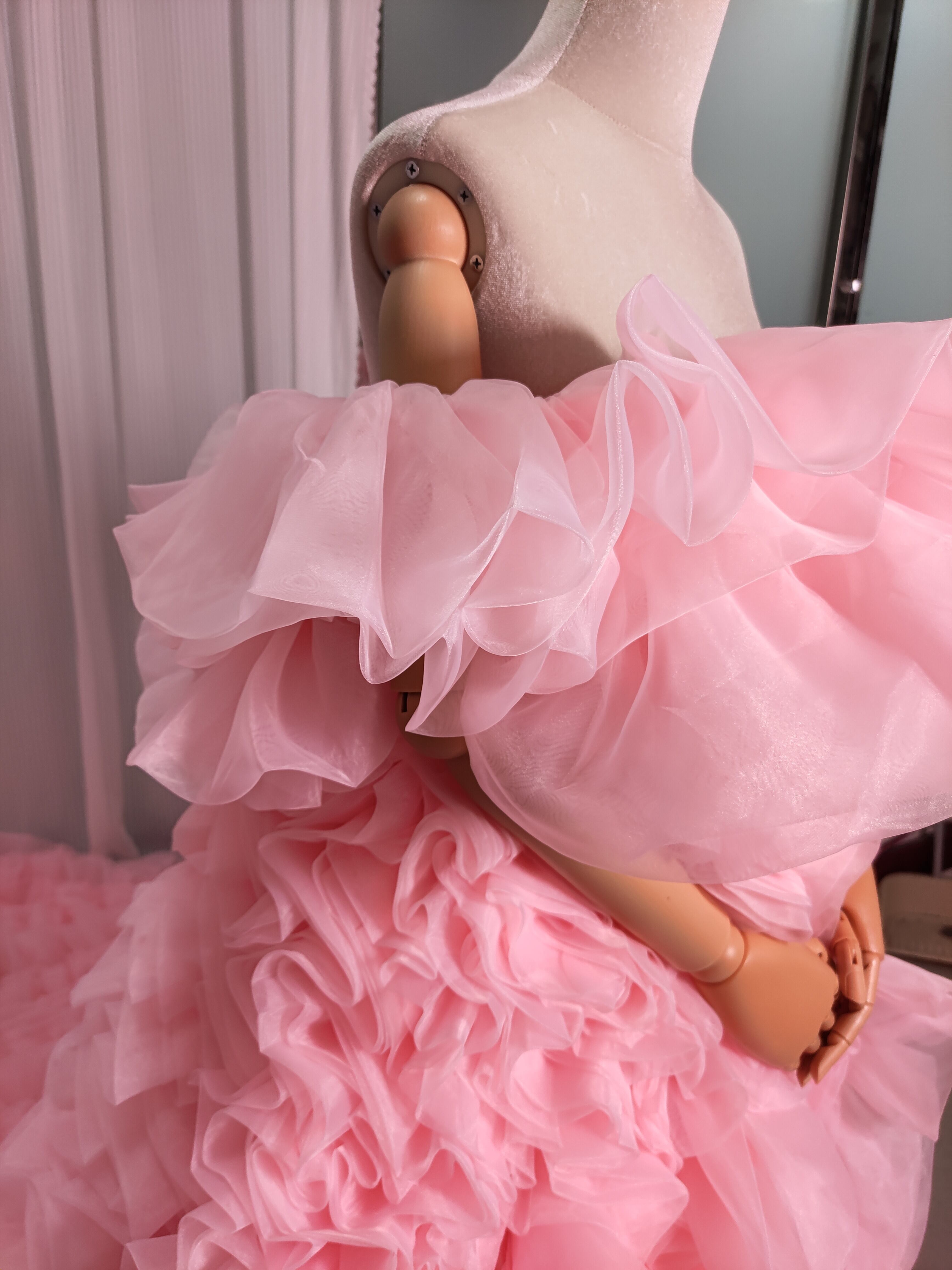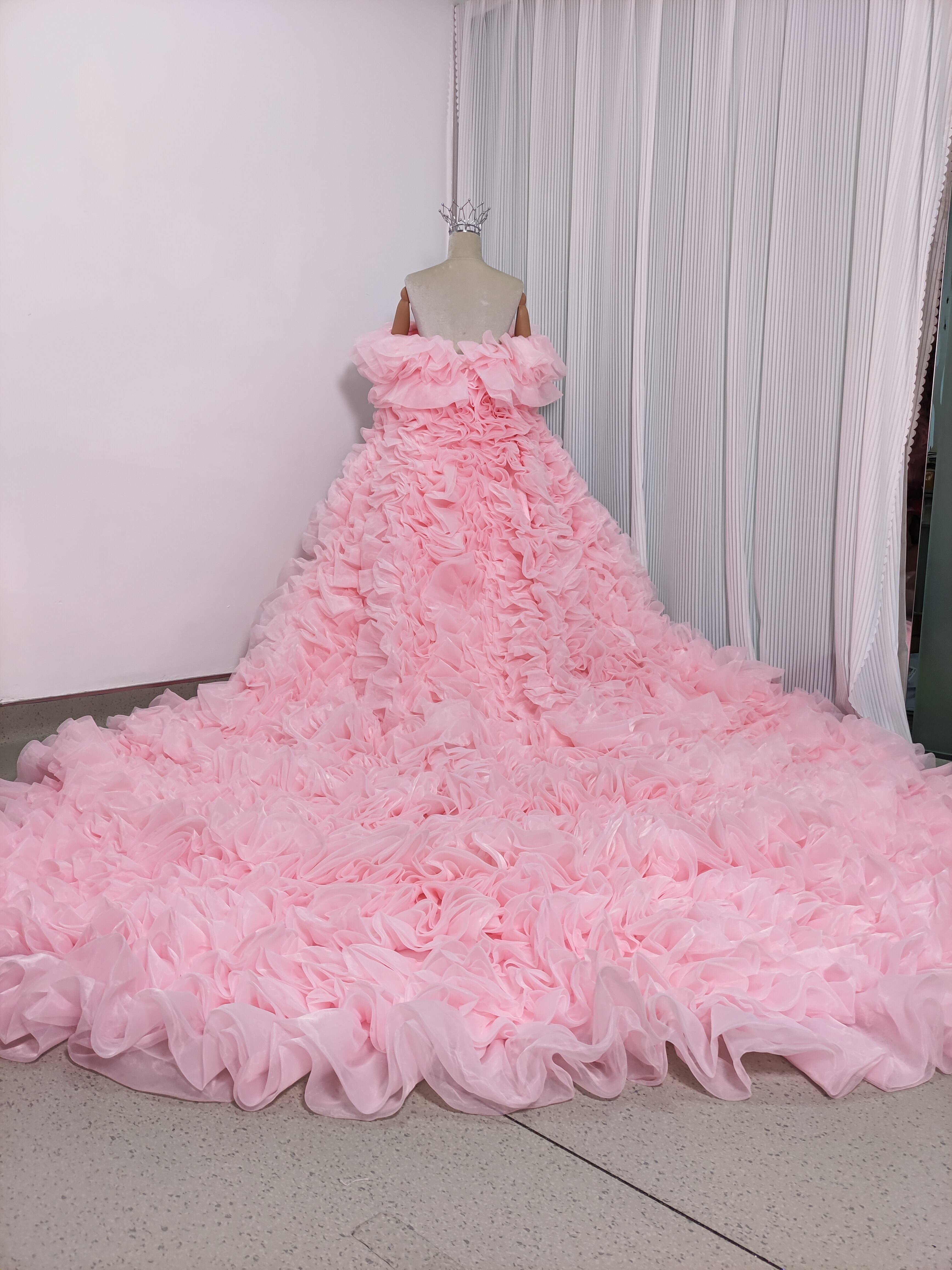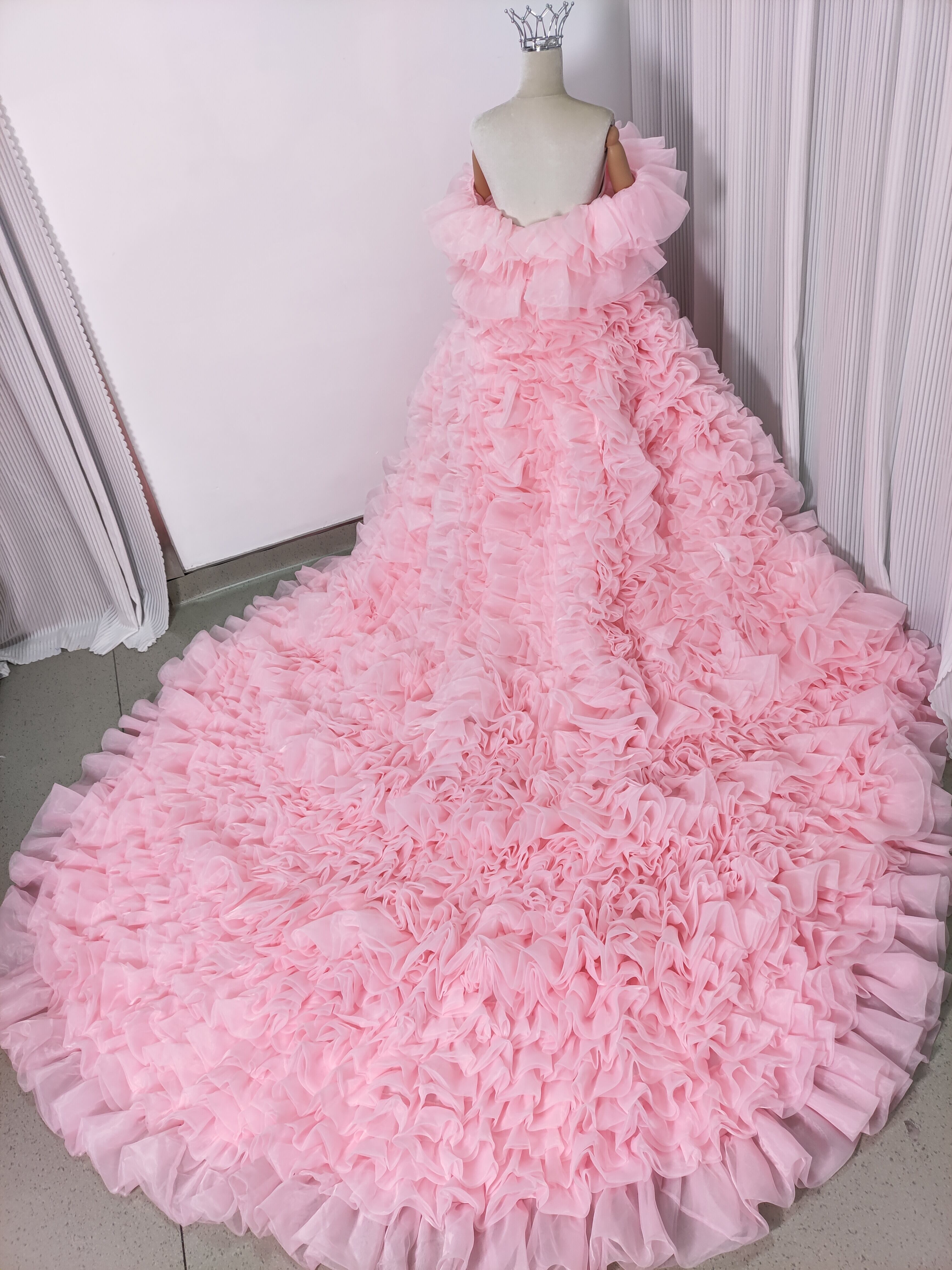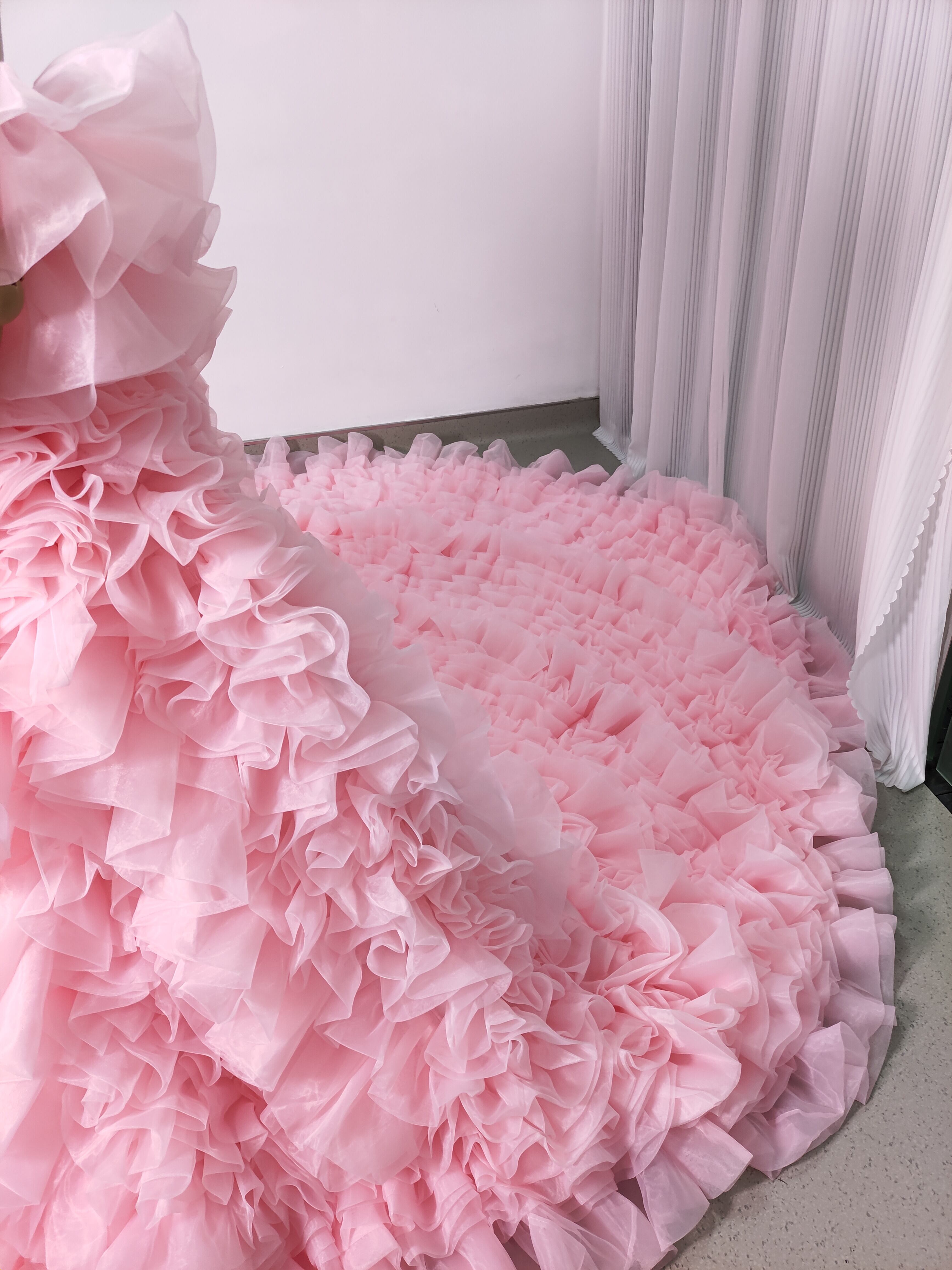 豪華! カラードレス 薄ピンク オフショルダー 上質オーガンジー もこもこドレス 可愛い 花嫁