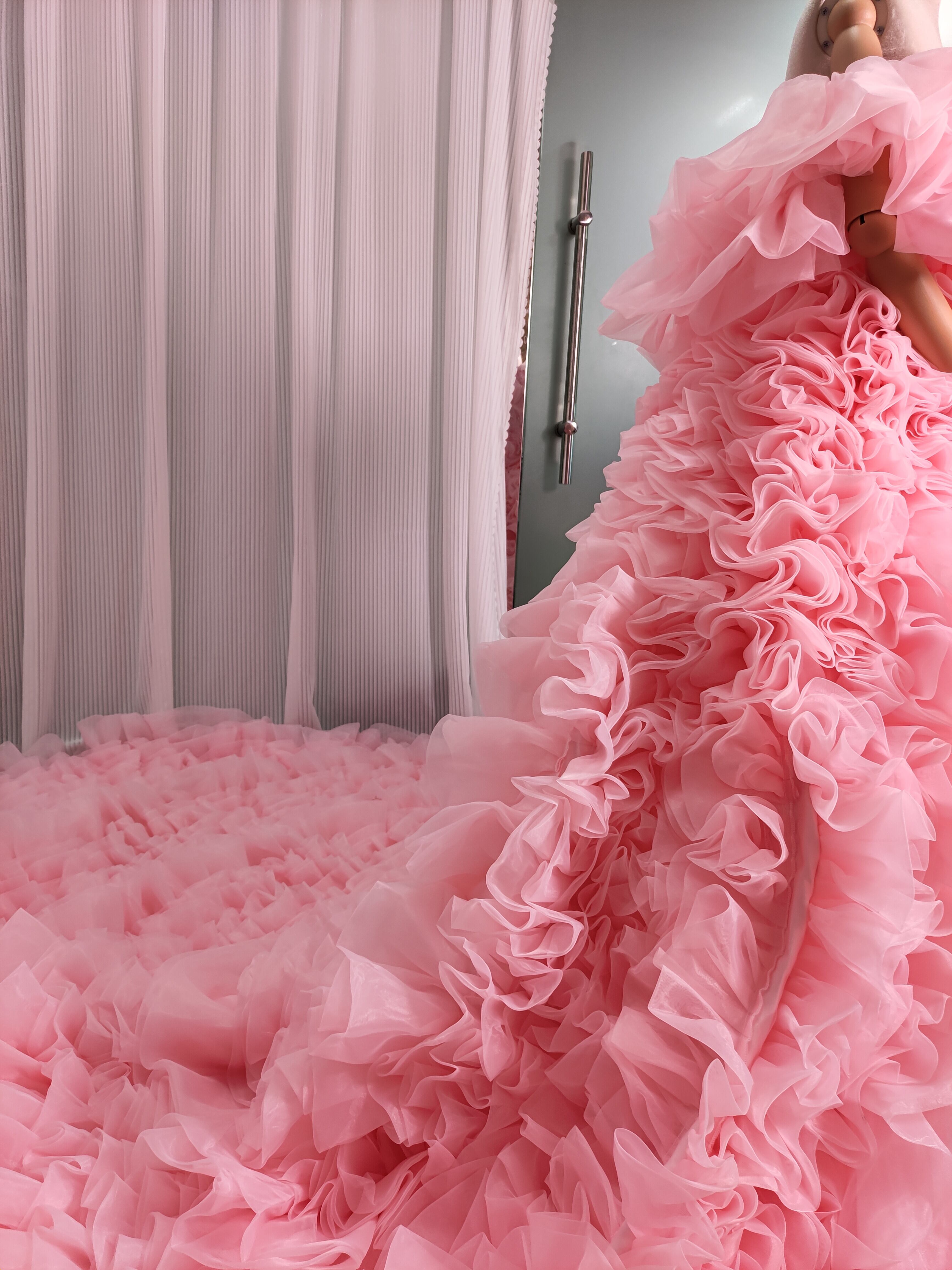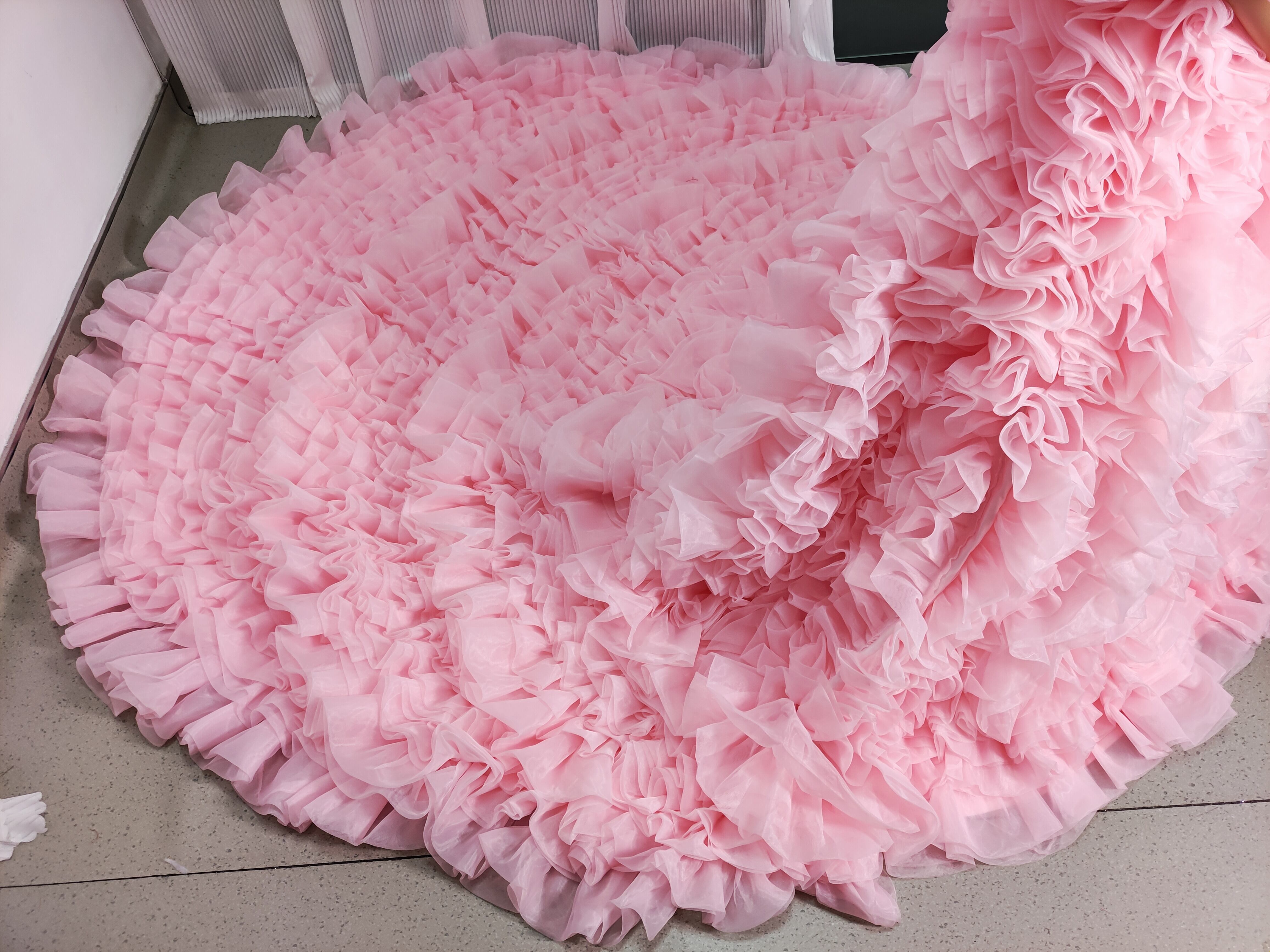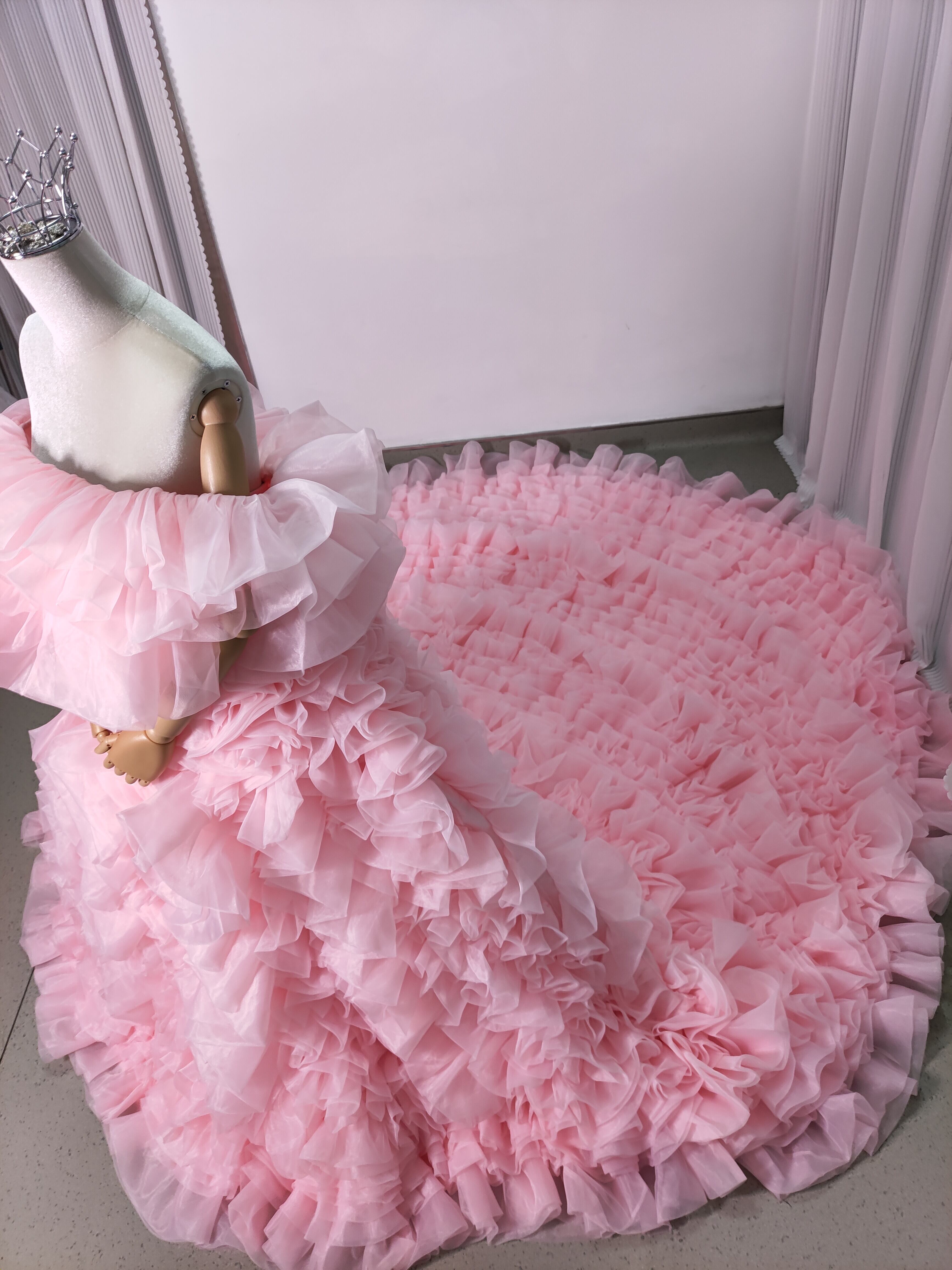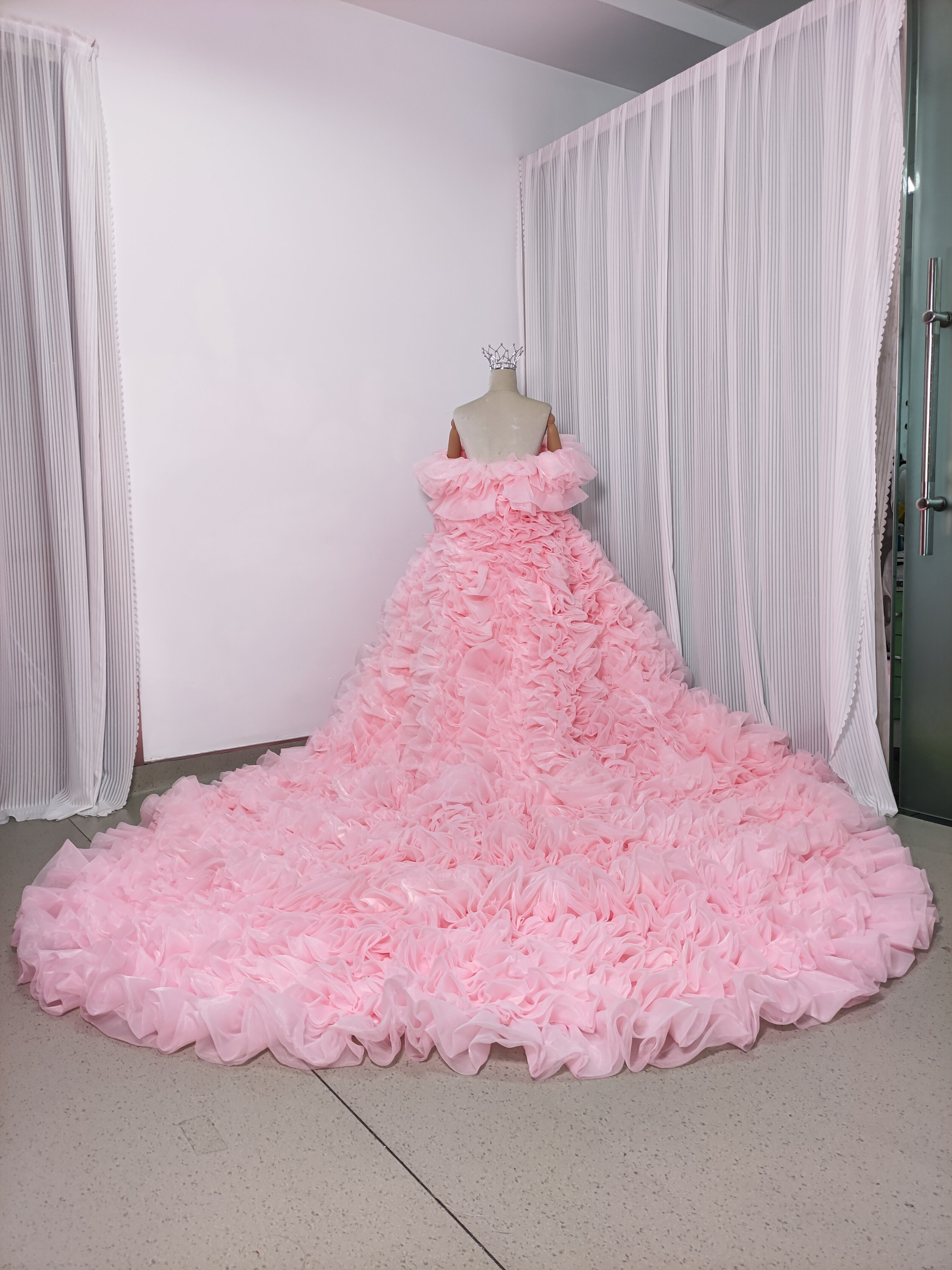 豪華! カラードレス 薄ピンク オフショルダー 上質オーガンジー もこもこドレス 可愛い 花嫁