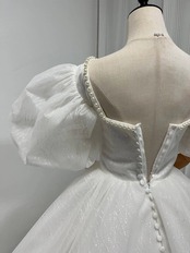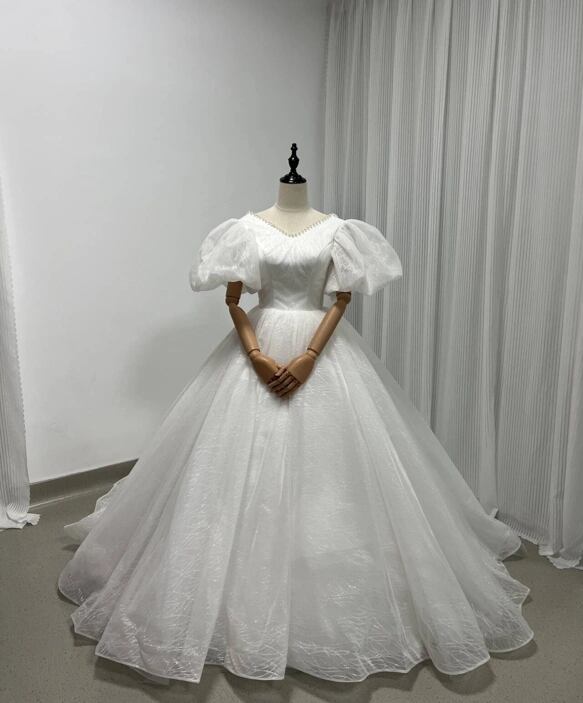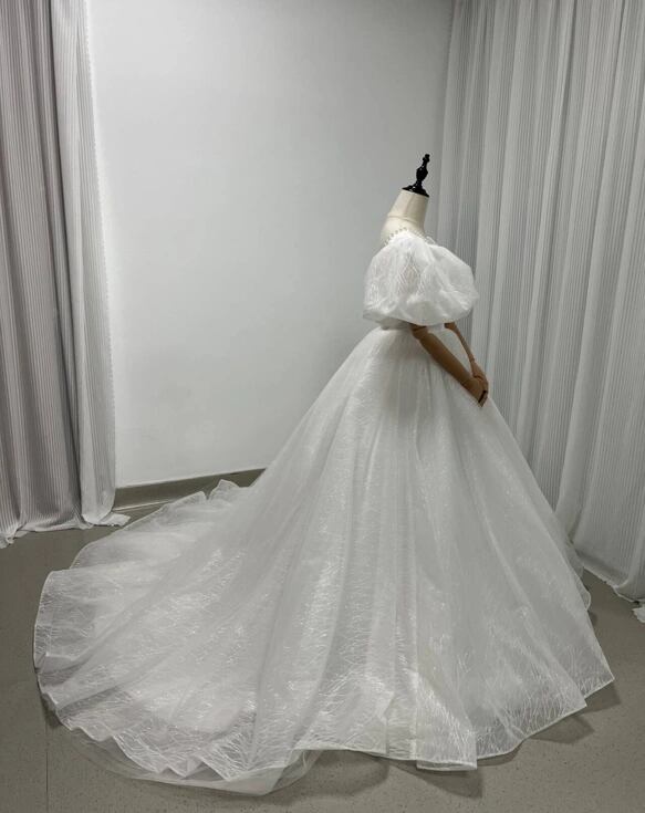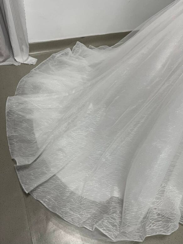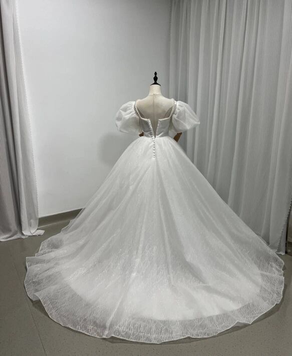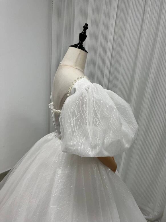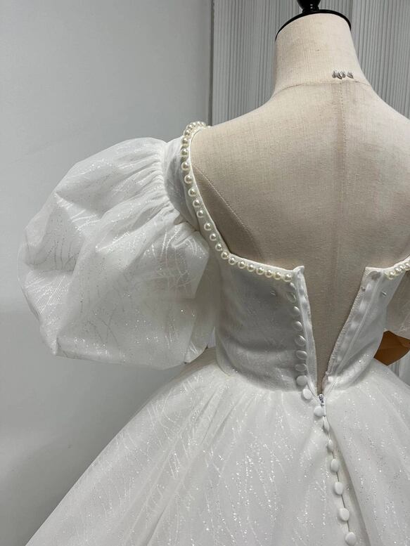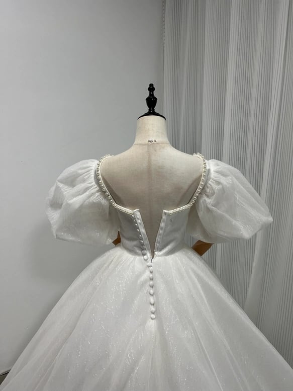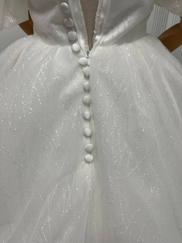 ウェディングドレス キラキラグリッターチュール ビーズ くるみボタン ファスナー Vネックドレス プリンセスラ
