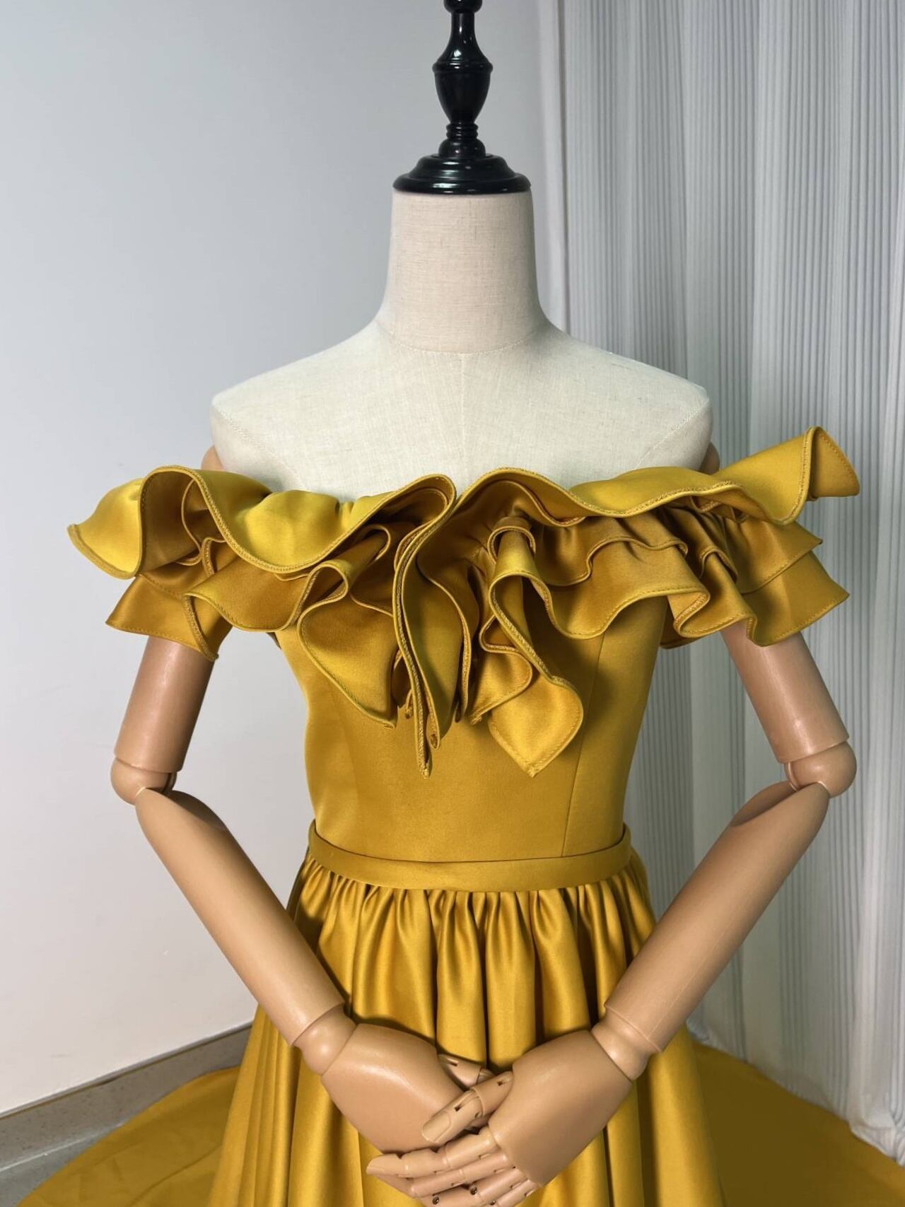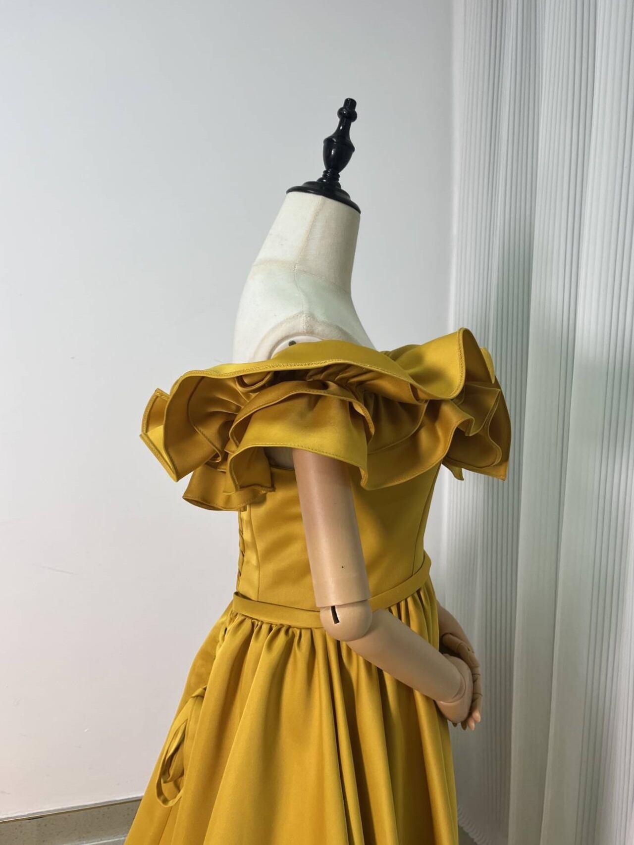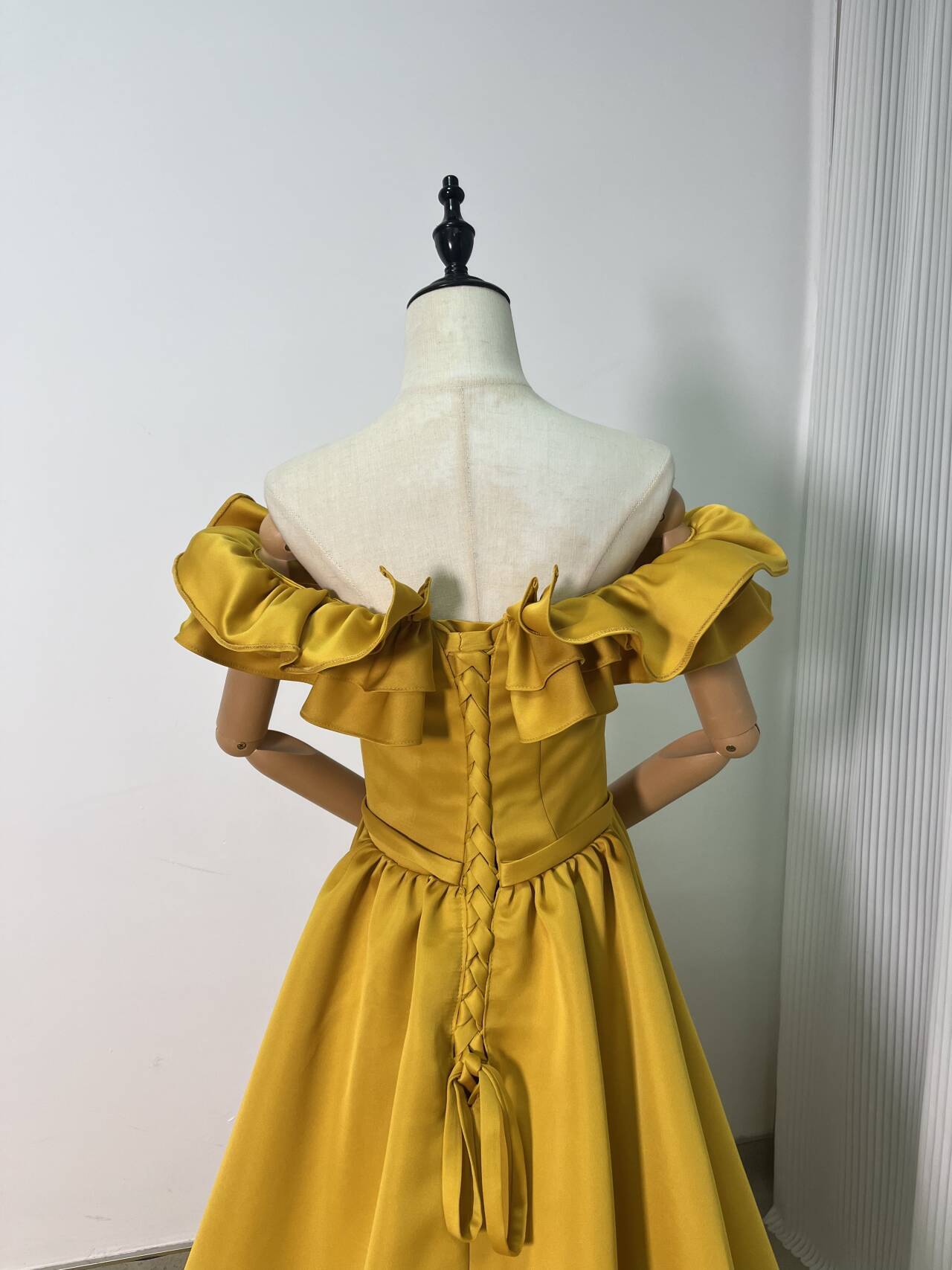 パーティードレス イエロー オフショルダー 編み上げ 抜群のおしゃれ見え 前撮り 2次会/合コン/デート
