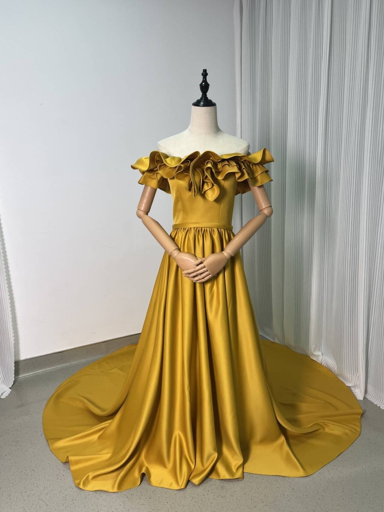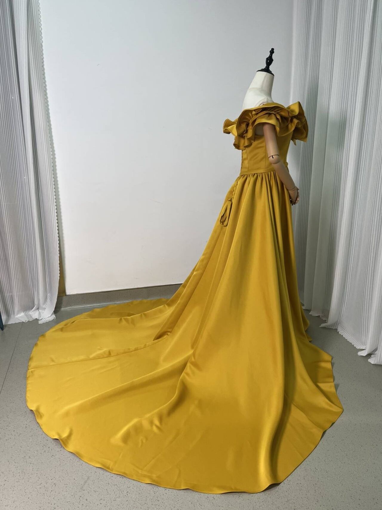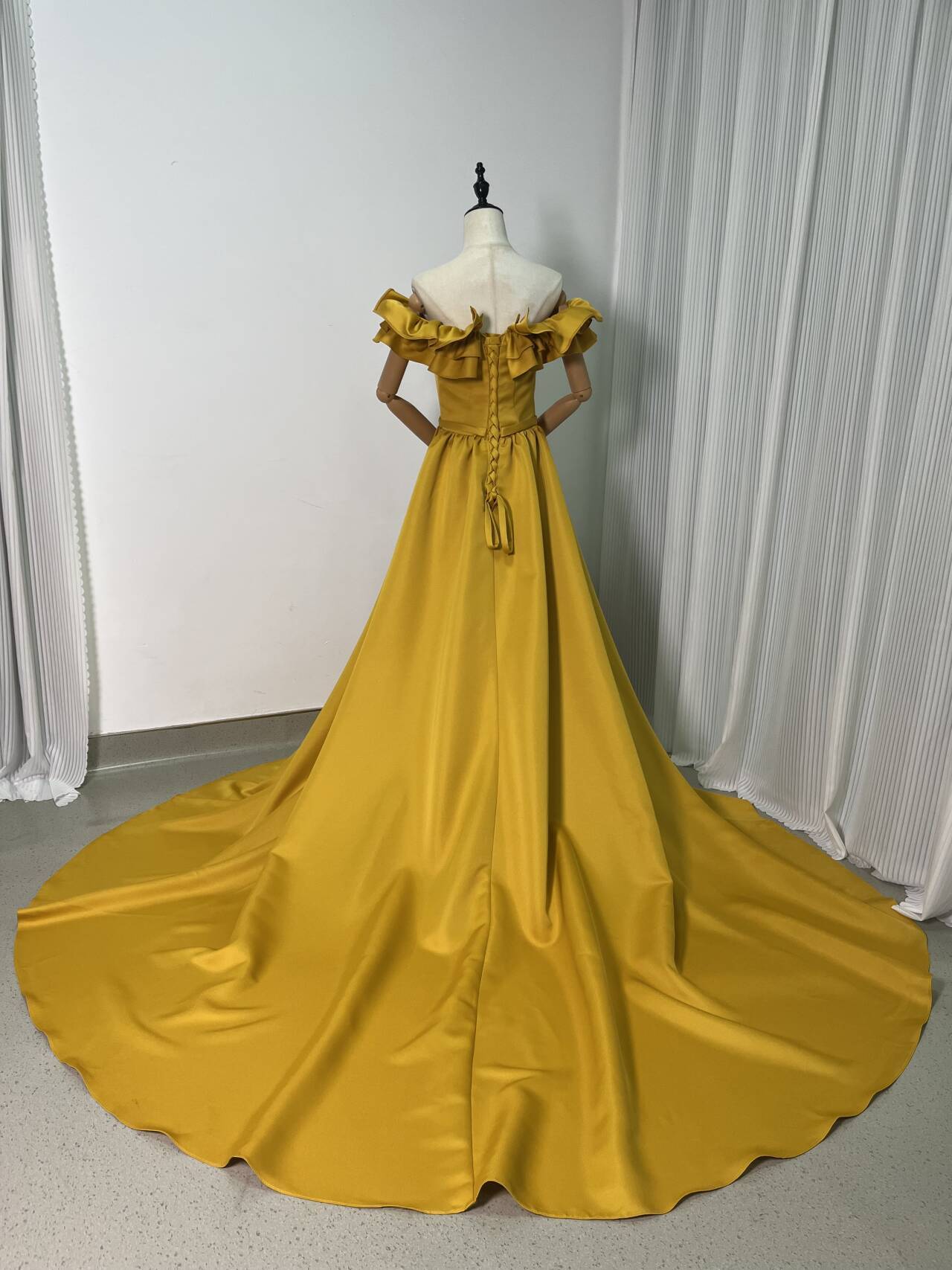パーティードレス イエロー オフショルダー 編み上げ 抜群のおしゃれ見え 前撮り 2次会/合コン/デート