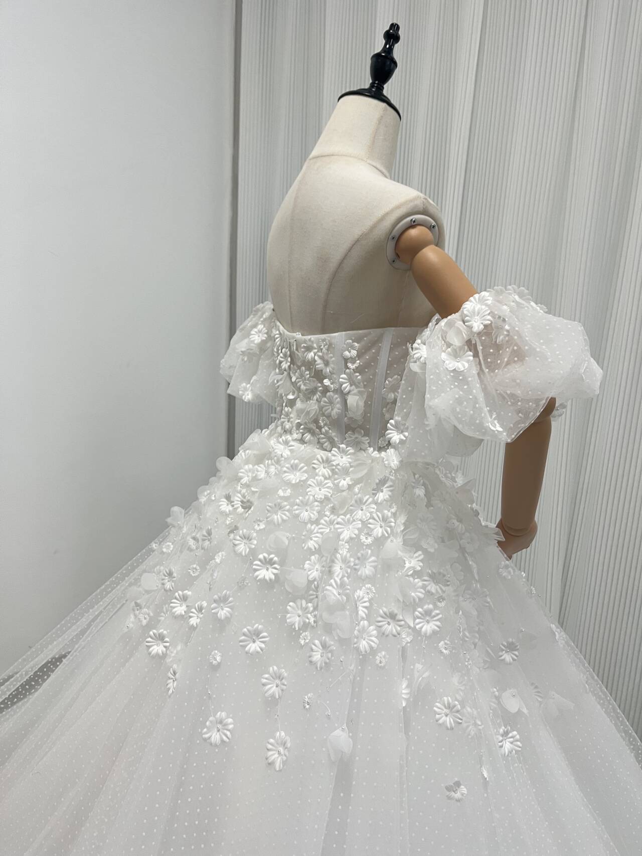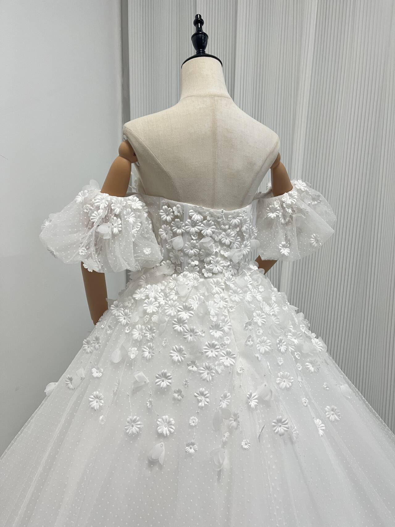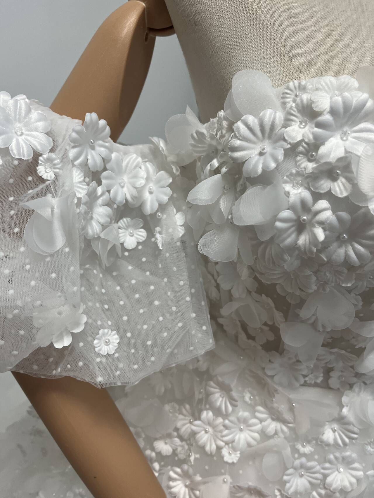 可愛い ウェディングドレス 2way×オフショルダー 小花 取り外し袖 贅沢な小花総レース 肩あき 揺らめく裾