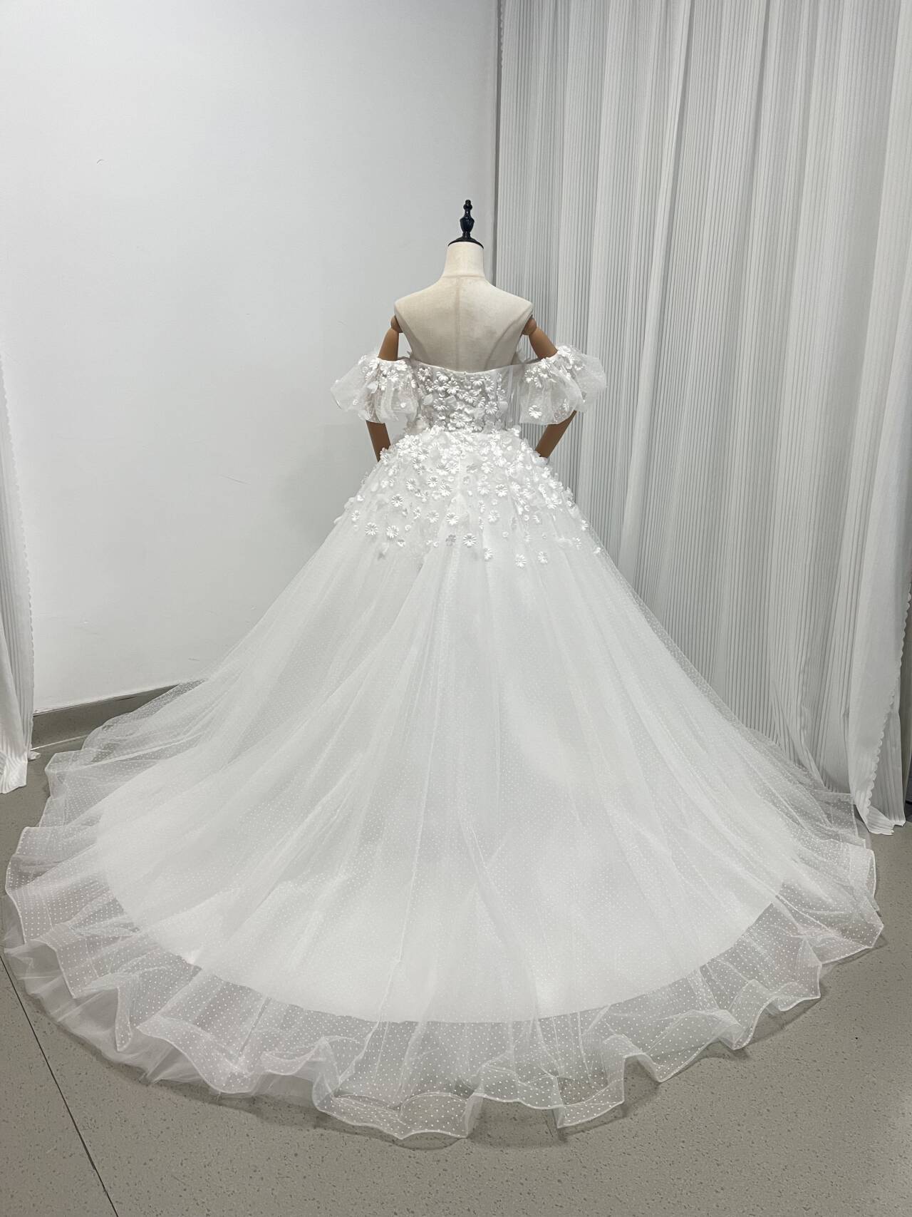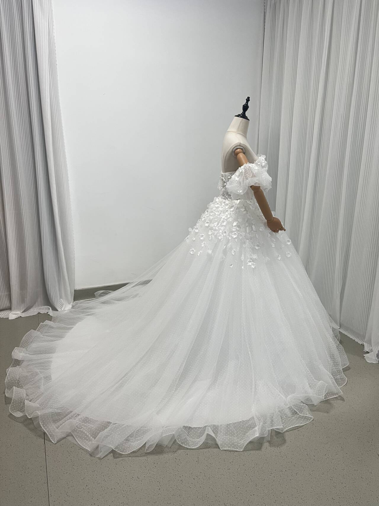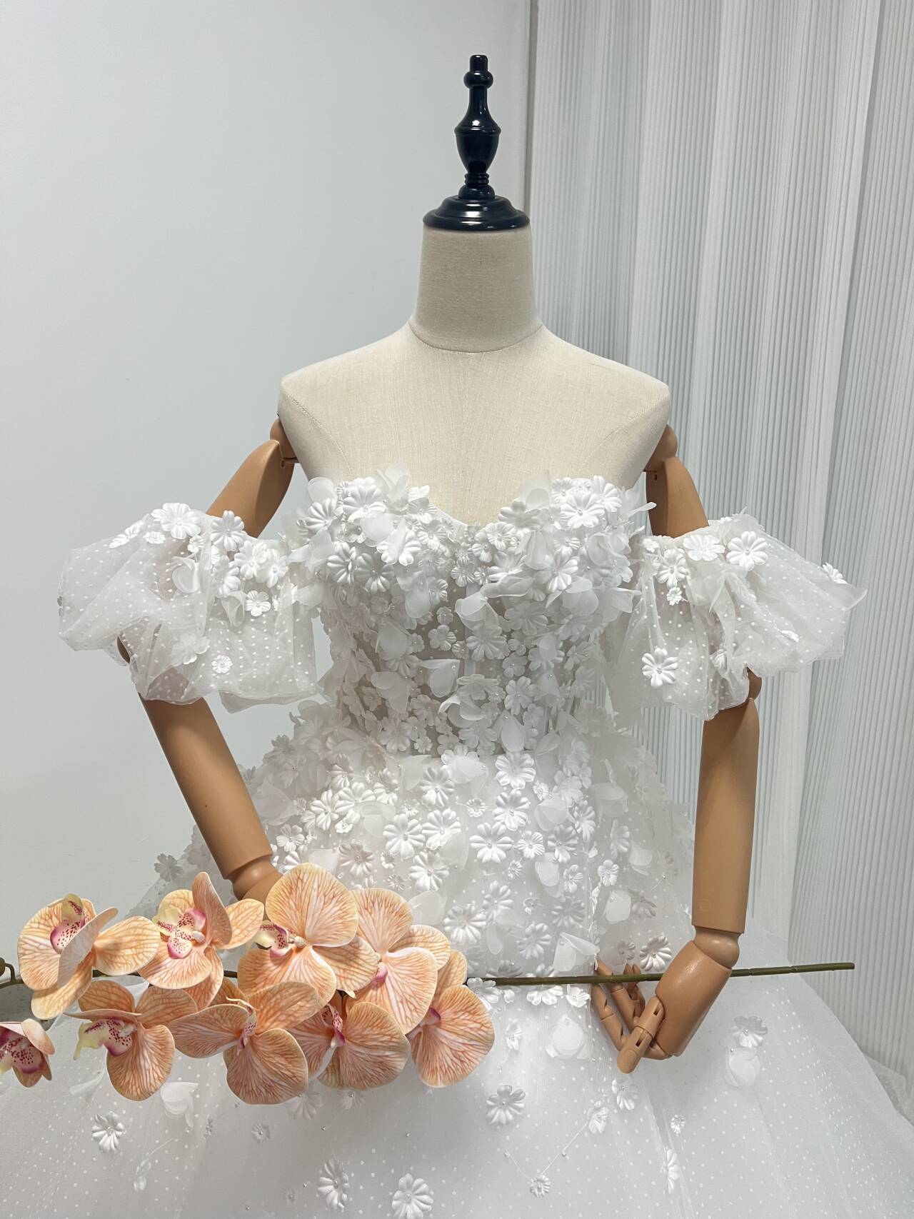 可愛い ウェディングドレス 2way×オフショルダー 小花 取り外し袖 贅沢な小花総レース 肩あき 揺らめく裾