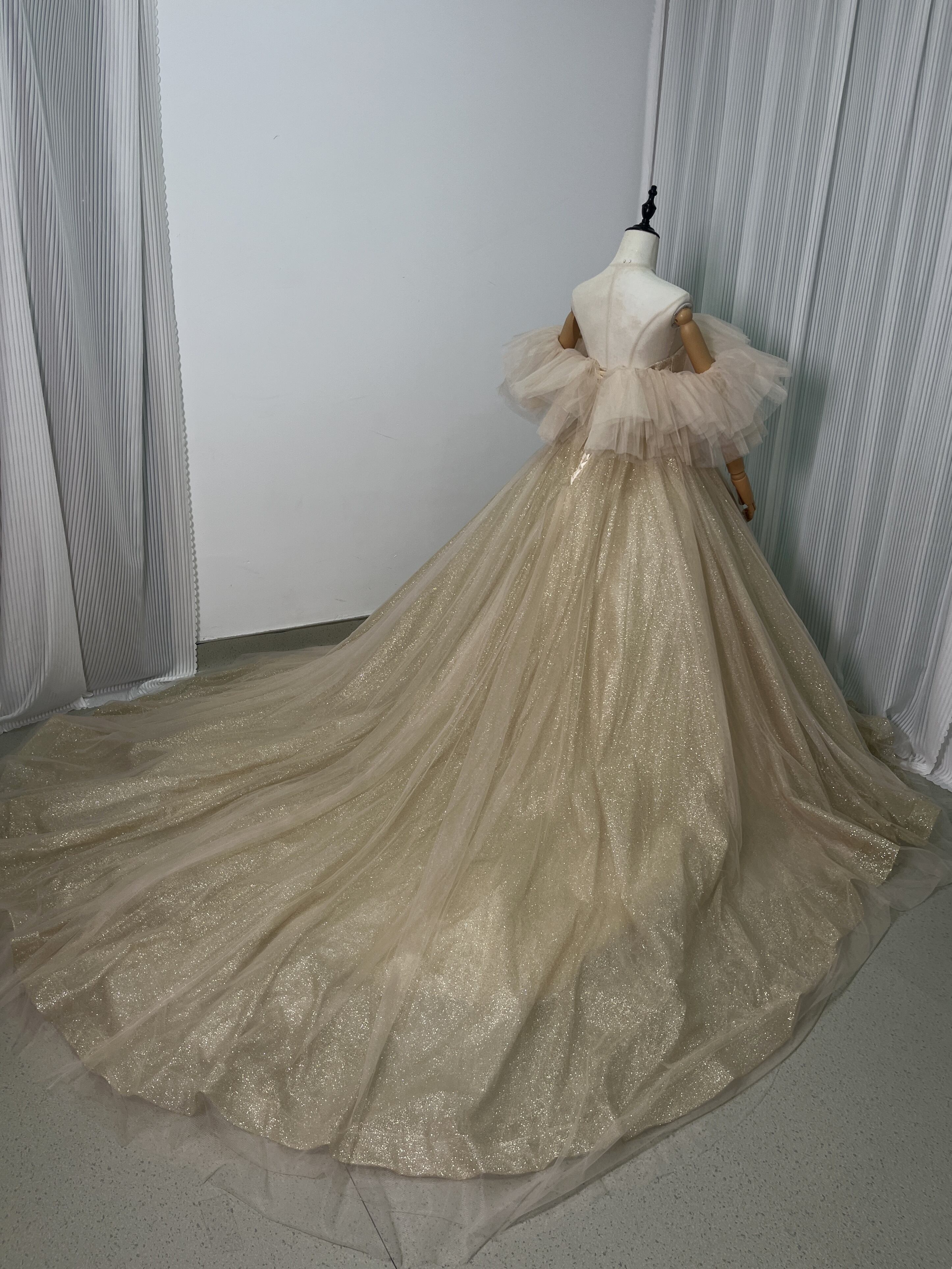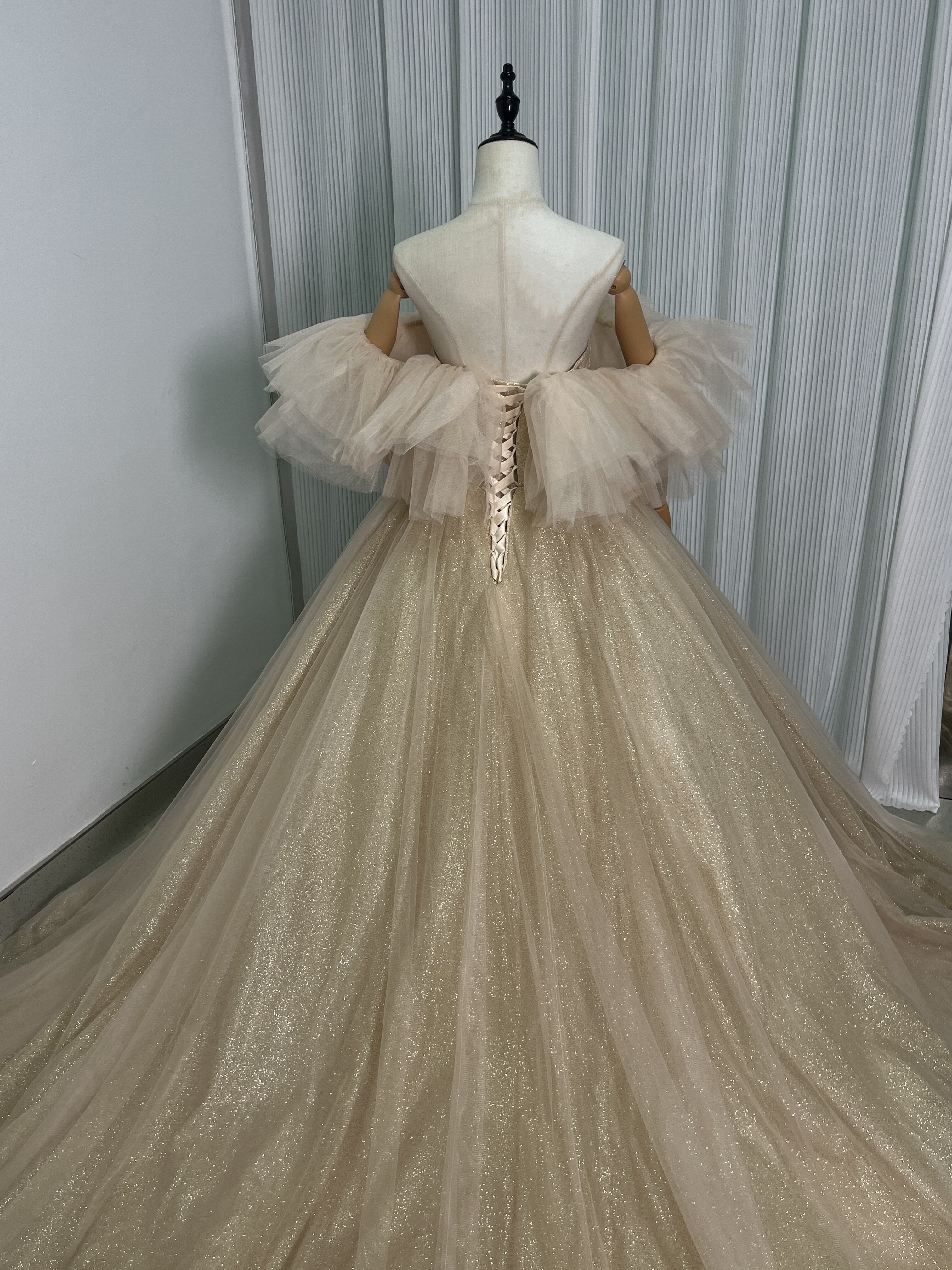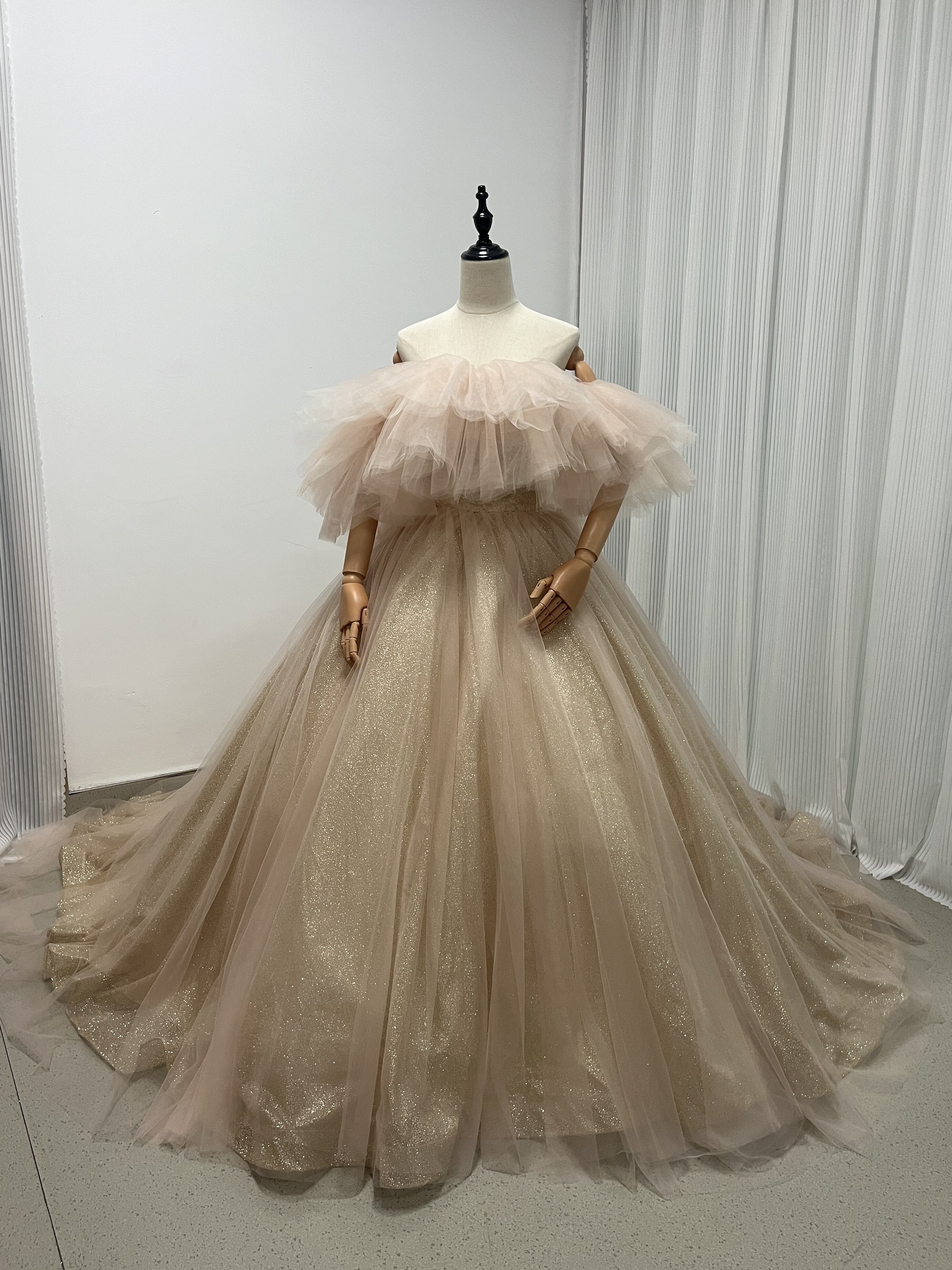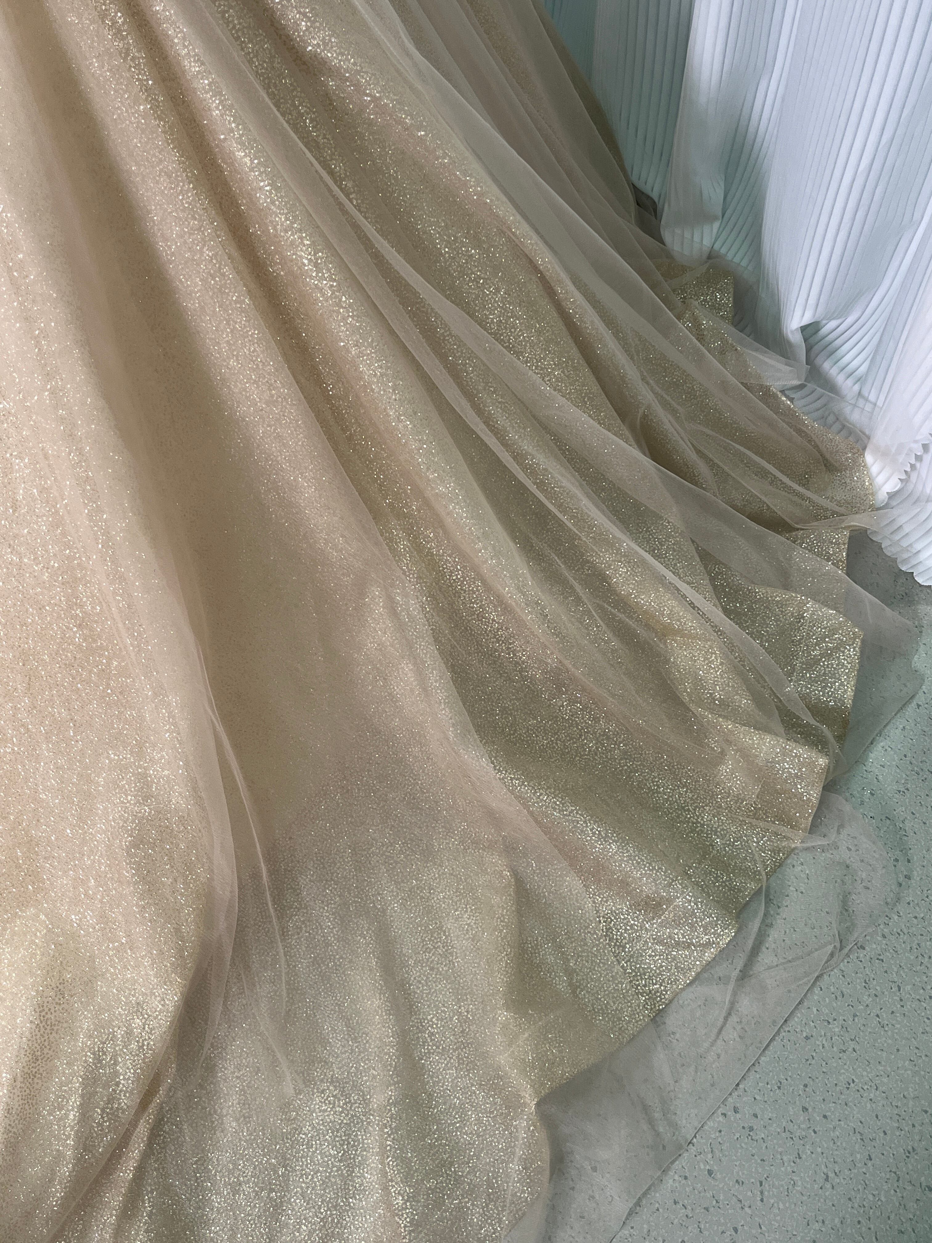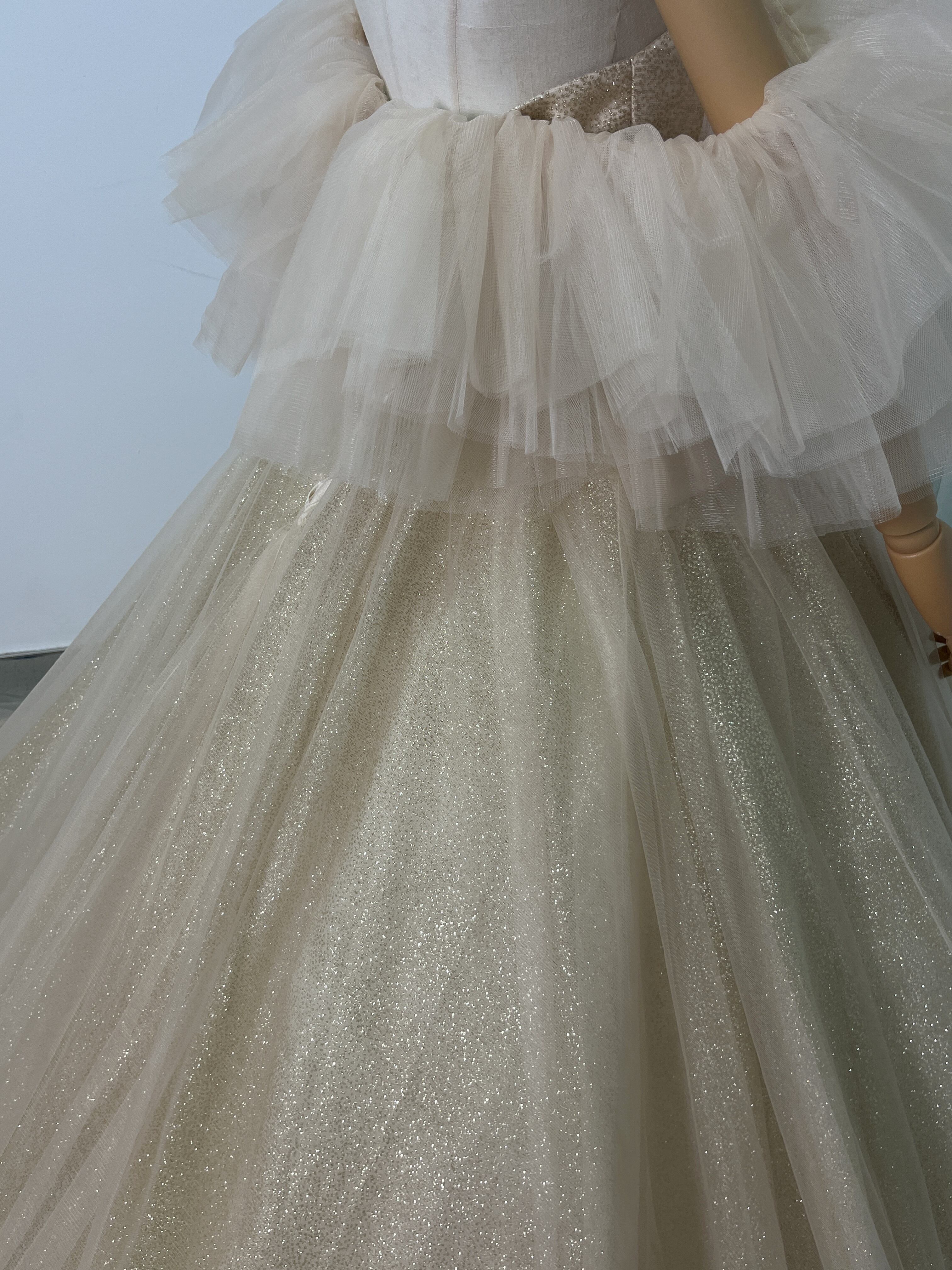 人気上昇!カラードレス 薄シャンパンの色 オフショルダー キラキラグリッターチュール 結婚式