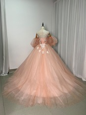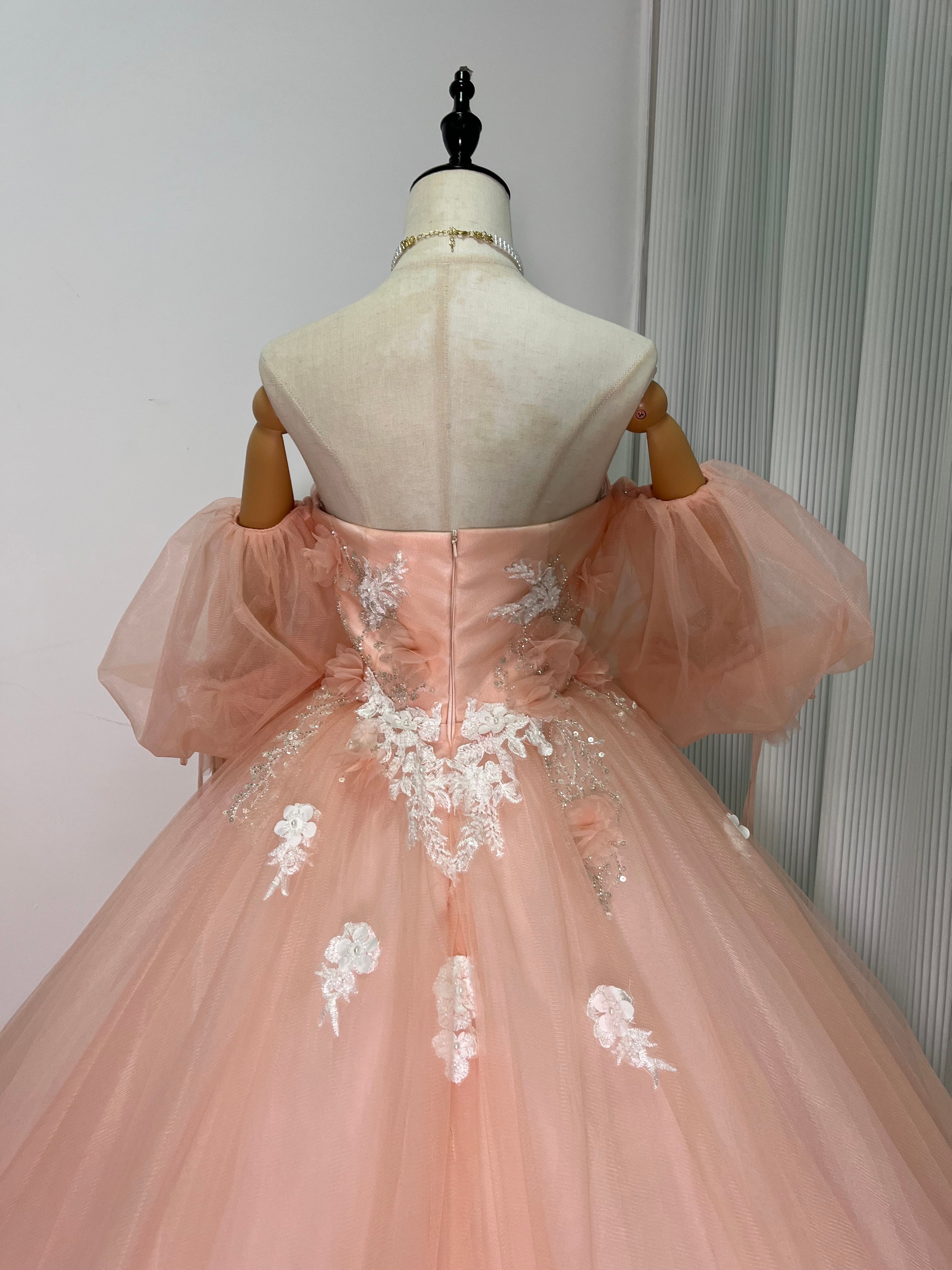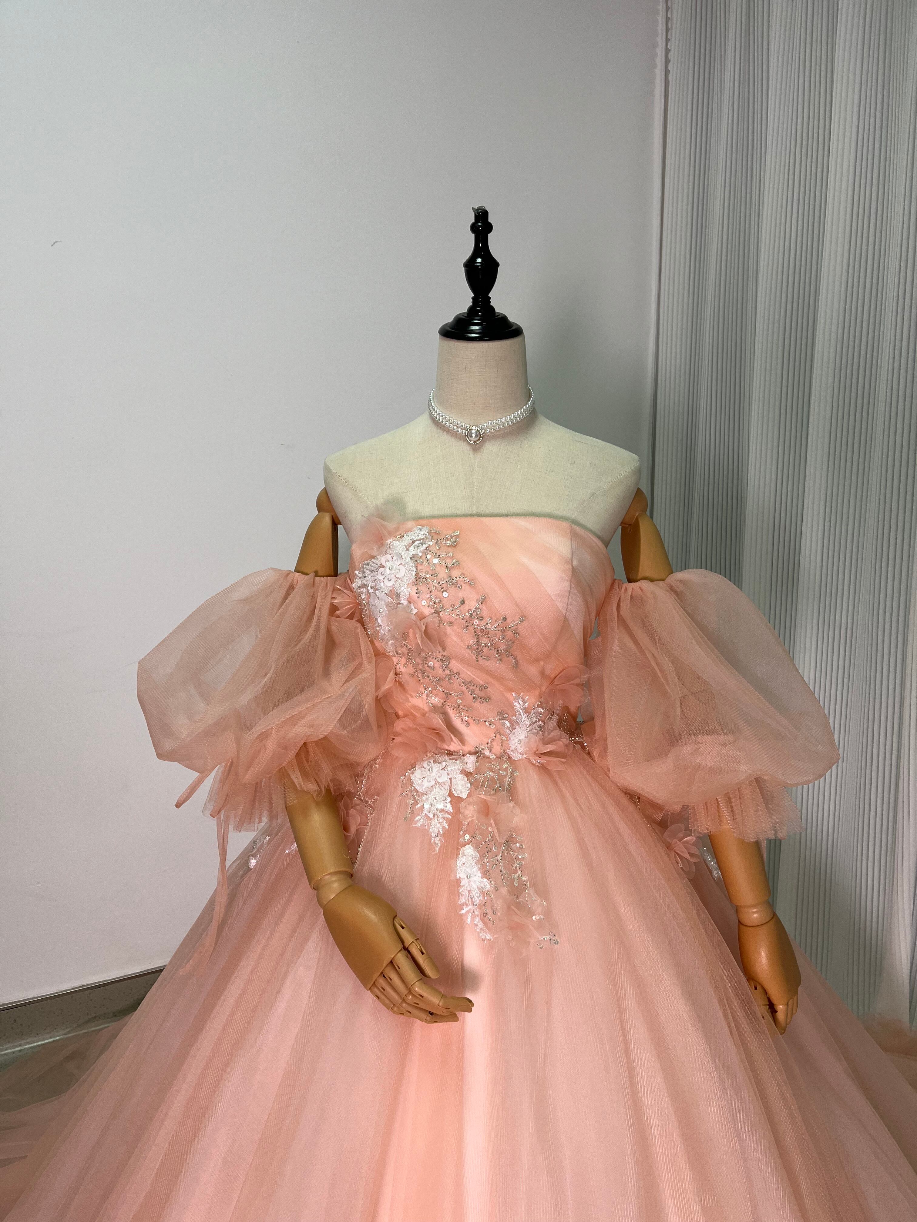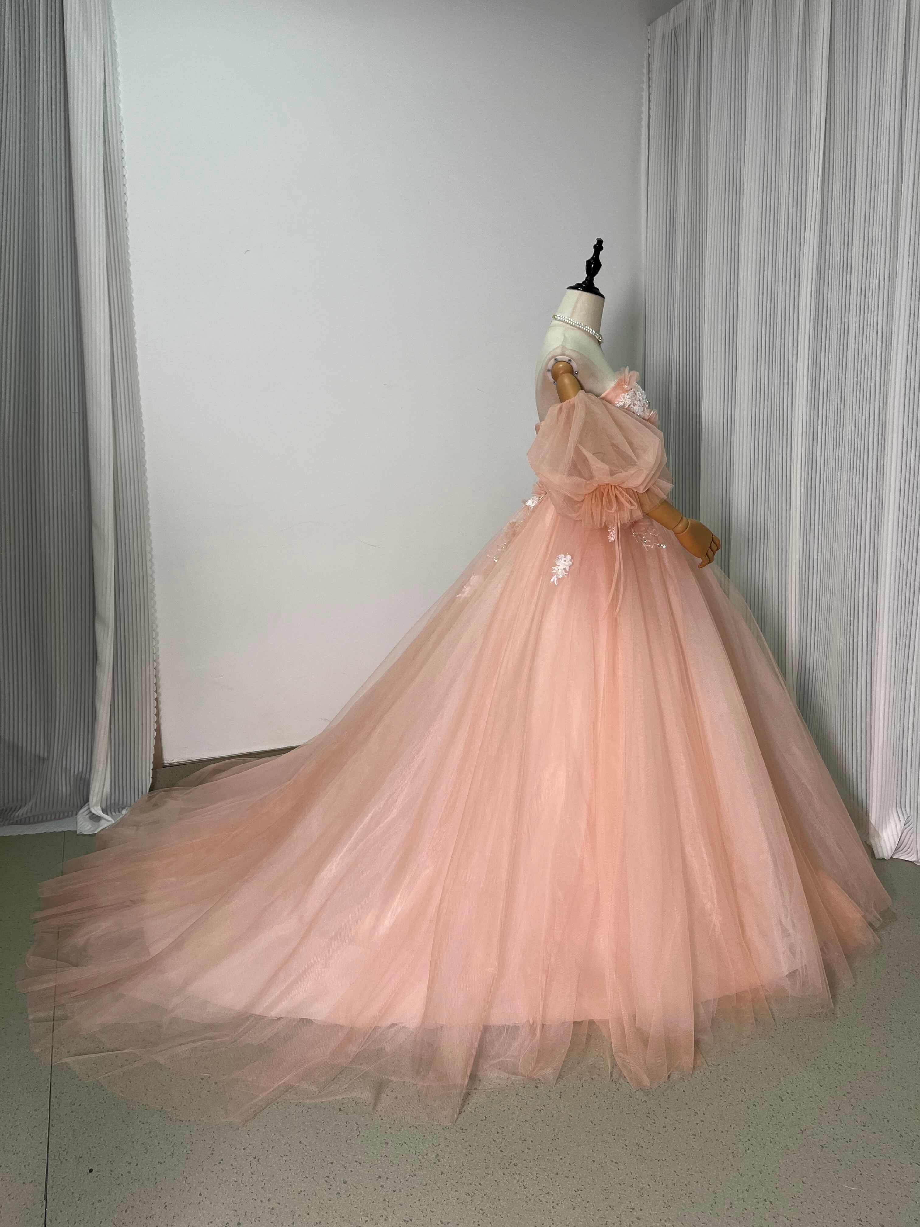 ウェディングドレス ピンク 憧れのドレス オフショルダー ふわふわ袖 フレアスカート お呼ばれ/二次会/パーテ