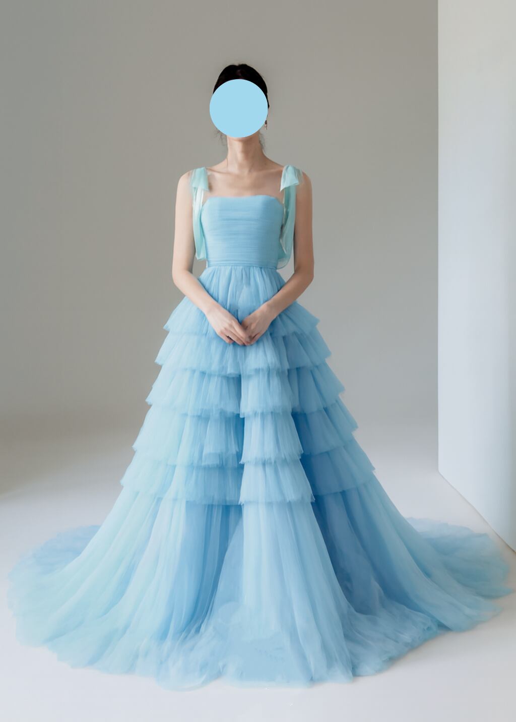 カラードレス 爽やかで優しいブルー 肩のリボン ティアードのドレス プリンセスライン ソフトチュール 結婚式