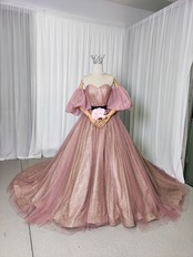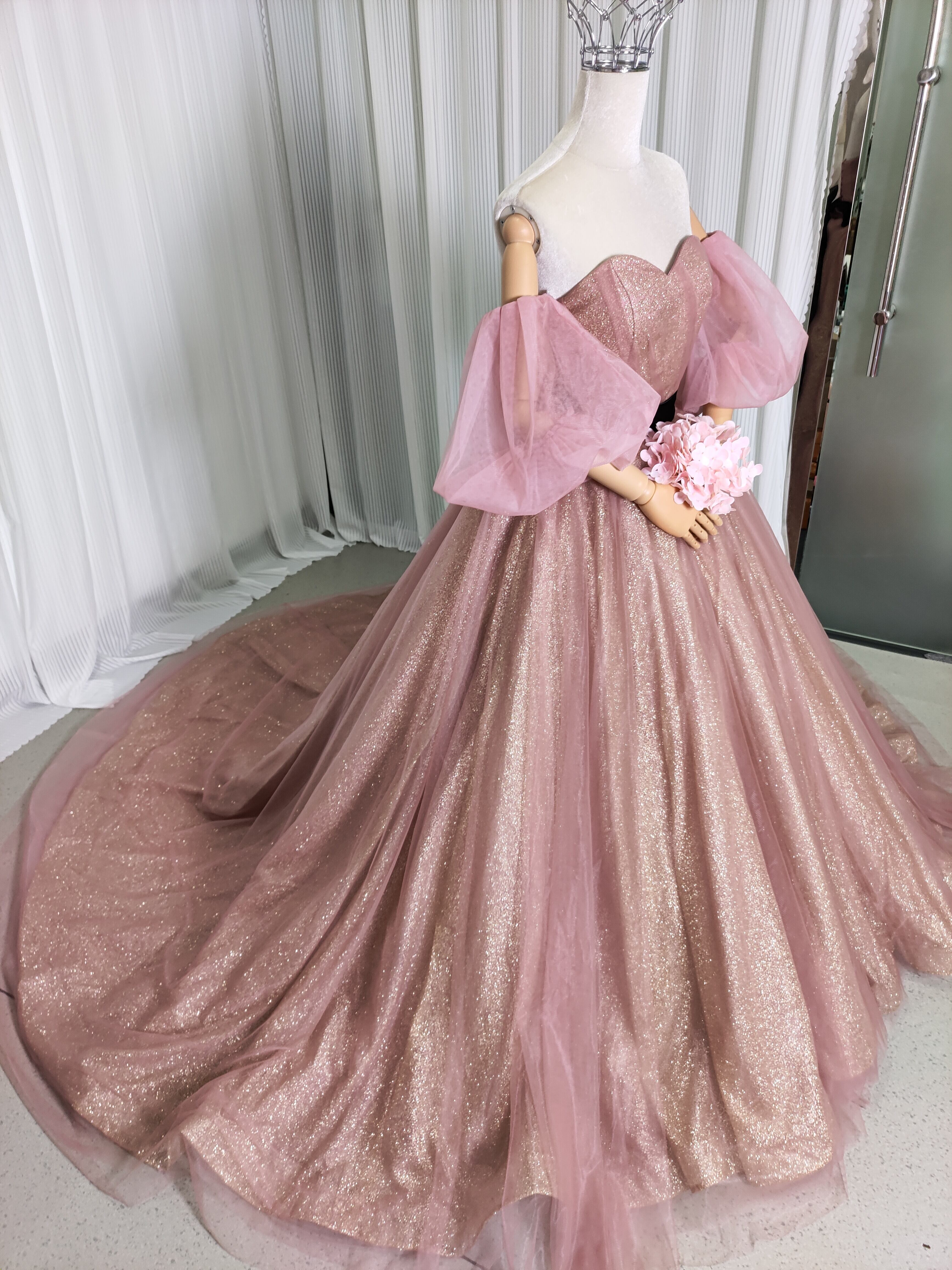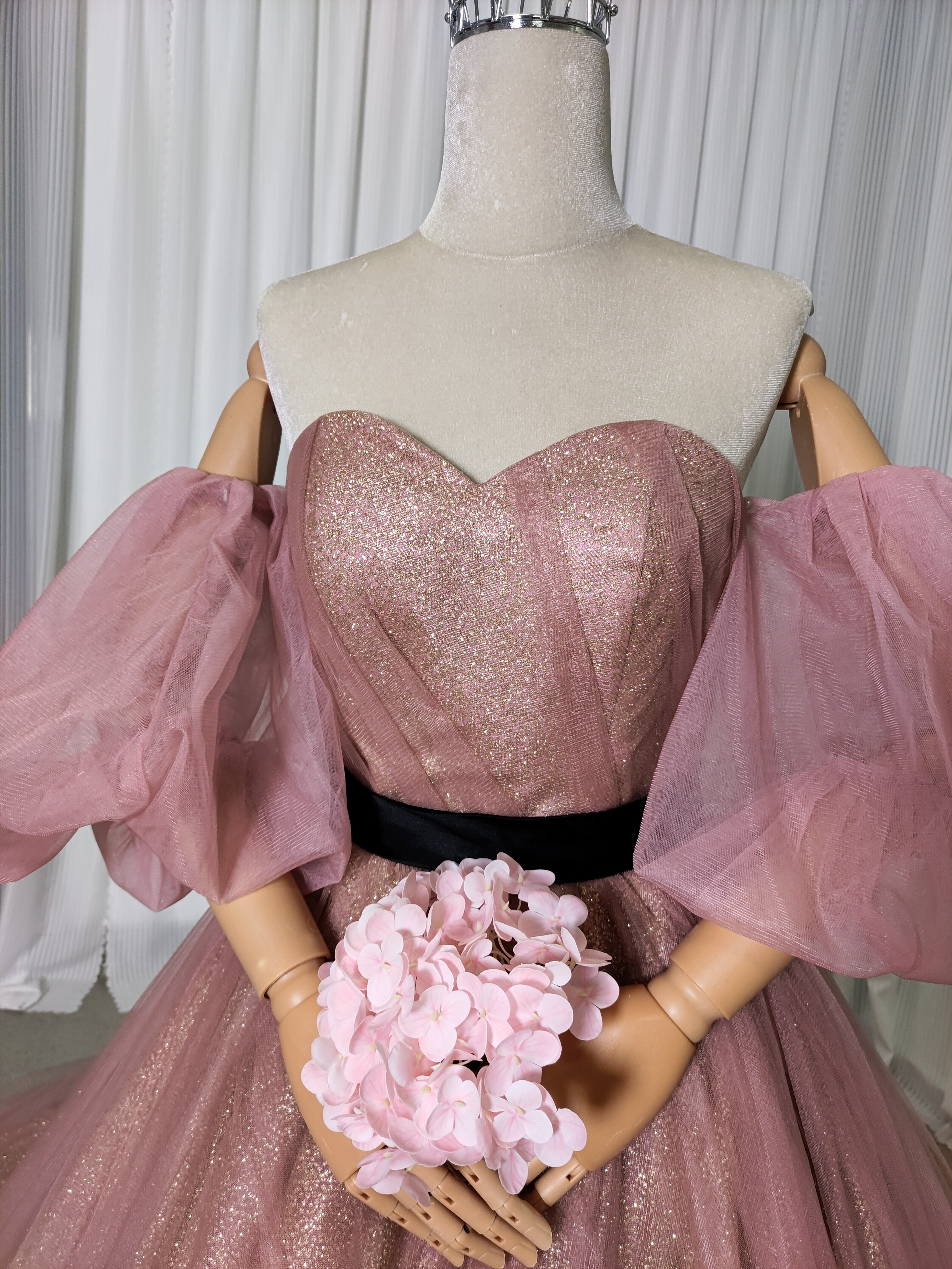 カラードレス ピンク サッシュベルト 取り外し袖 キラキラグリッターチュール Aライン 結婚式
