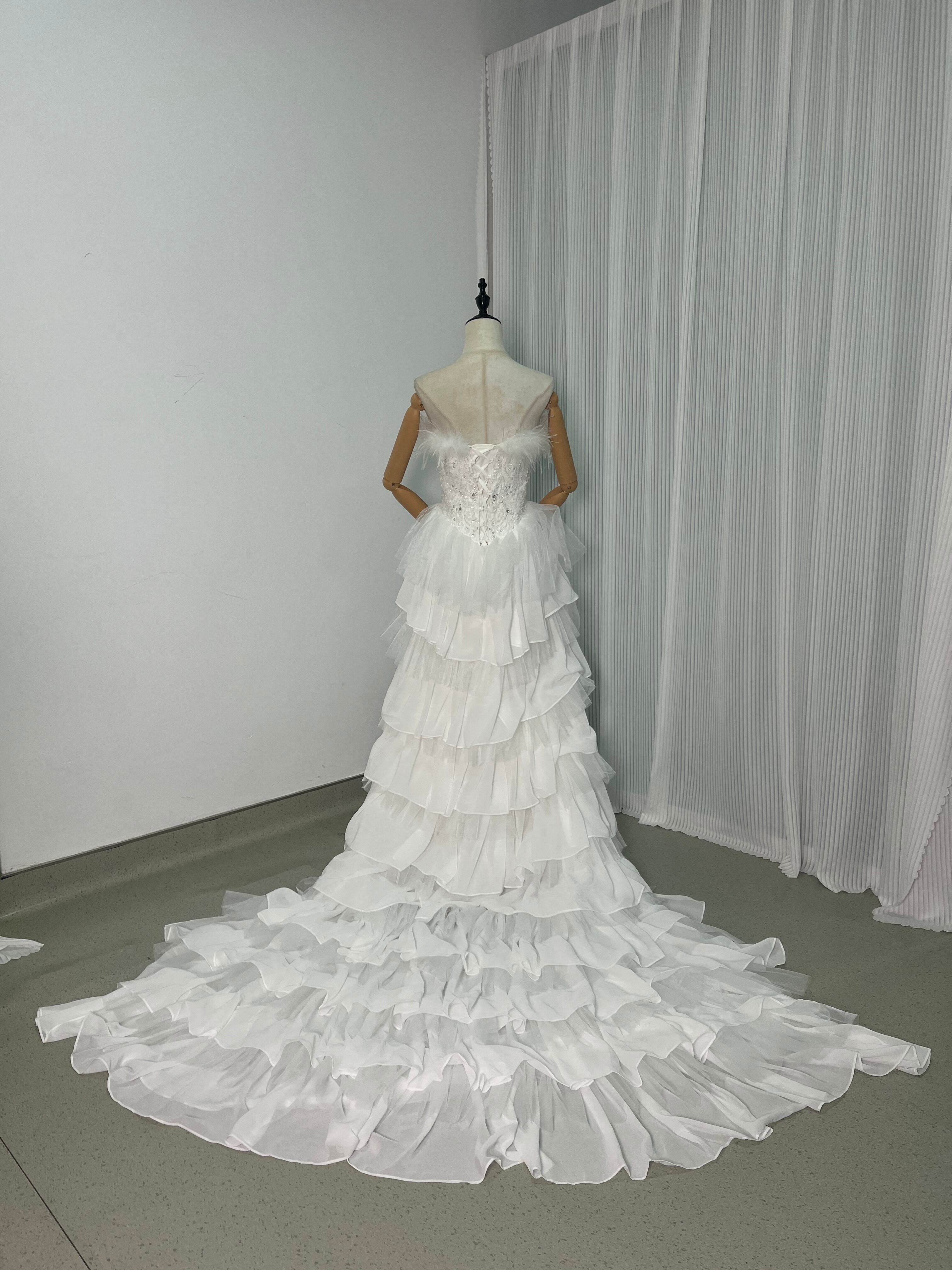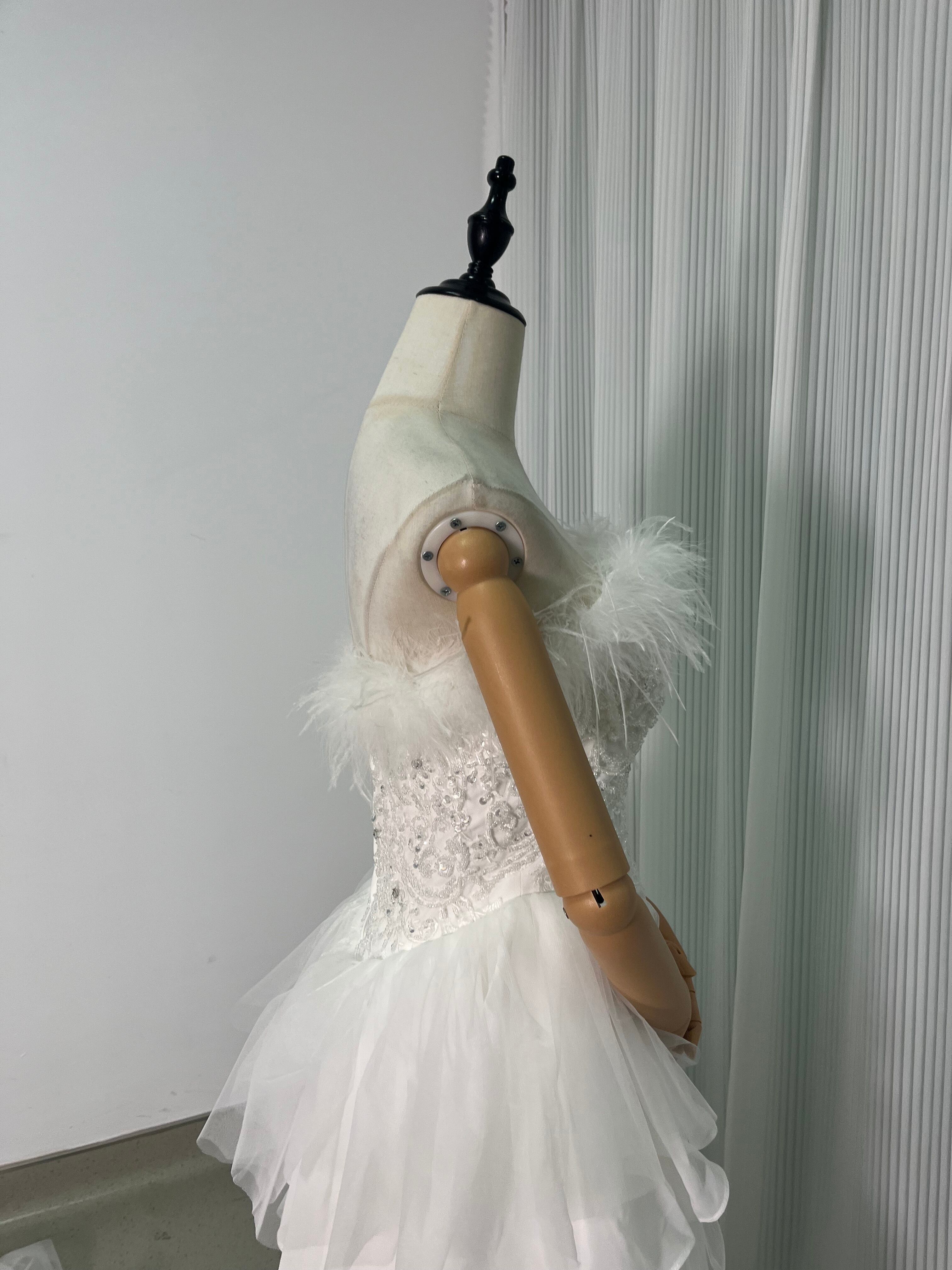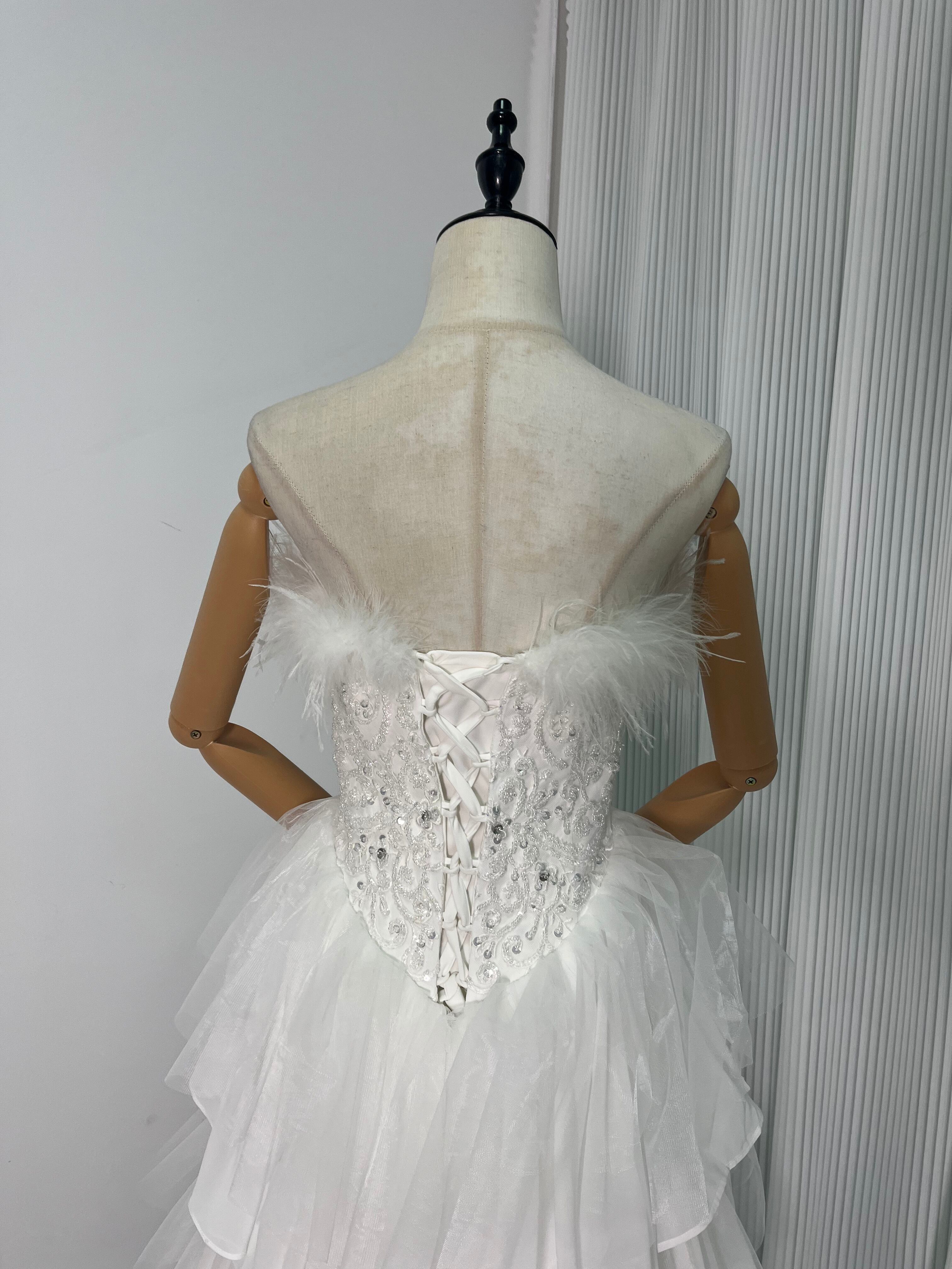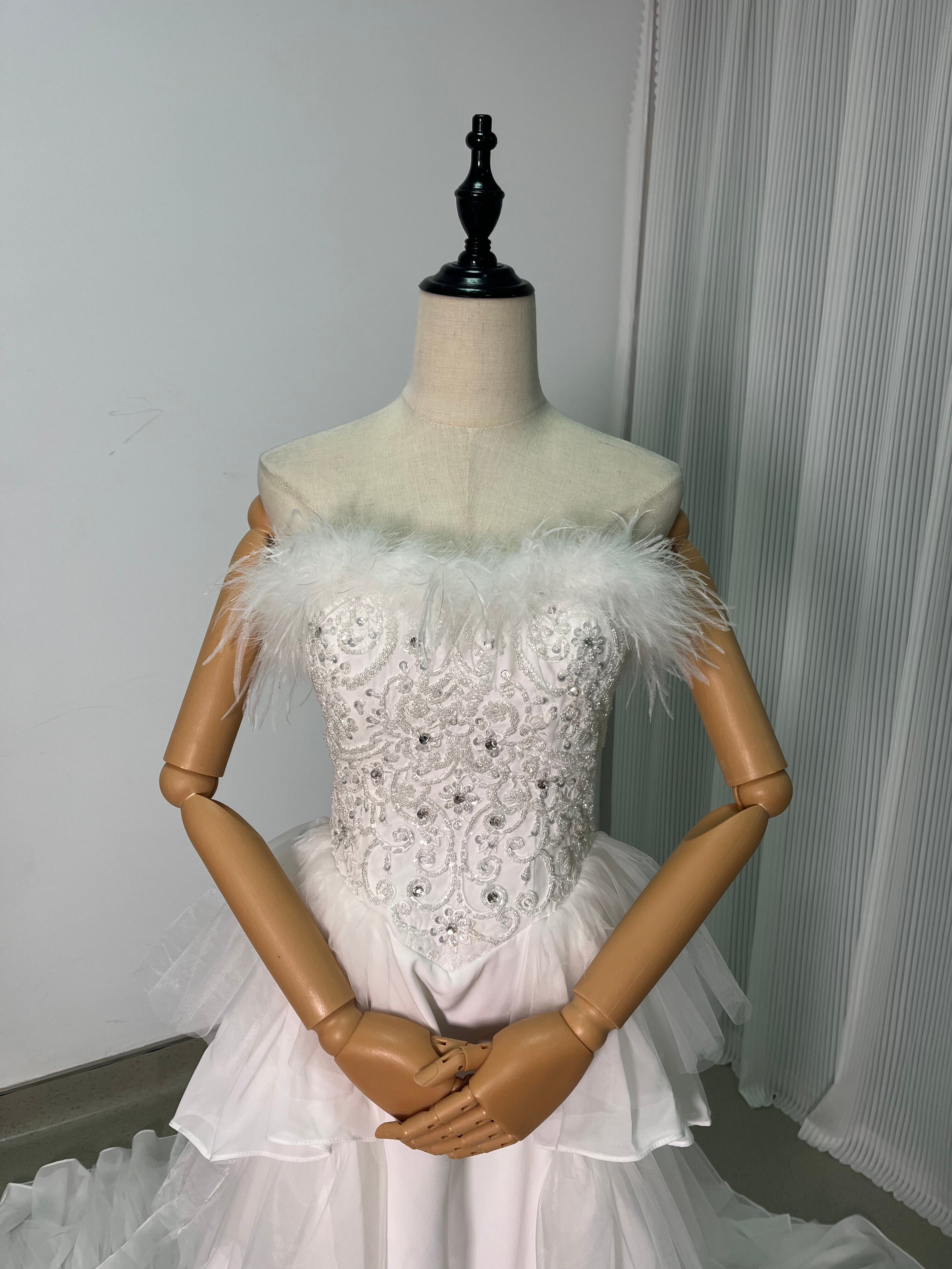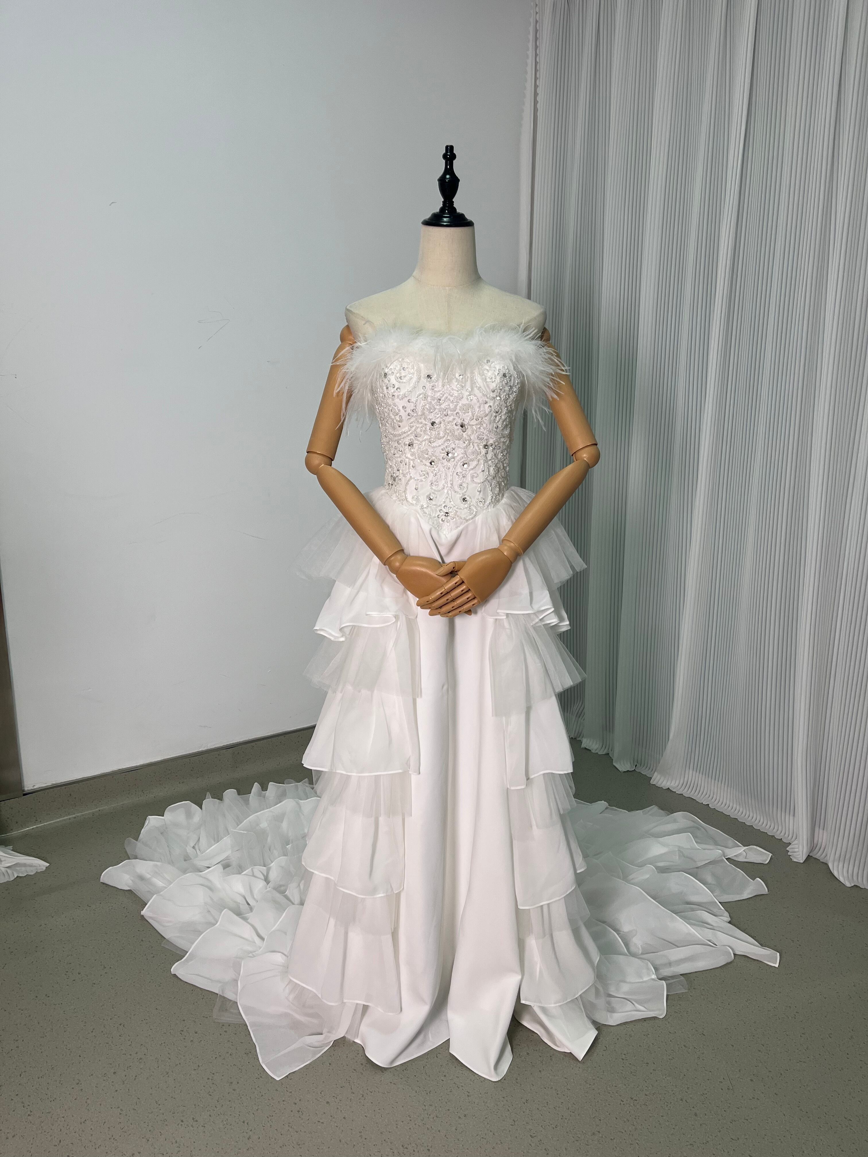 ウェディングドレス フェザードレス ビジュードレス ふんわりシフォン ソフトチュール 編み上げ デザイン感