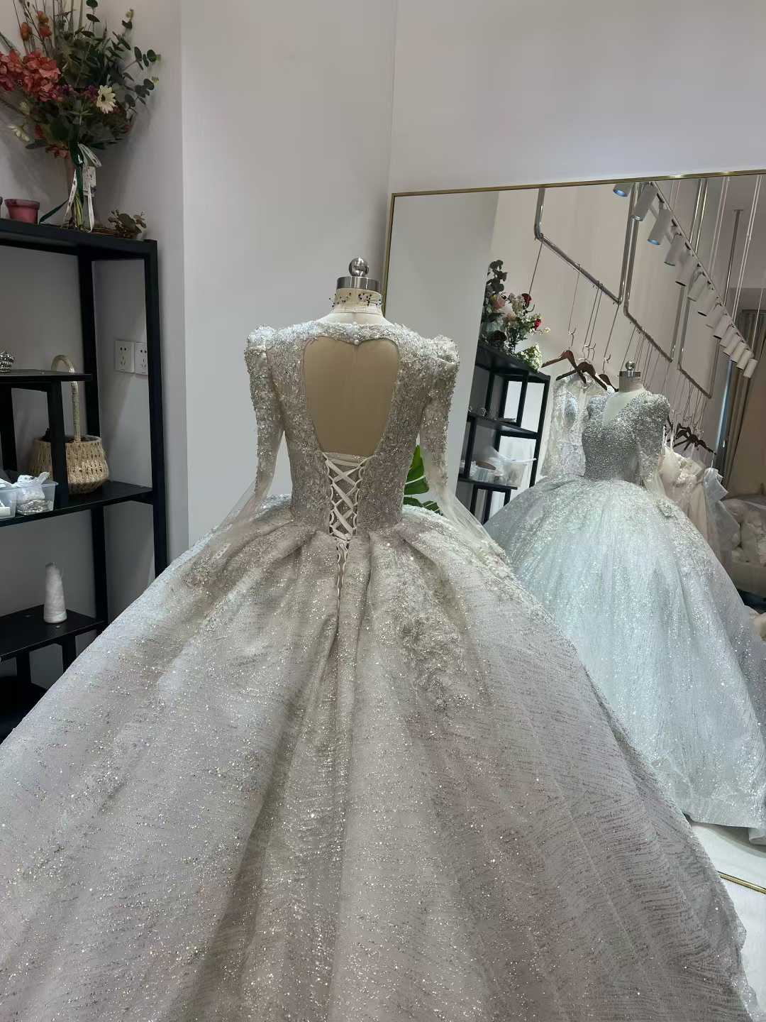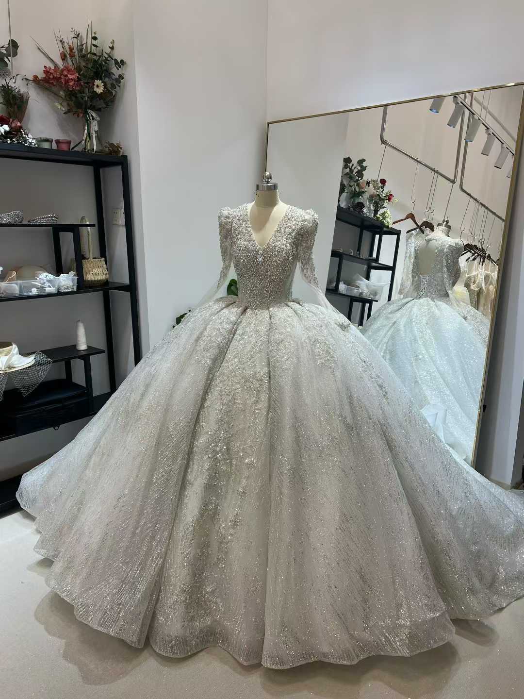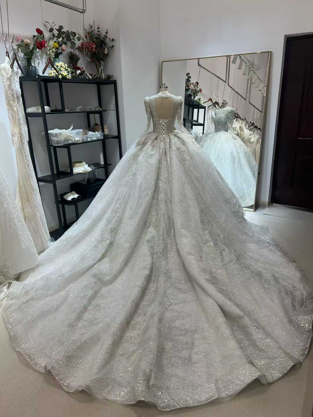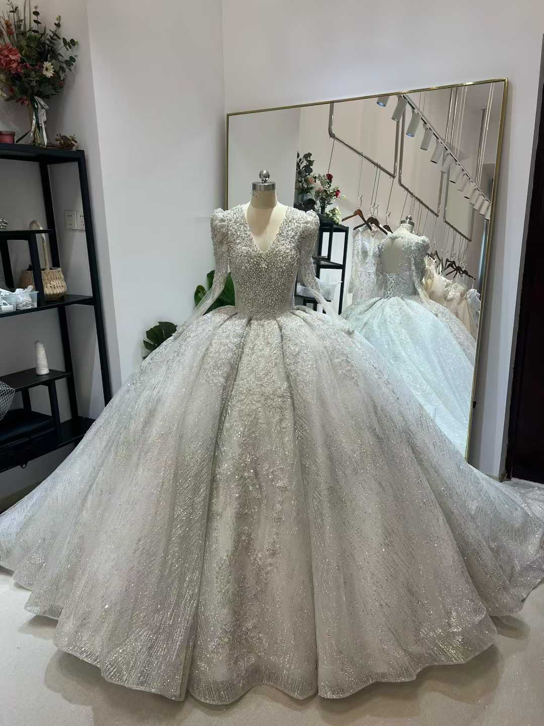 ウェディングドレス 韓国風ドレス ロングスリーブ Vネック 編み上げ キラキラチュール 3D立体レース刺繍 憧れのドレス