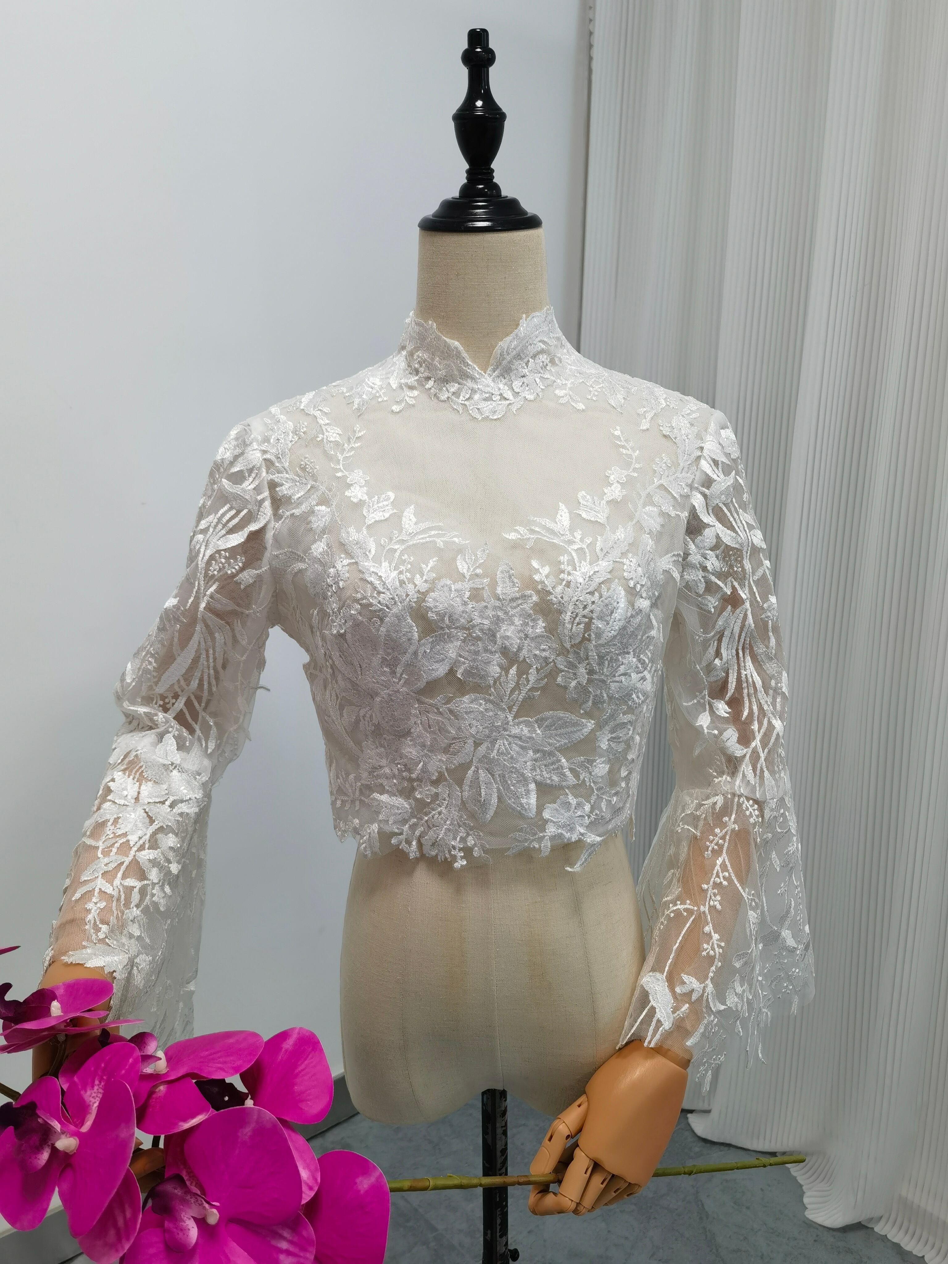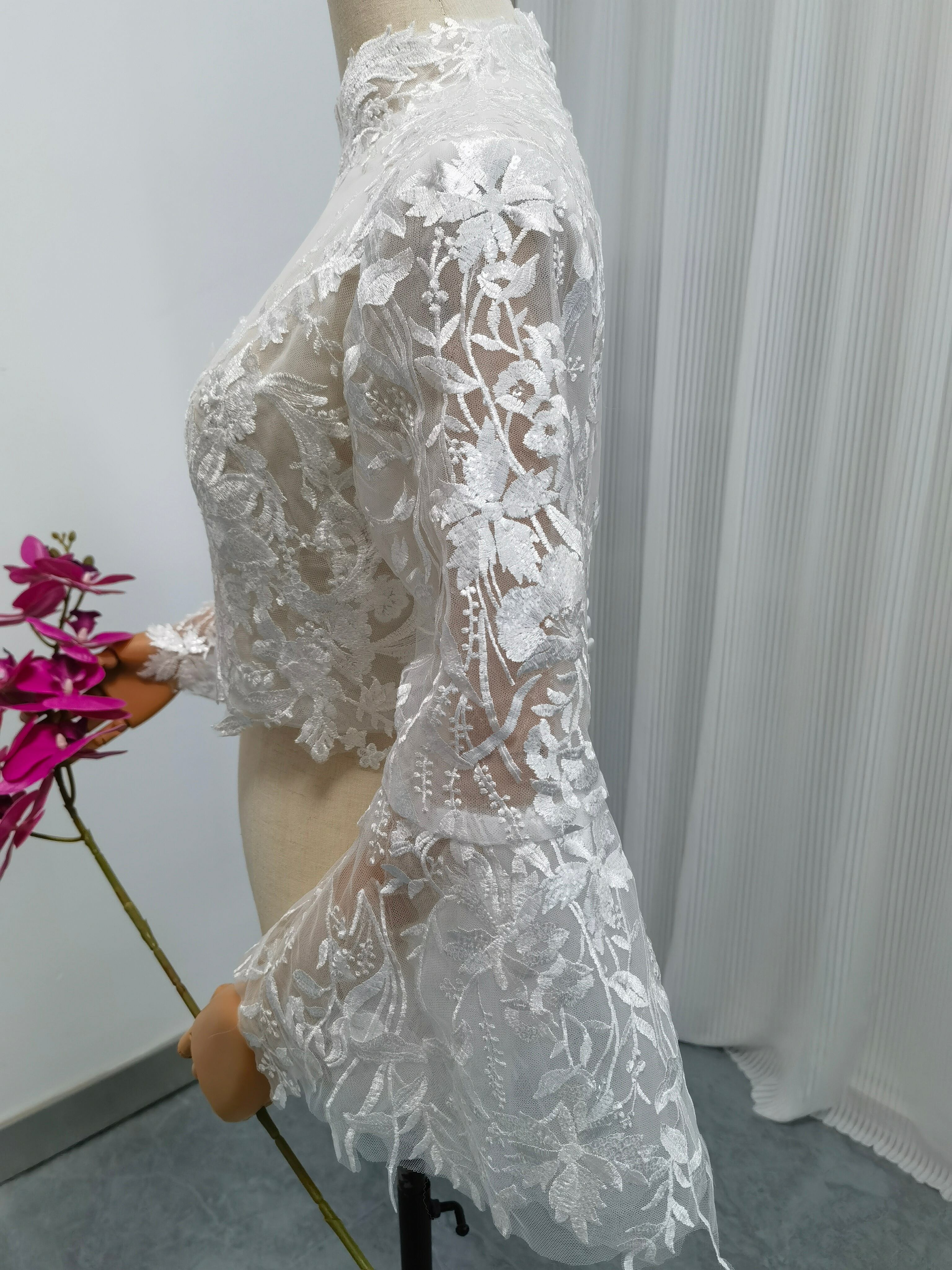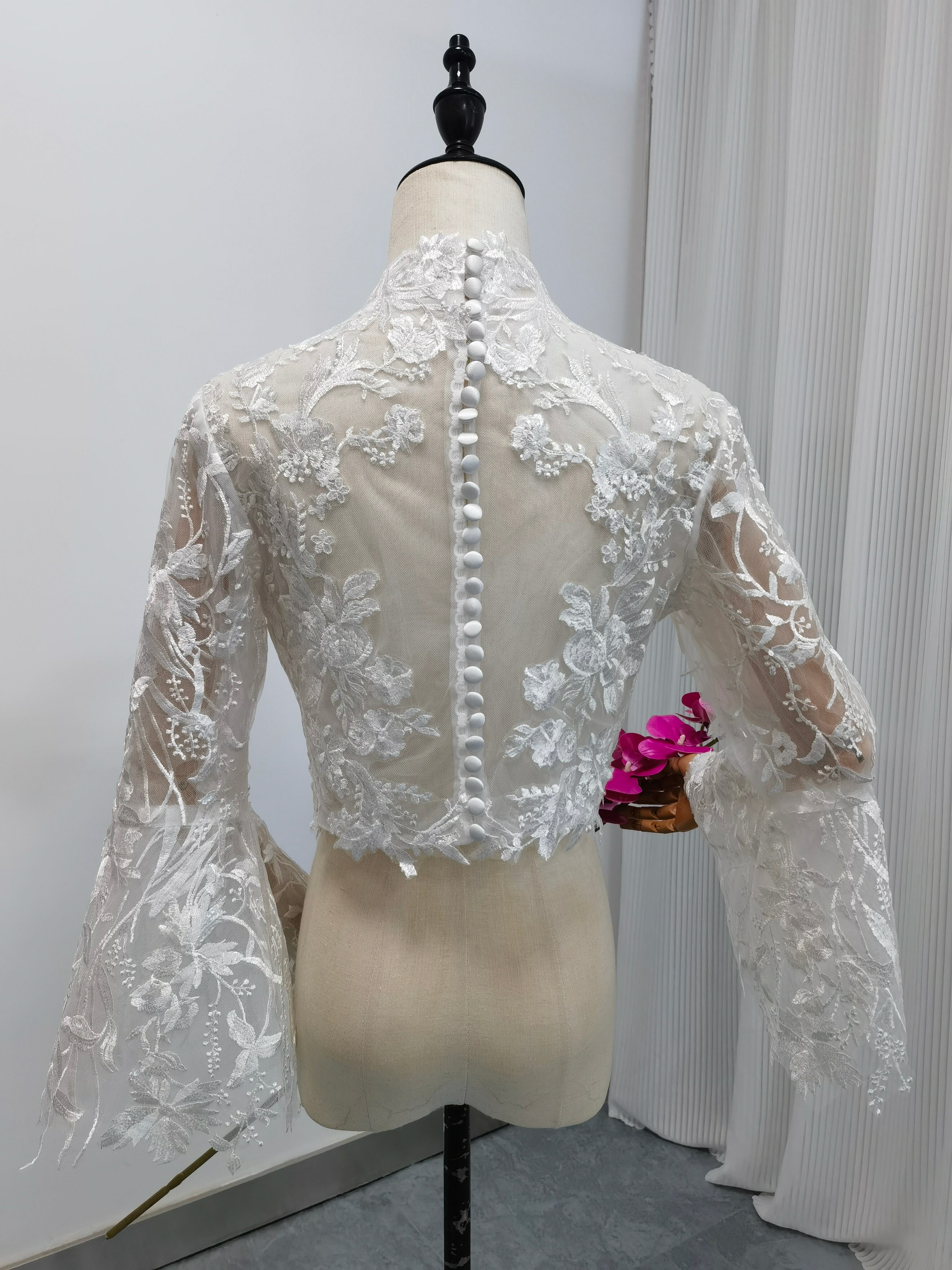 ボレロ フレア袖 花柄のモチーフ刺繍が美しく くるみボタン ウェディングドレス