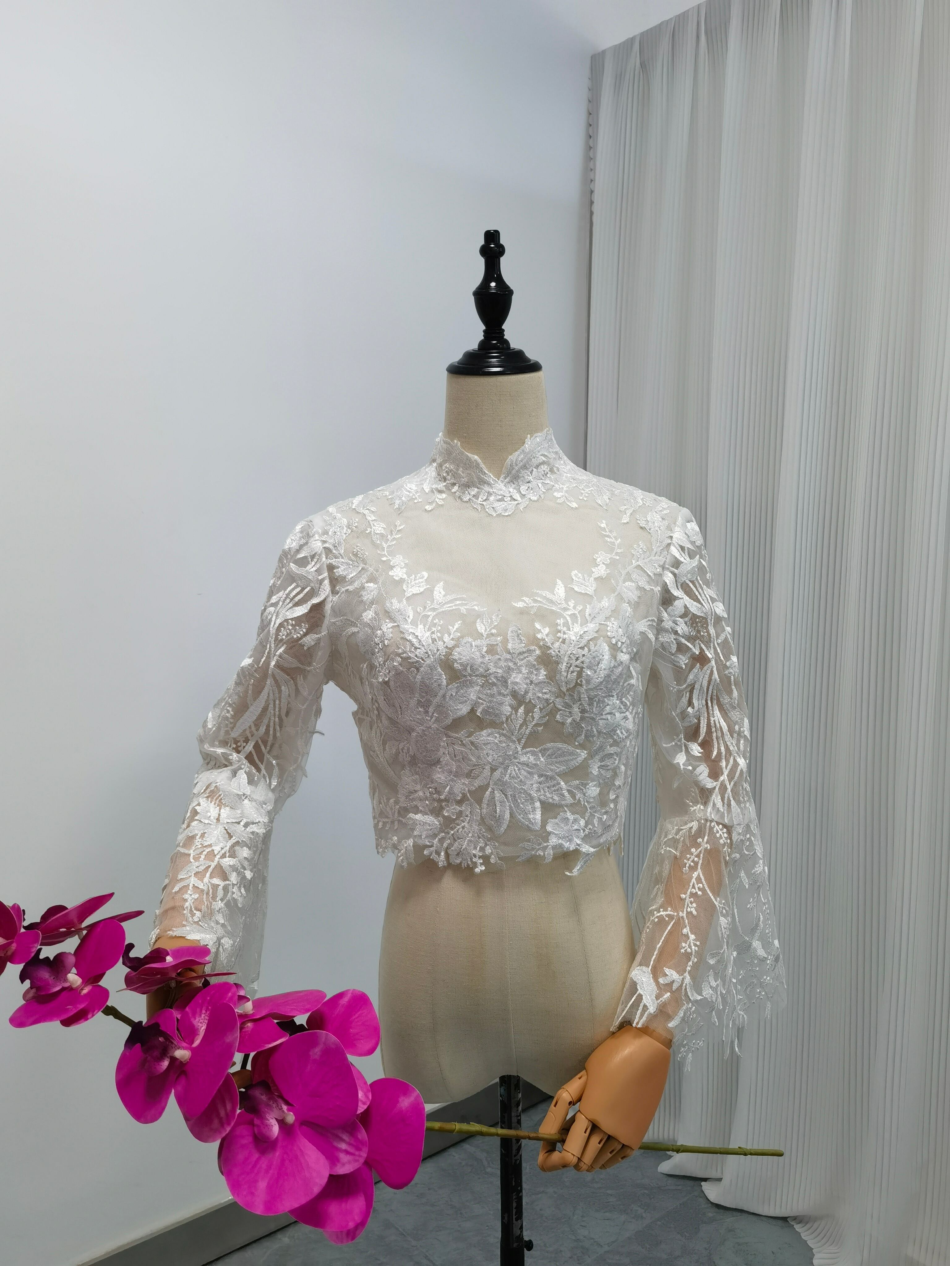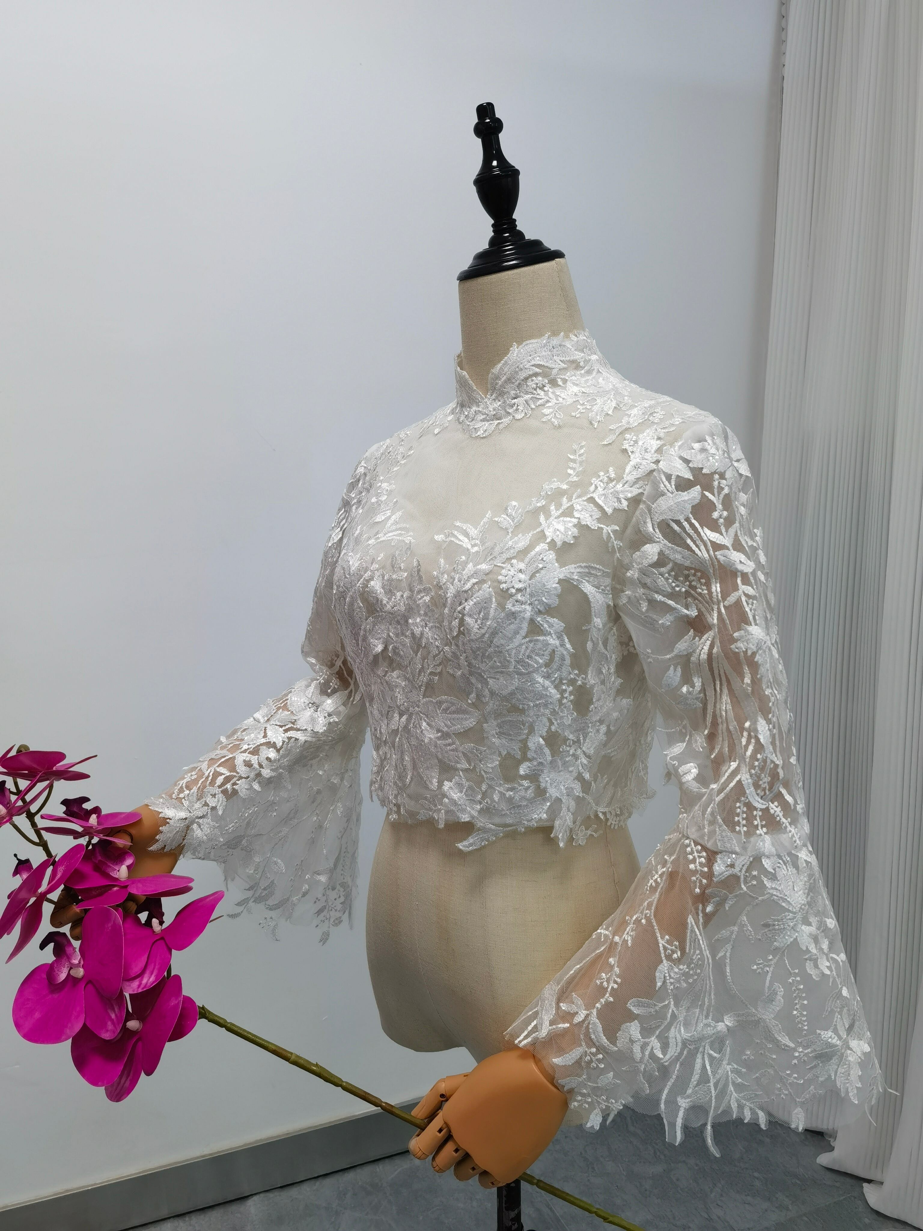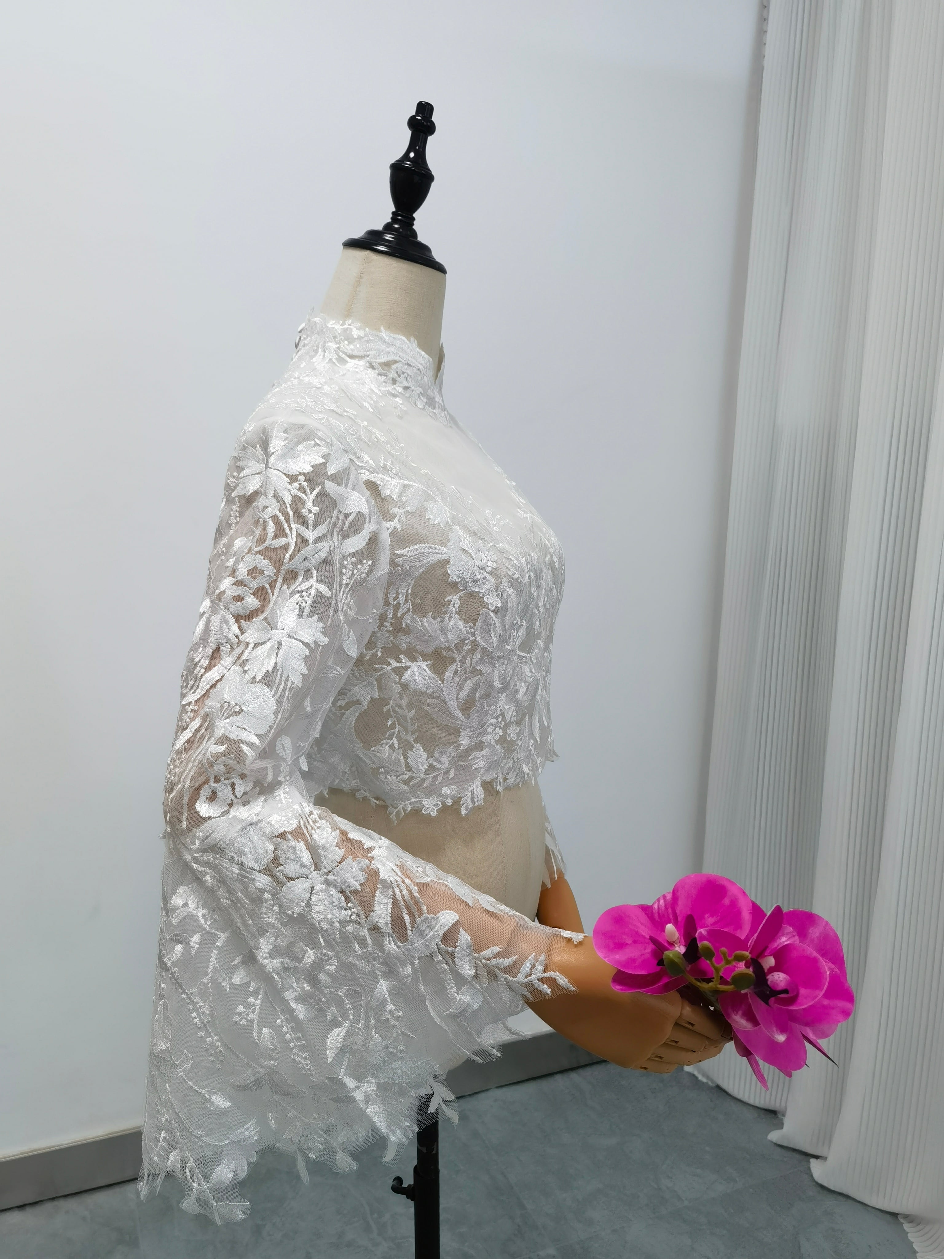 ボレロ フレア袖 花柄のモチーフ刺繍が美しく くるみボタン ウェディングドレス
