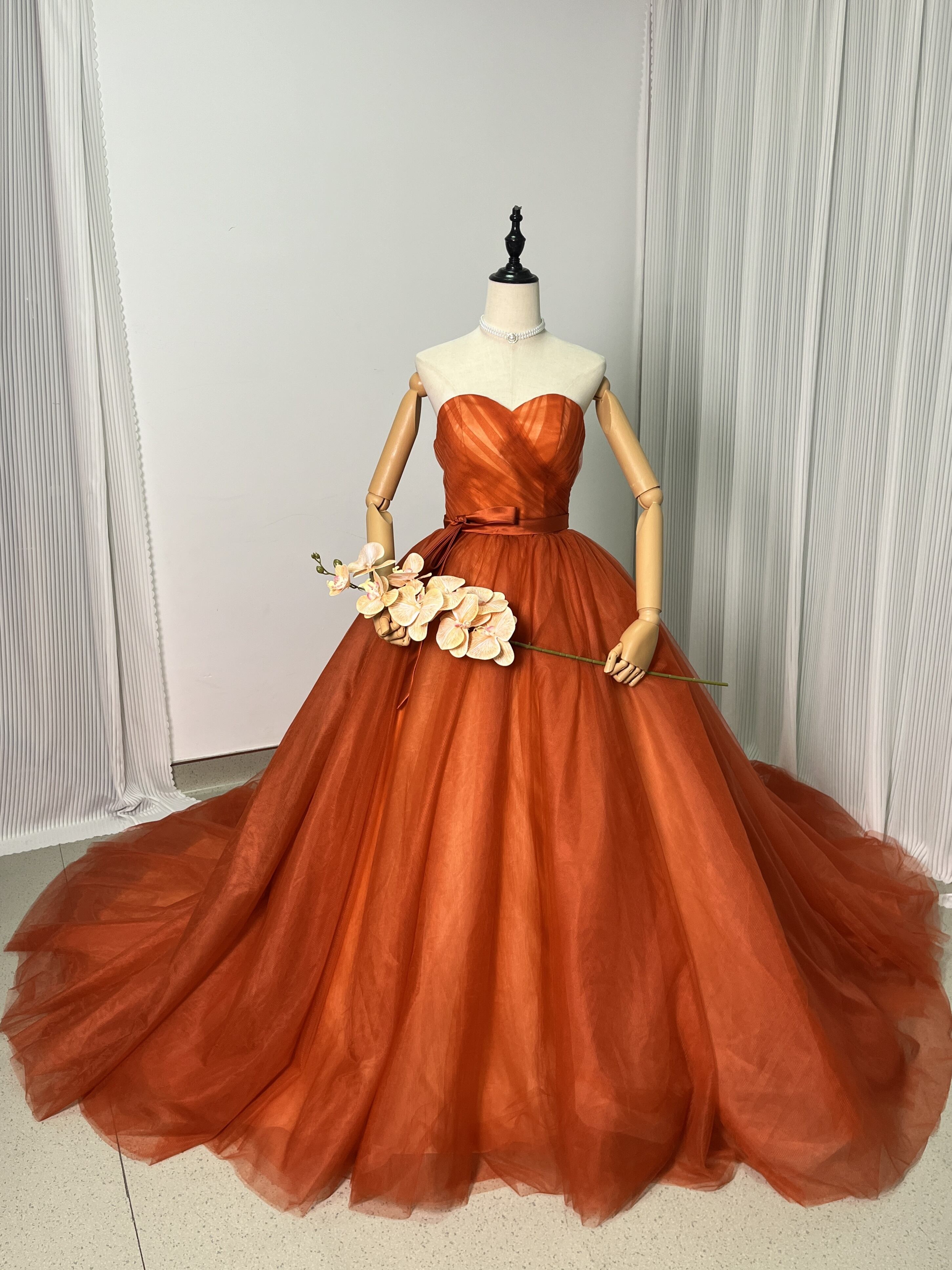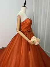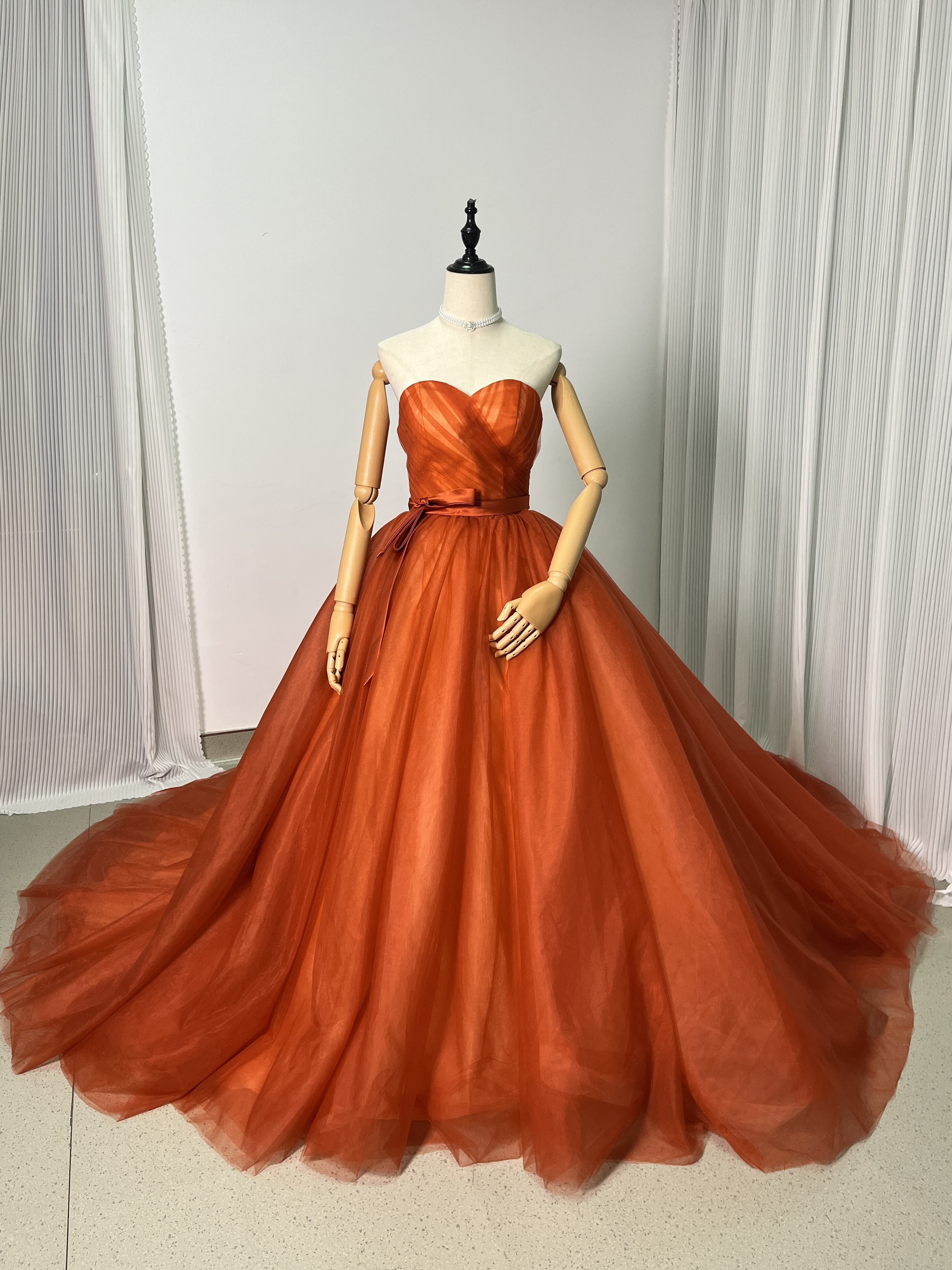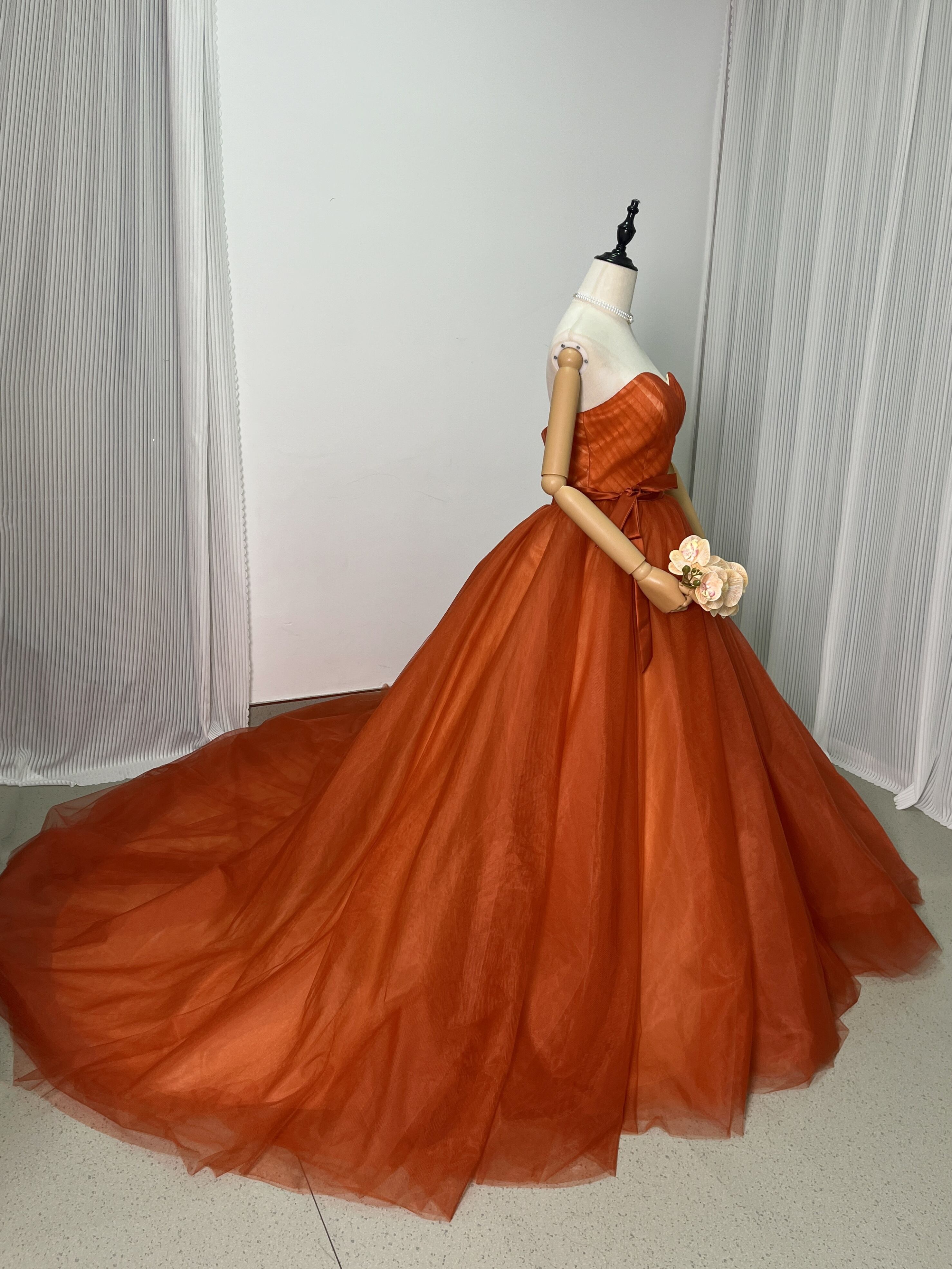 カラードレス テラコッタ色 ベアトップ Aライン ベアトップ 目立つ 派手な ふわふわドレス