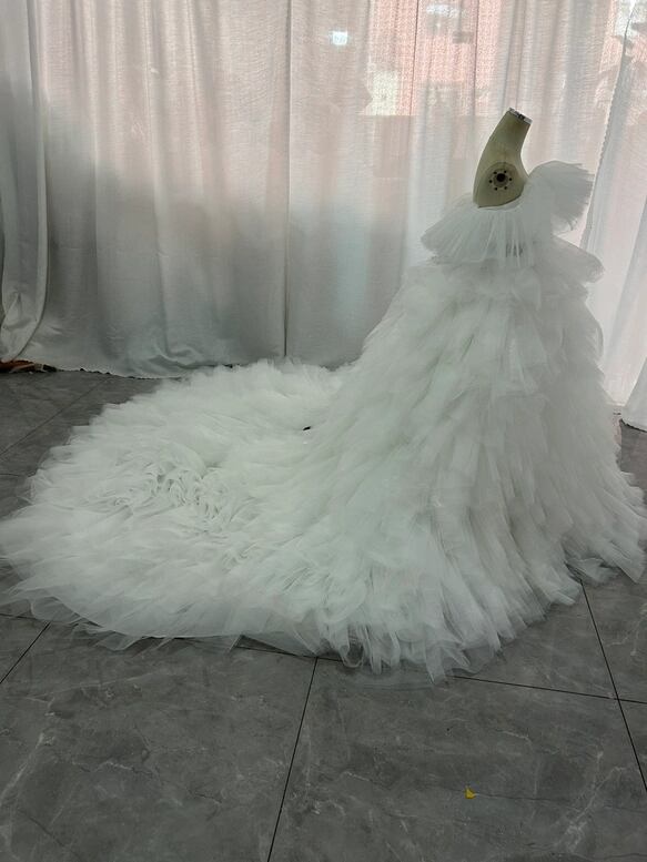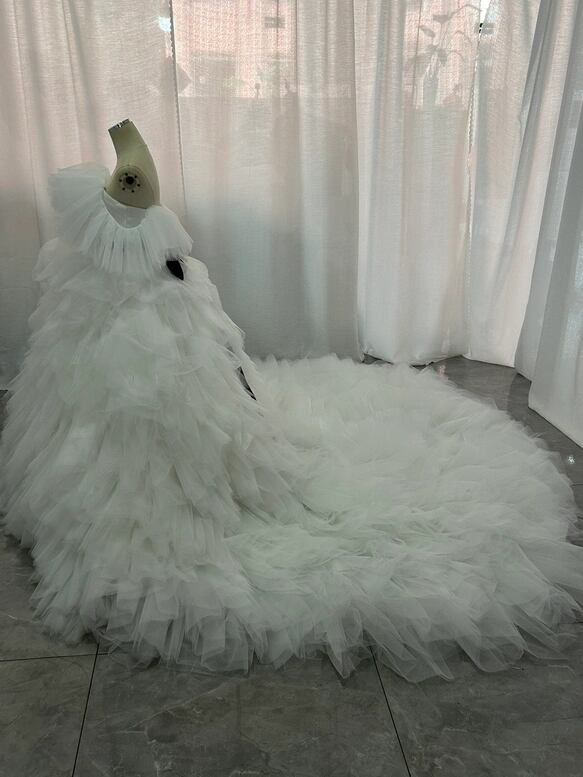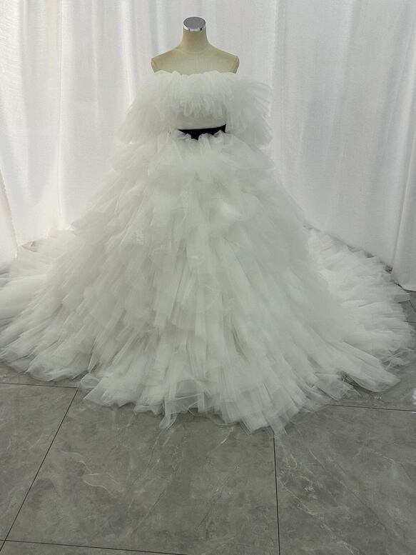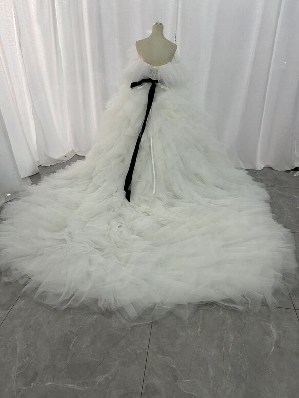 韓国風 ウェディングドレス もこもこドレス オフホワイト サッシュベルト 編み上げ ロングトレーン 花嫁