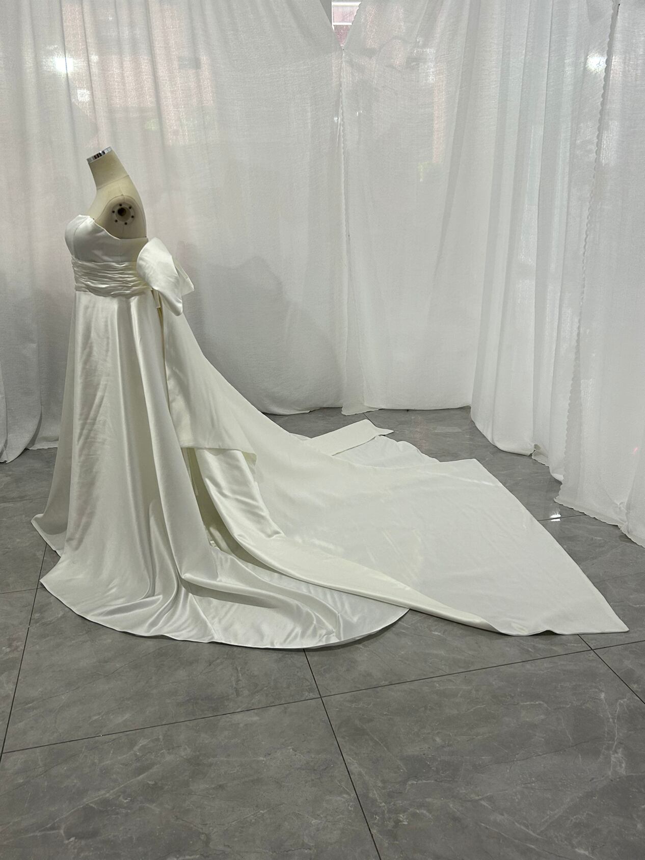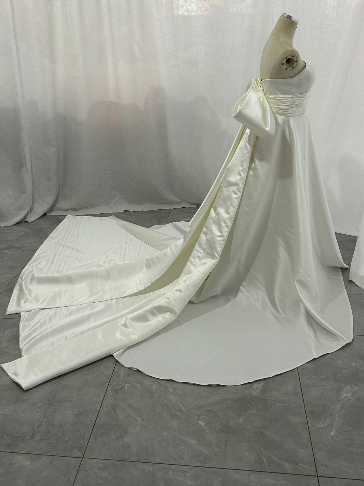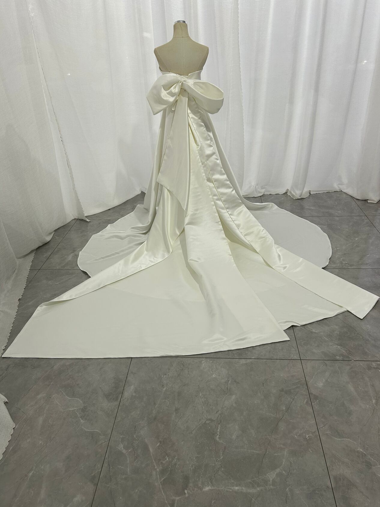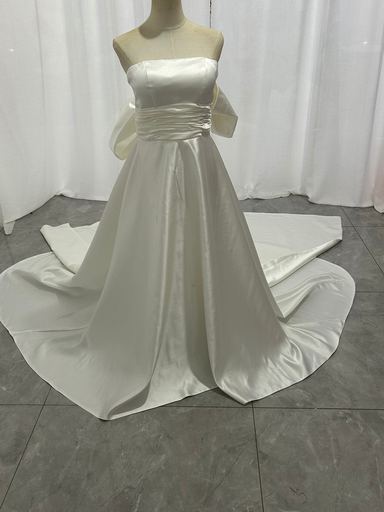 ウエディングドレス オフホワイト ふっくら柔らかなバックリボン 光沢サテン ベアトップ ロングトレーン 花嫁