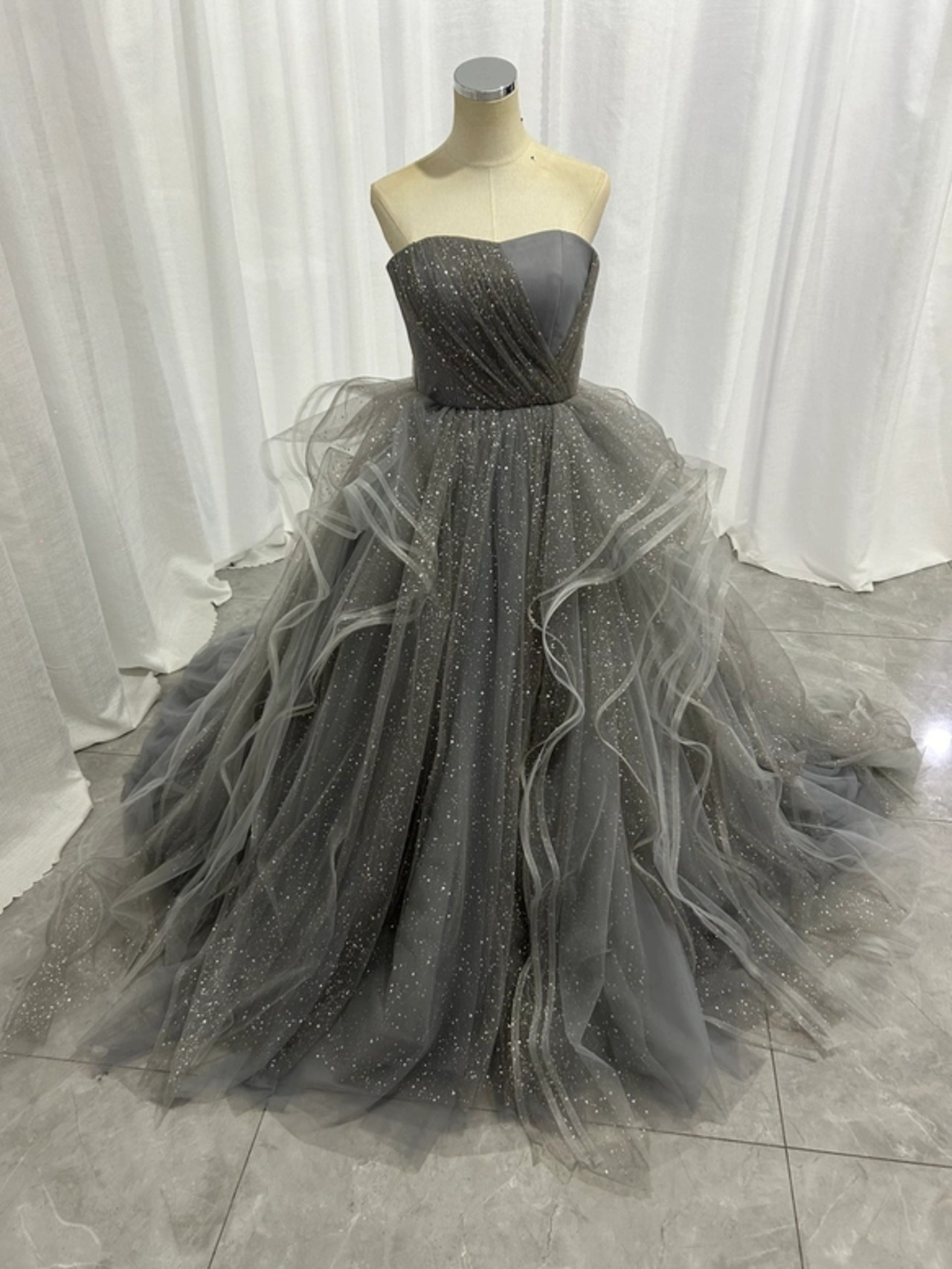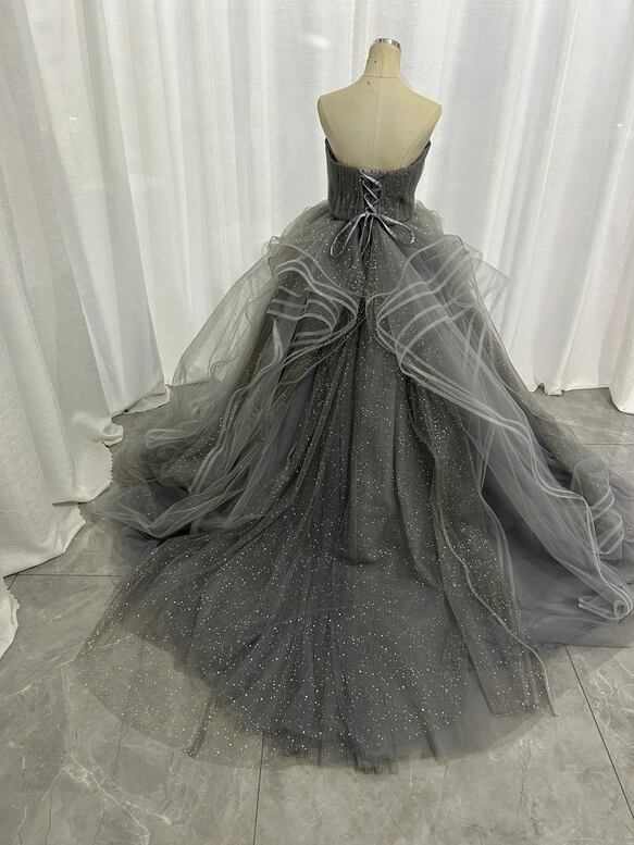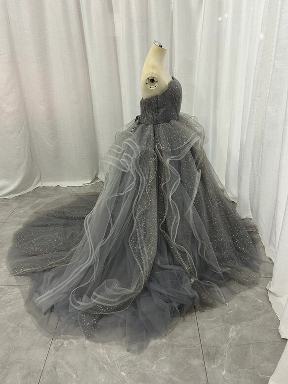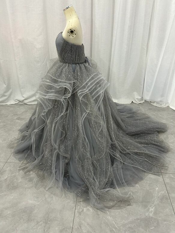 グレー カラードレス韓国風ドレスキラキラチュール もこもこフリルドレス柔らかく重ねたチュール 結婚式