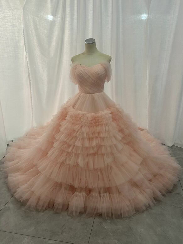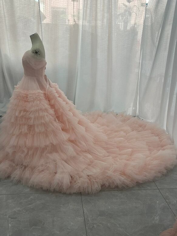 ピンク カラードレス 韓国風ドレス チュールドレス もこもこフリルドレス ボリュームドレスボリューミー華やかなトレーン