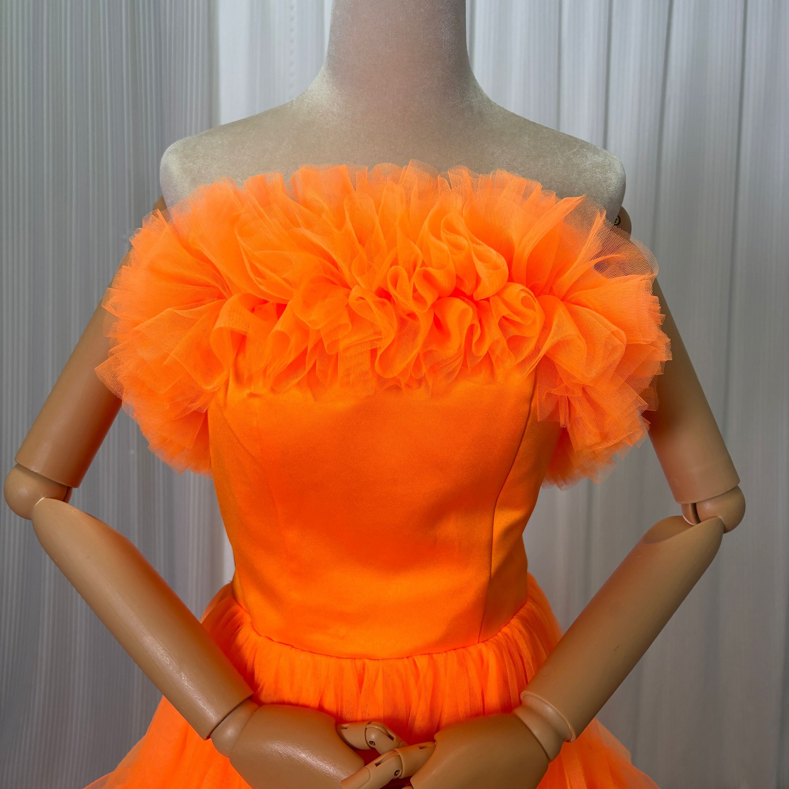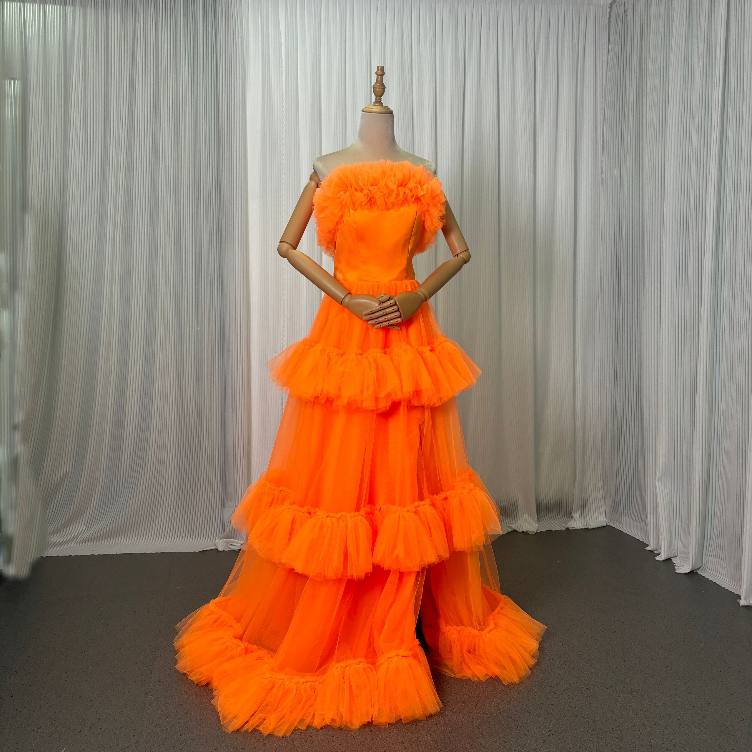 カラードレス オレンジ ベアトップ 編み上げ ロング フロントスリット 抜群におしゃれ度が際立つ 2次会