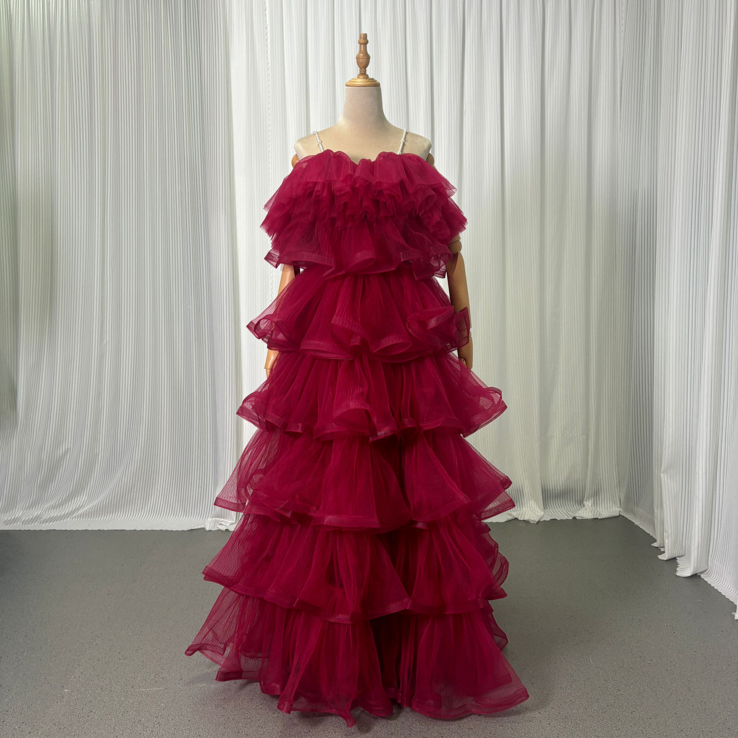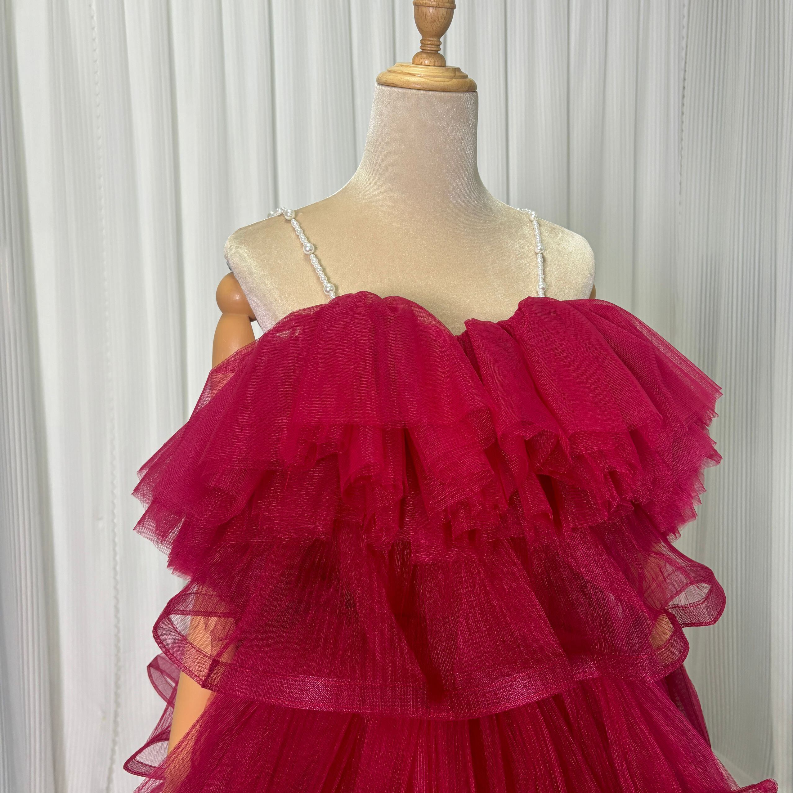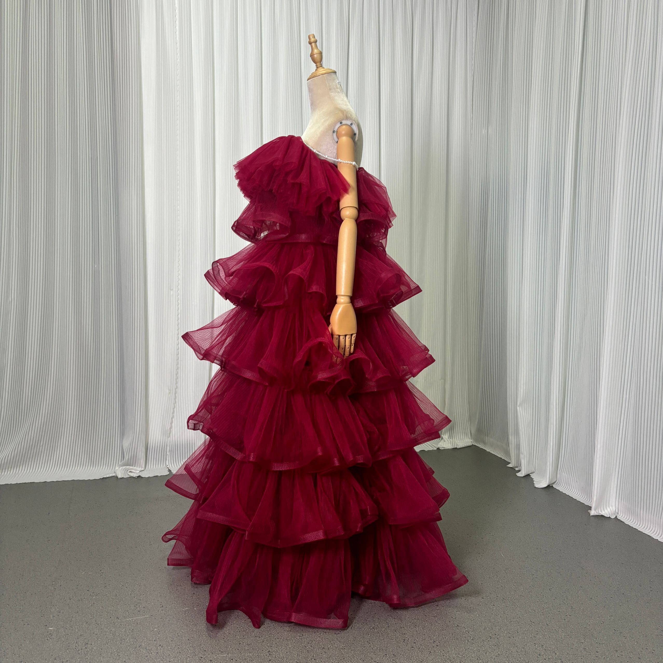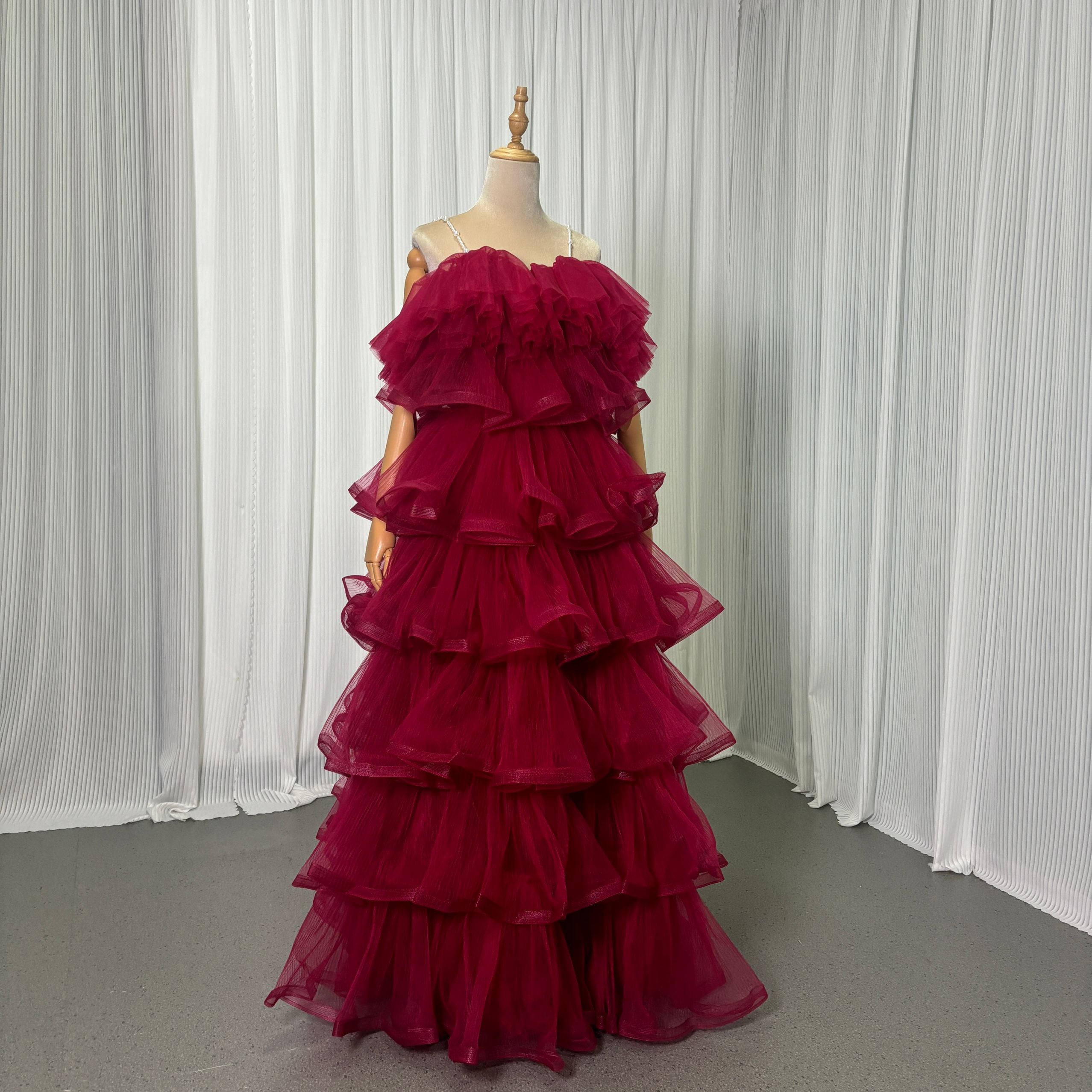 カラードレス キャミソール ビーズ えんじ色 ティアードのドレス ラッフルフリル 前撮り 二次会 ロング
