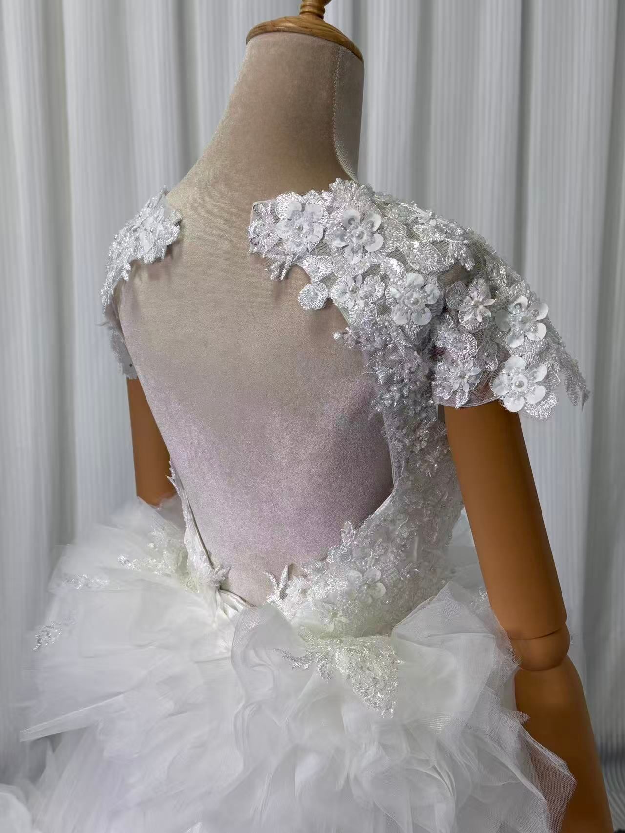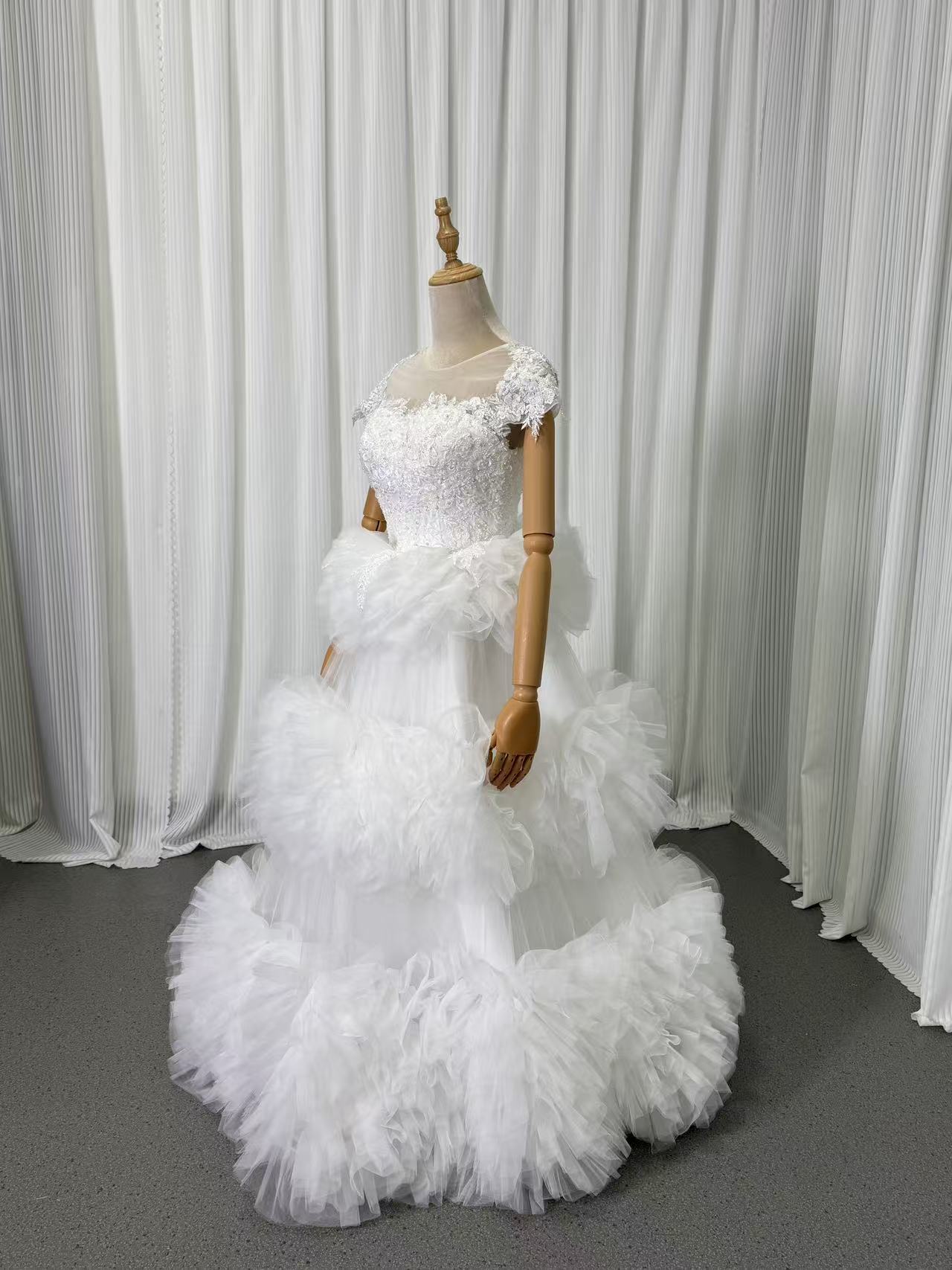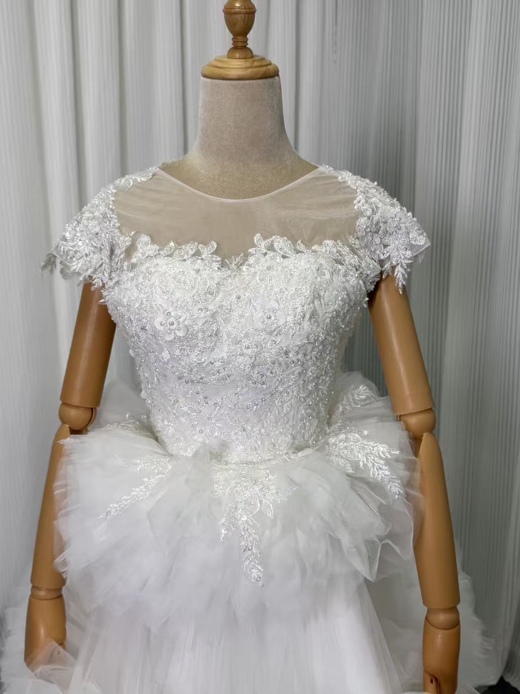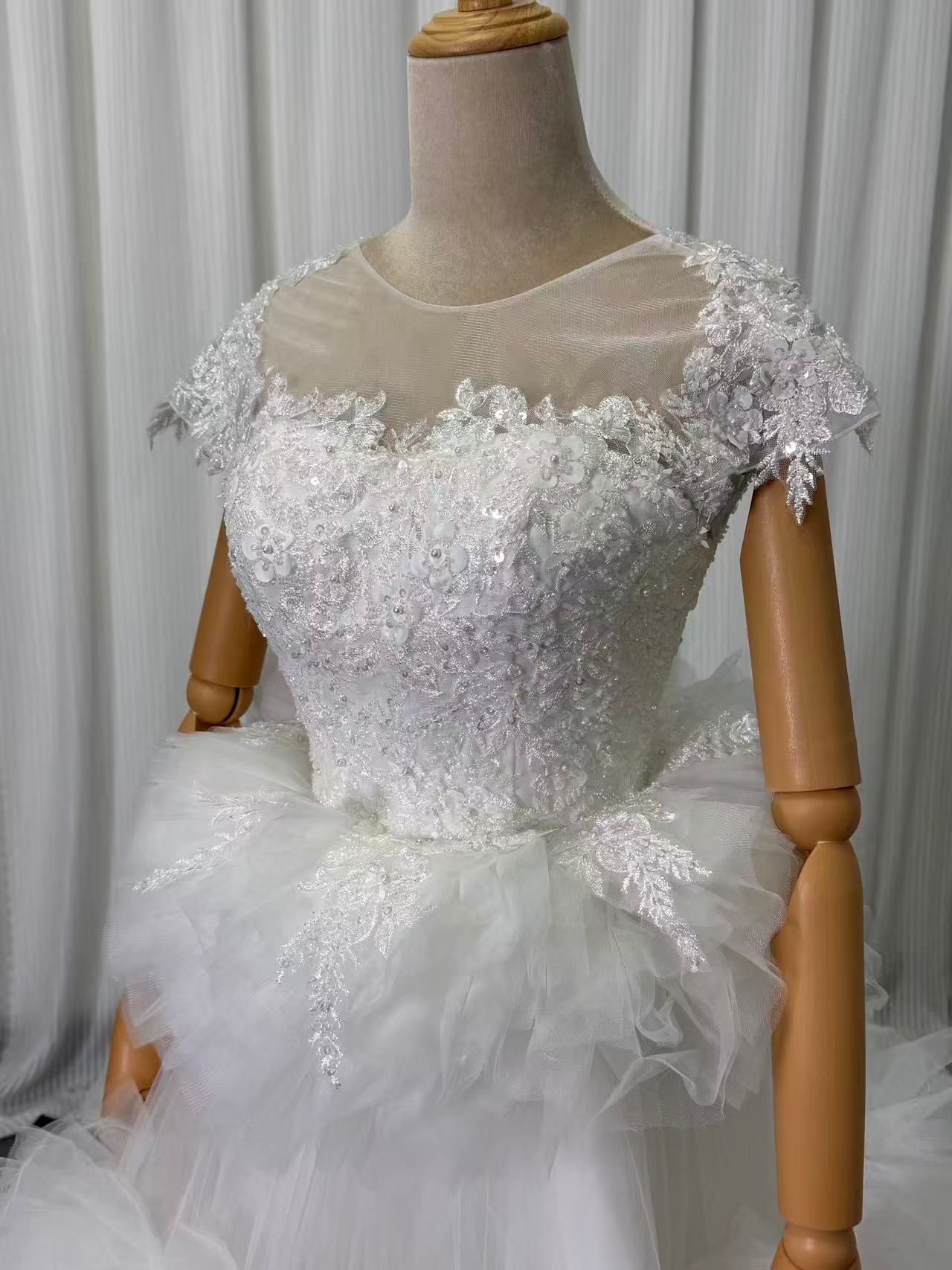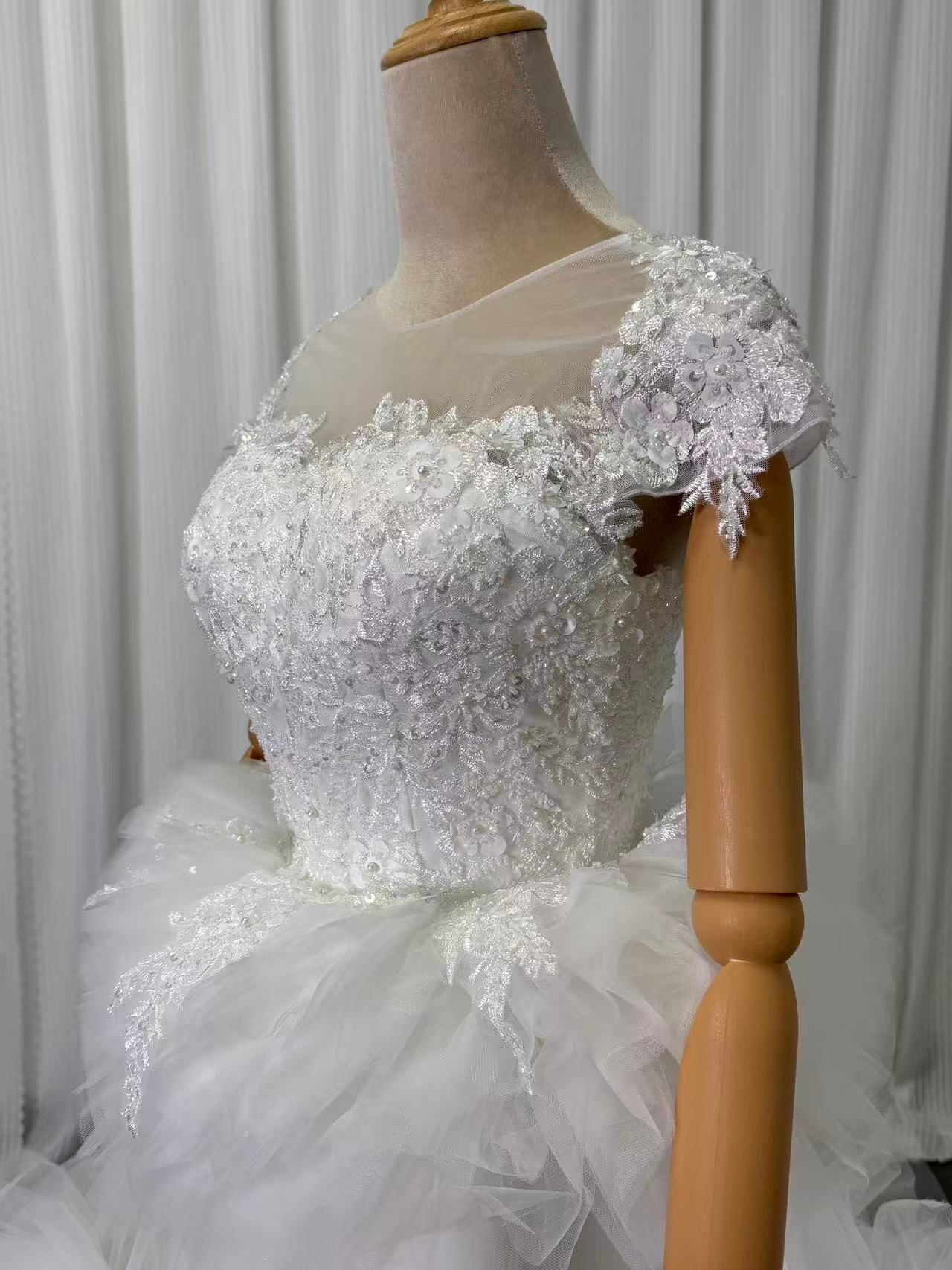 ウェディングドレス フレンチスリーブ ふわふわドレス バックレス ロング ブライダル 3D立体レース刺繍