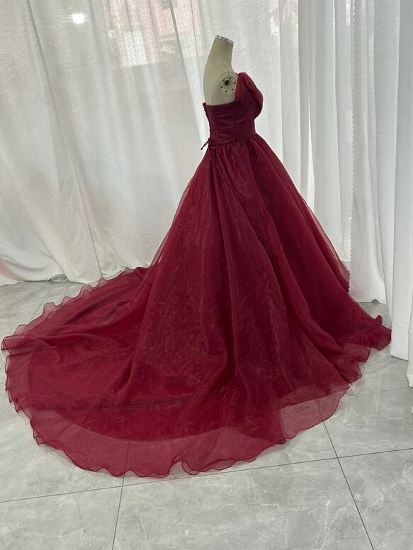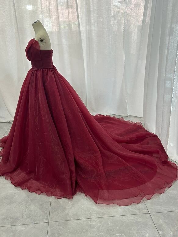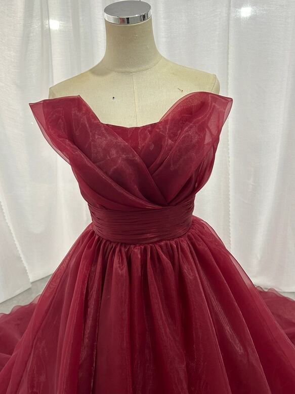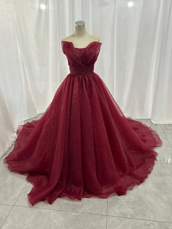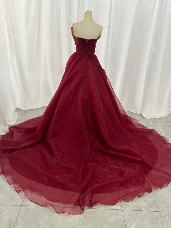 カラードレス ワインレッド ベアトップ 上質オーガンジー 大人っぽい ロングトレーン 披露宴