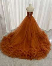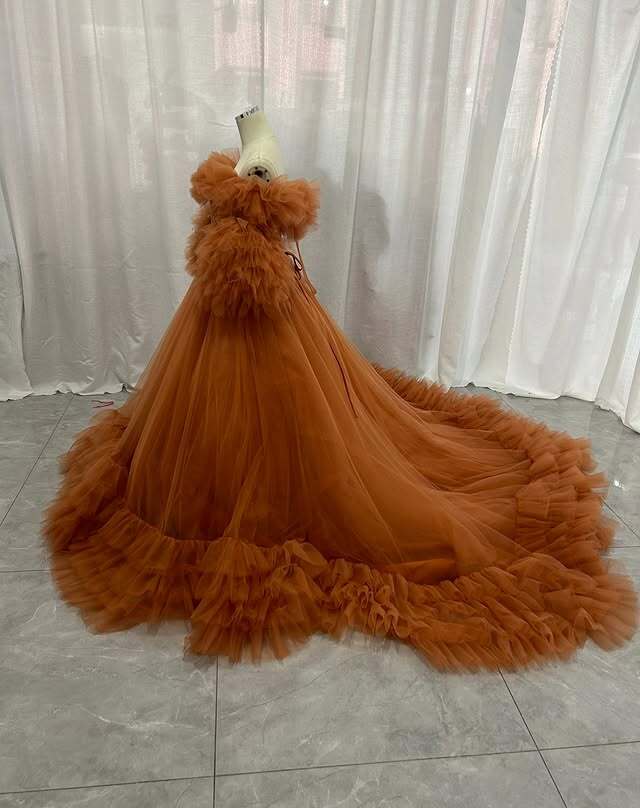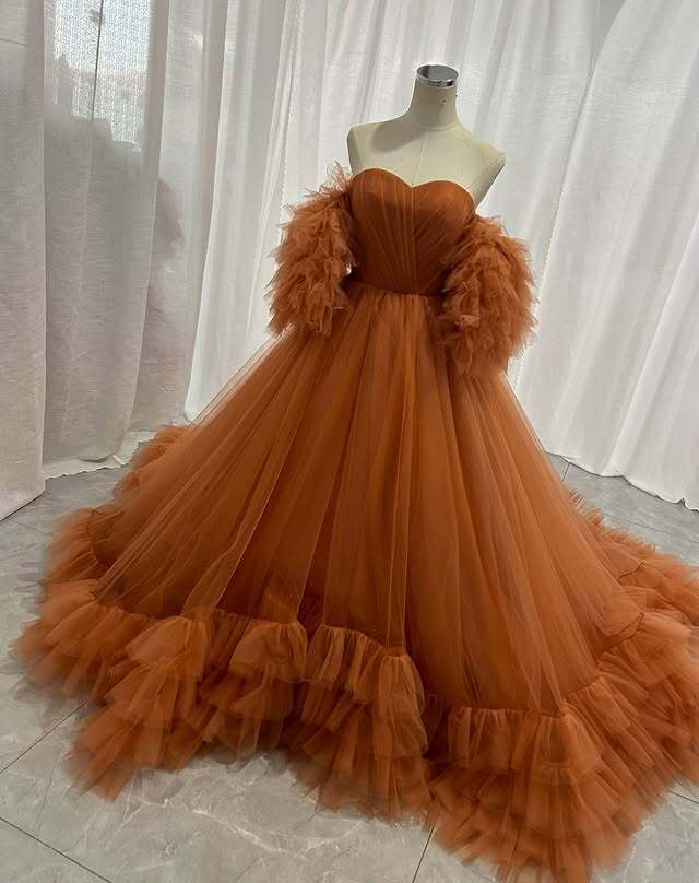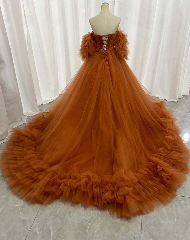 実例写真!カラードレス パフスリーブ 披露宴/結婚式 テラコッタ色 リボントレーン 抜群のおしゃれ見え