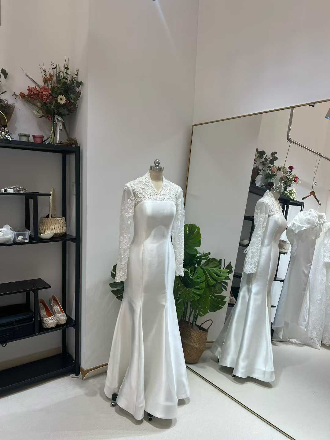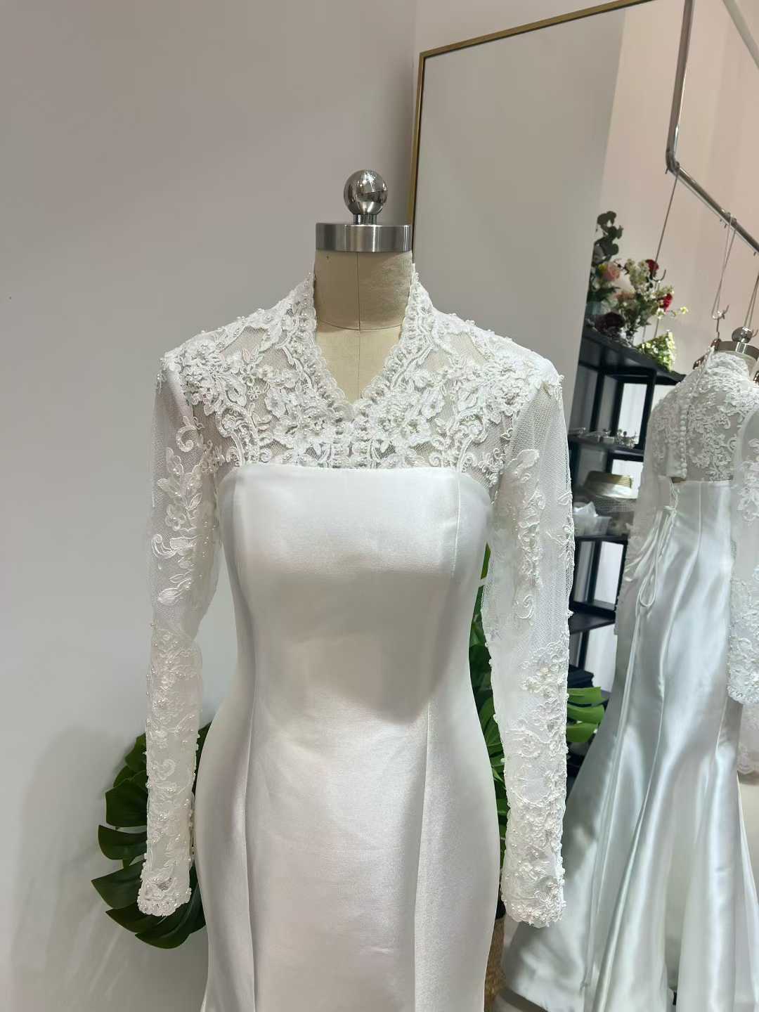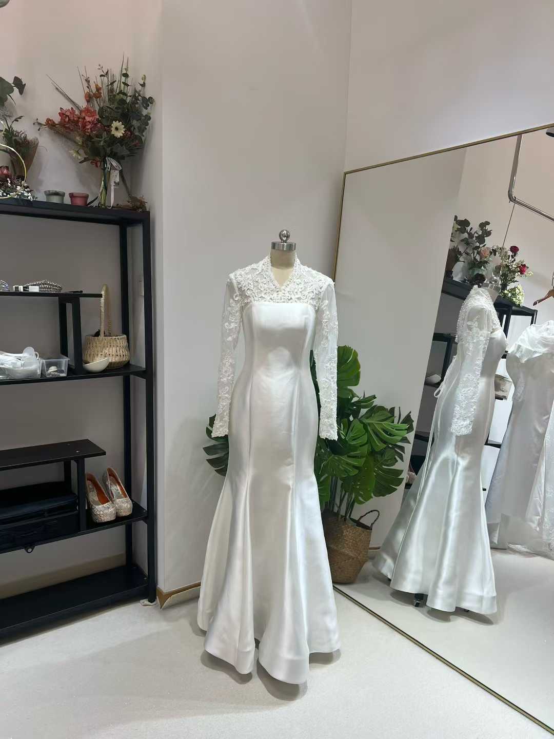 ウェディングドレス ミカドサテン ロングスリーブ マーメイドライン 床付く 結婚式 エレガント 魅惑の花レース