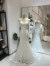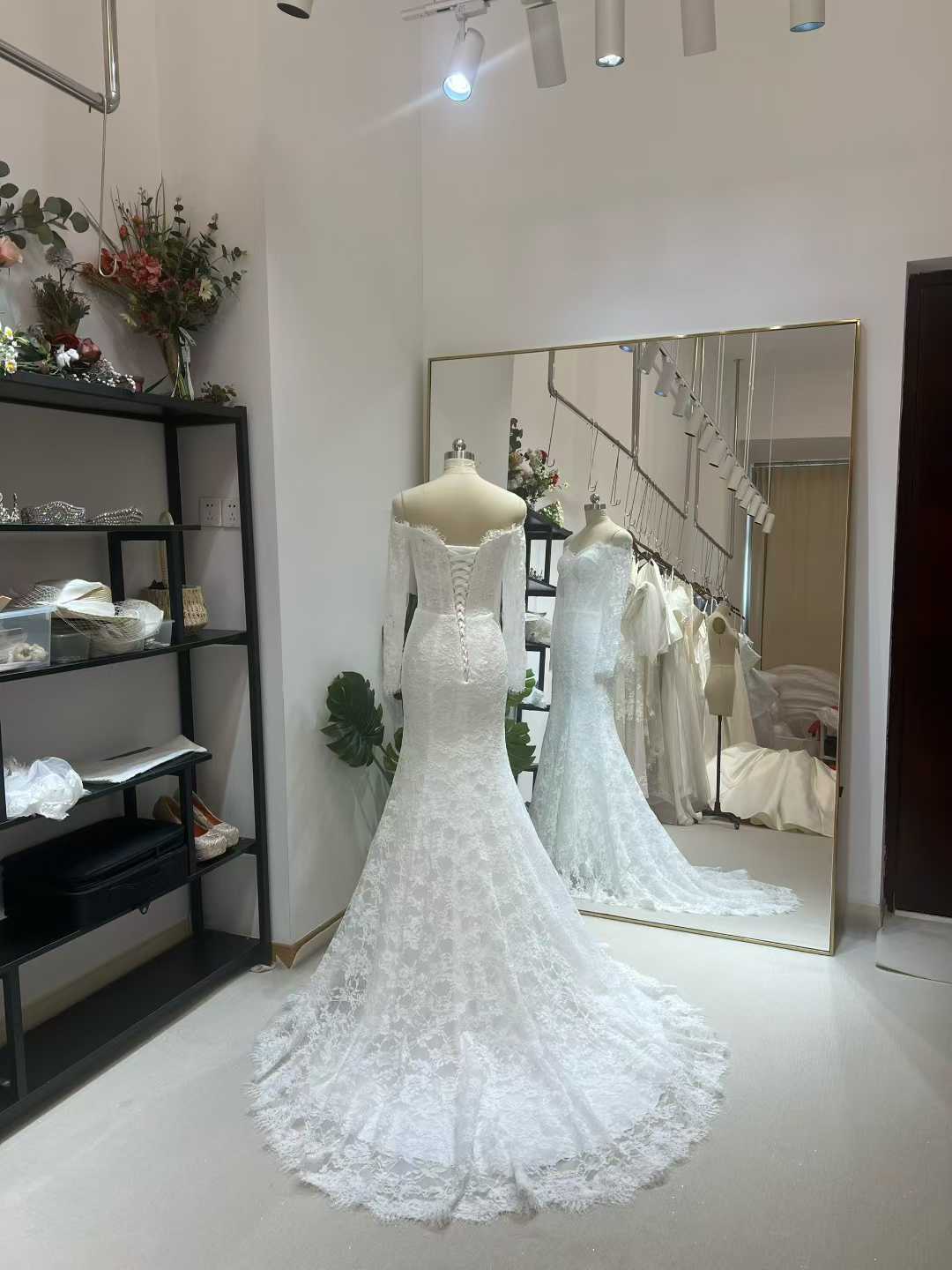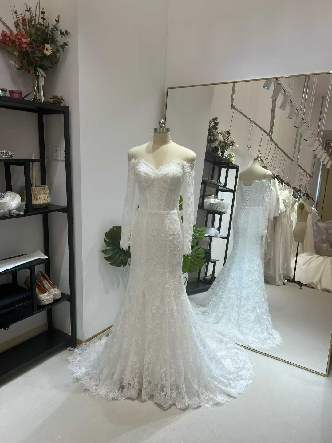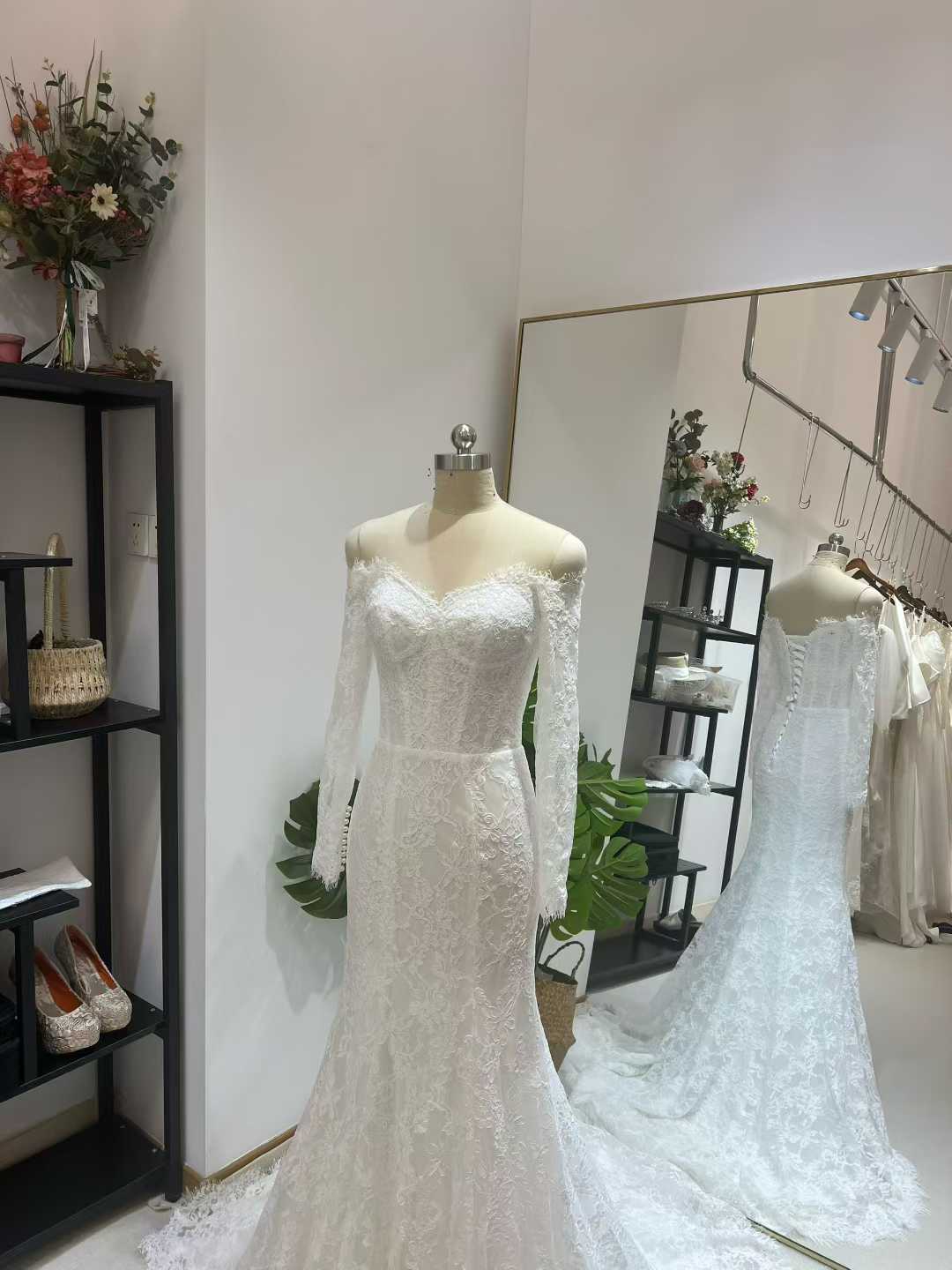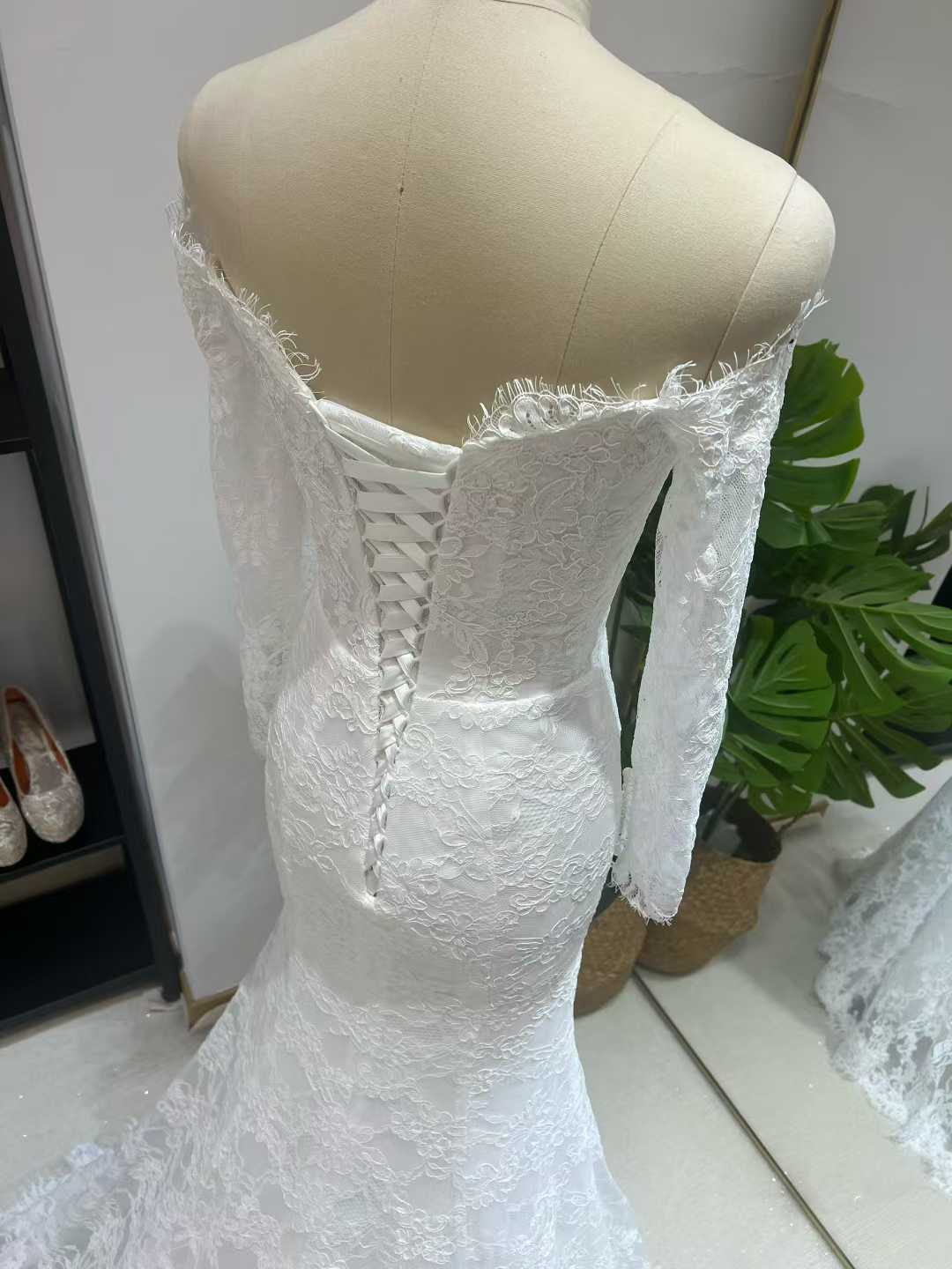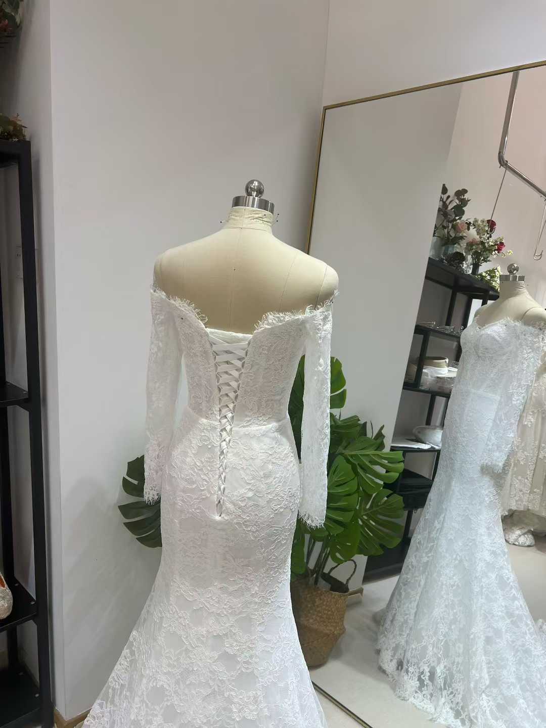 ウェディングドレス オフショルダー 贅沢な小花柄の総レース 編み上げ マーメイド 長袖 優雅なシルエット