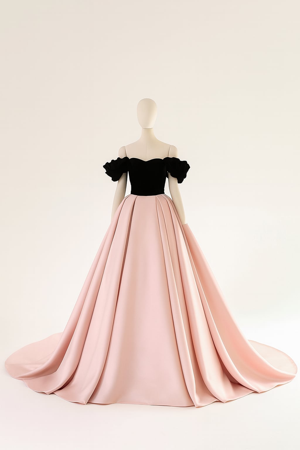 カラードレス ピンク オフショルダー 姫袖 Aライン 黒 ビロード 光沢サテン プリンセスライン 結婚式
