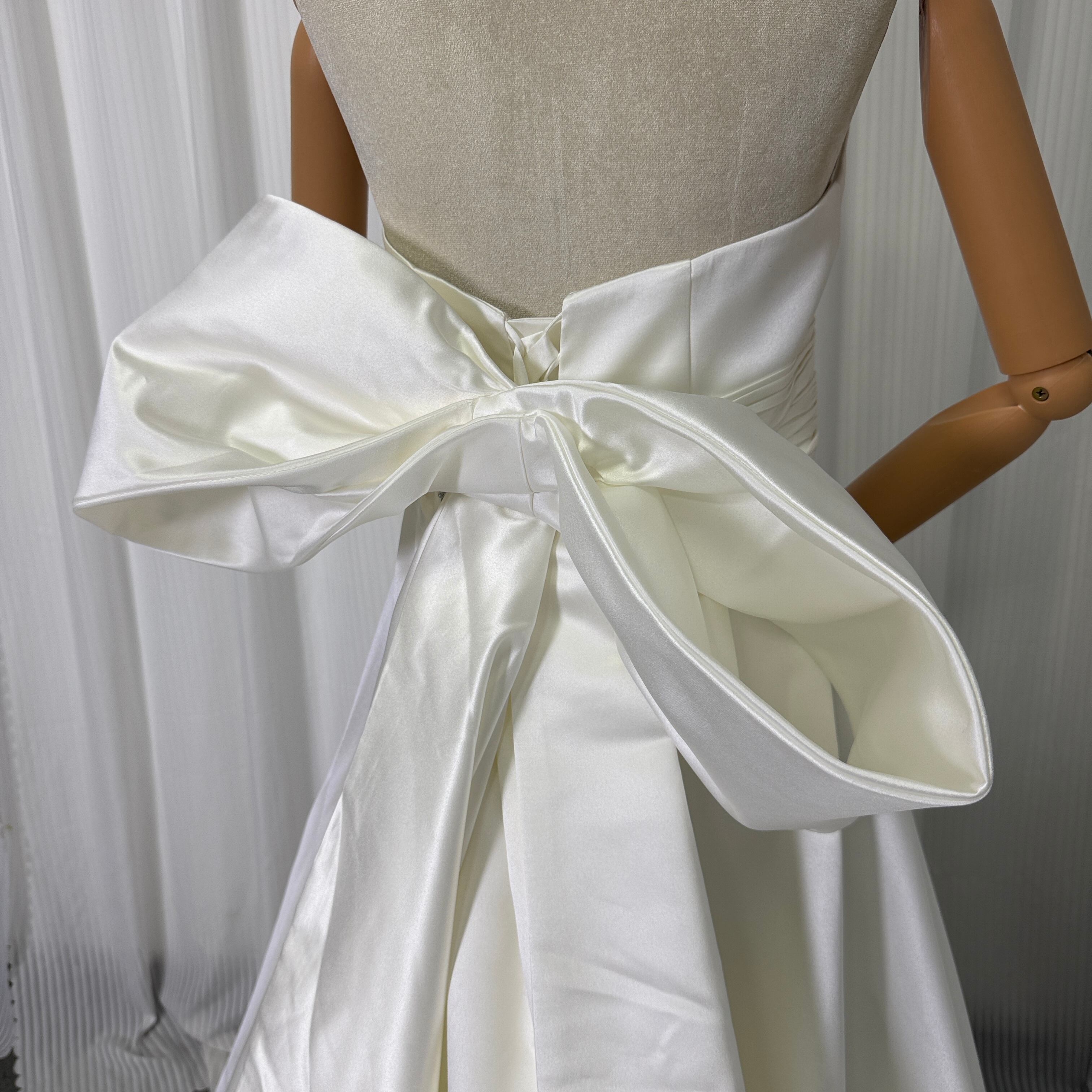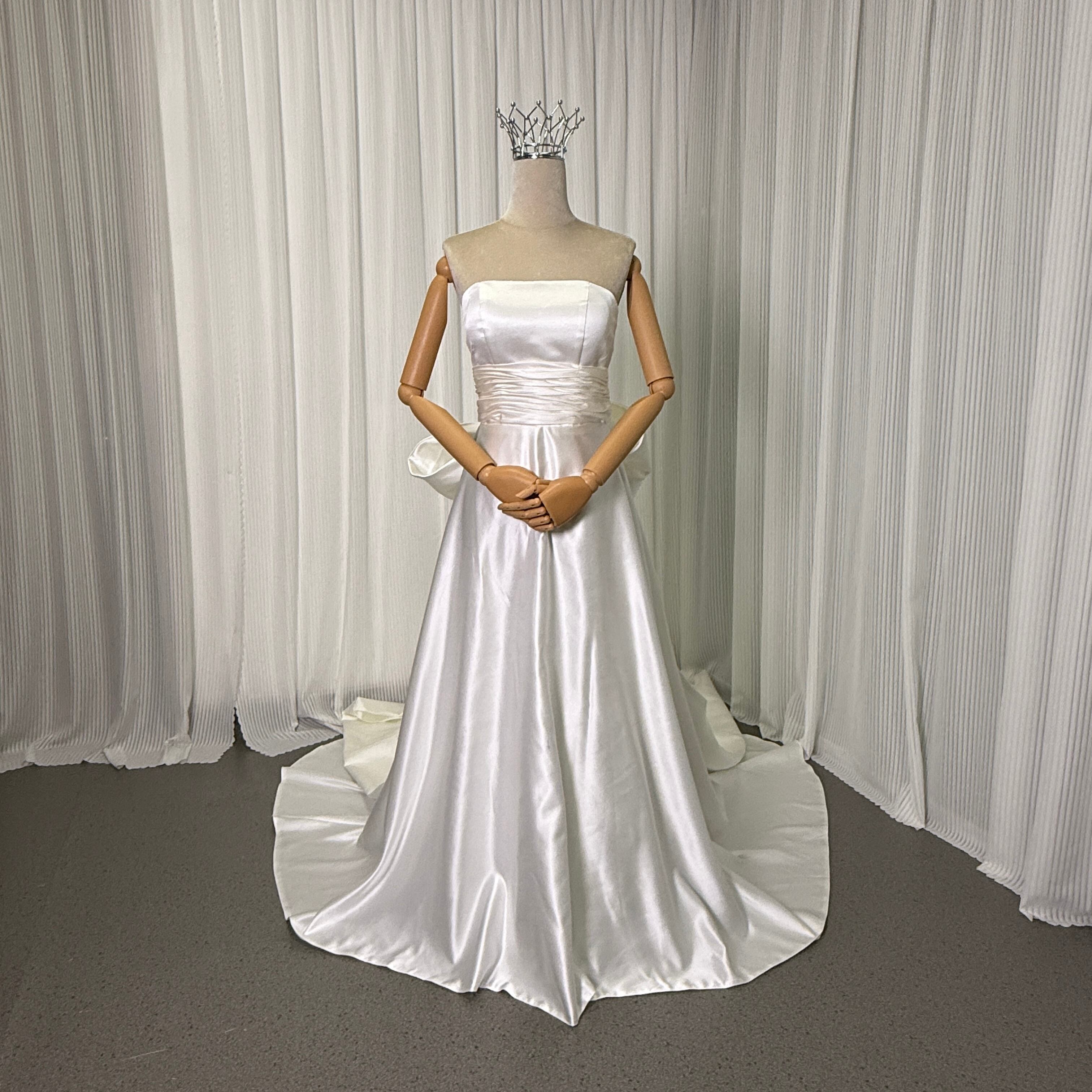 ウエディングドレス オフホワイト ふっくら柔らかなバックリボン 光沢サテン ベアトップ ロングトレーン 花嫁
