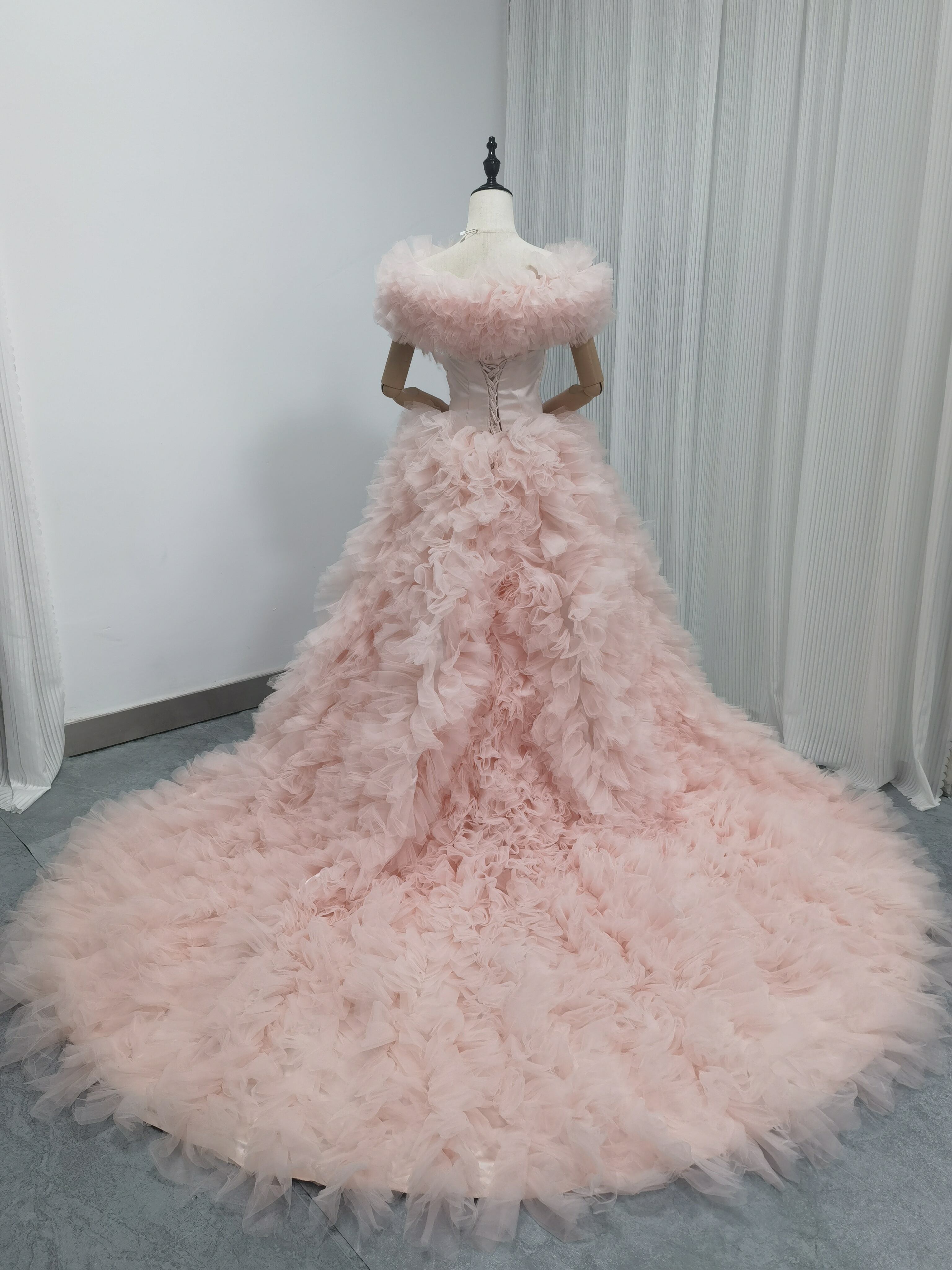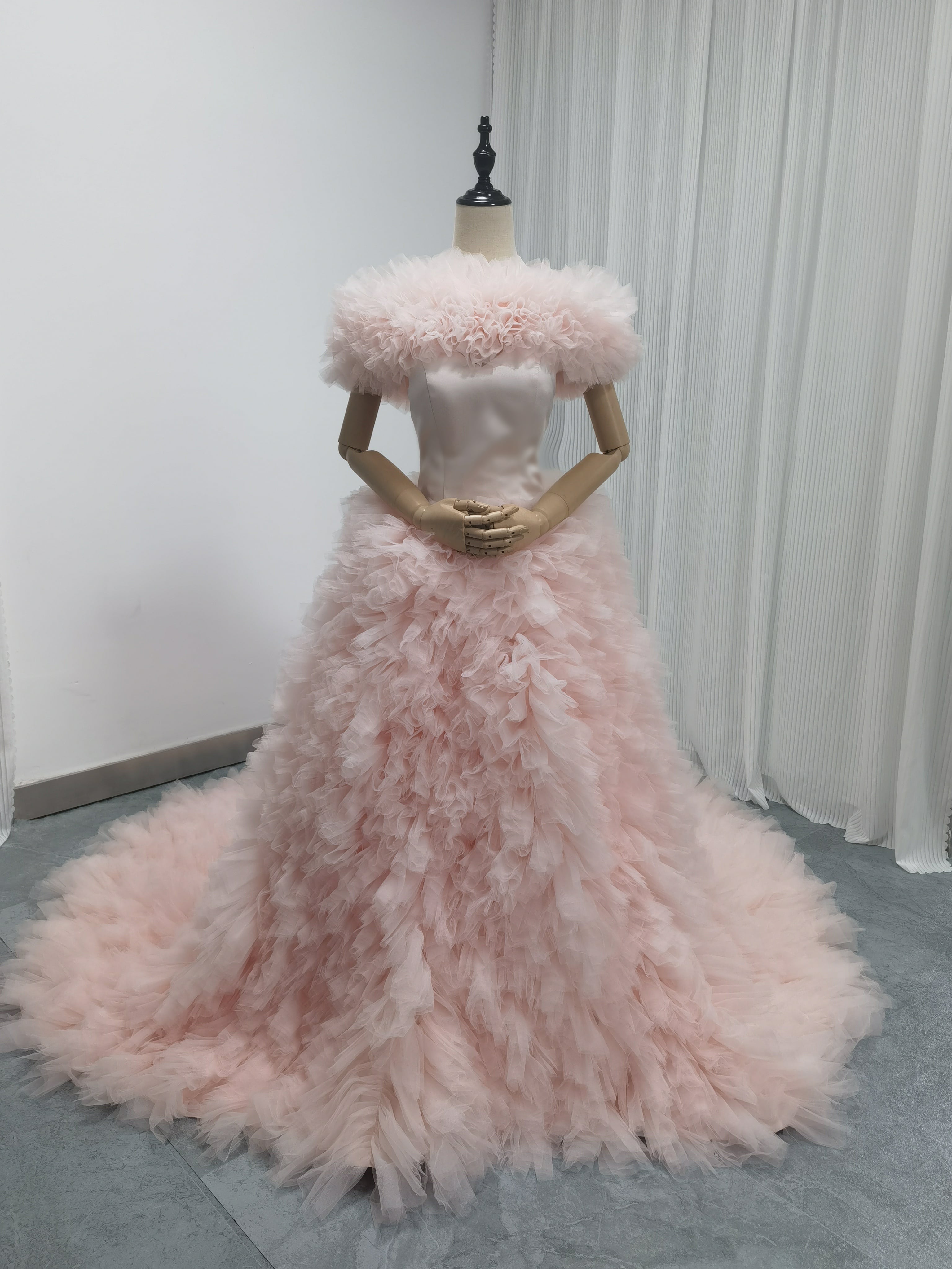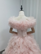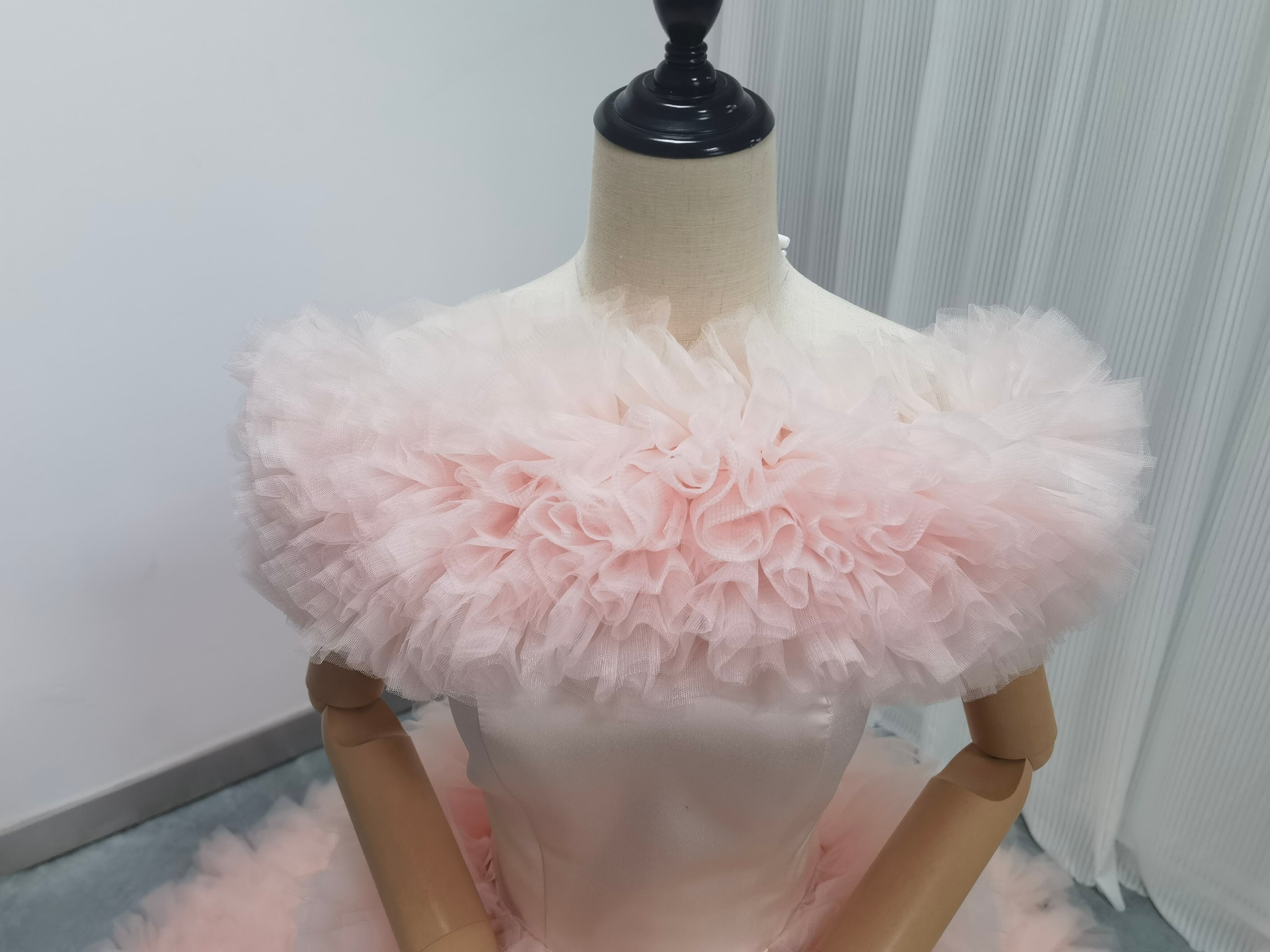 豪華! カラードレス ピンク 取り外しオフショルダー ラッフルフリル 編み上げ プリンセスライン