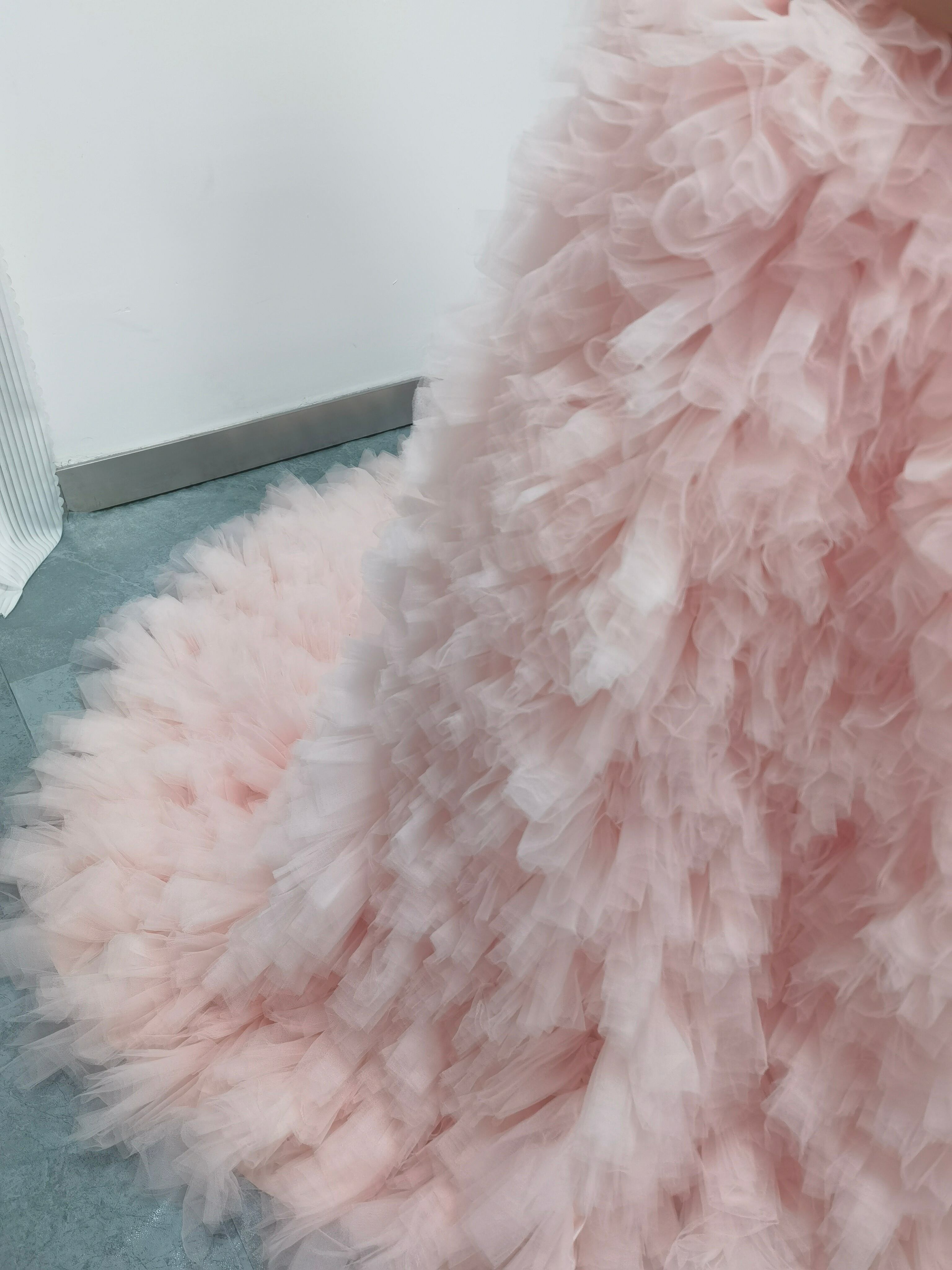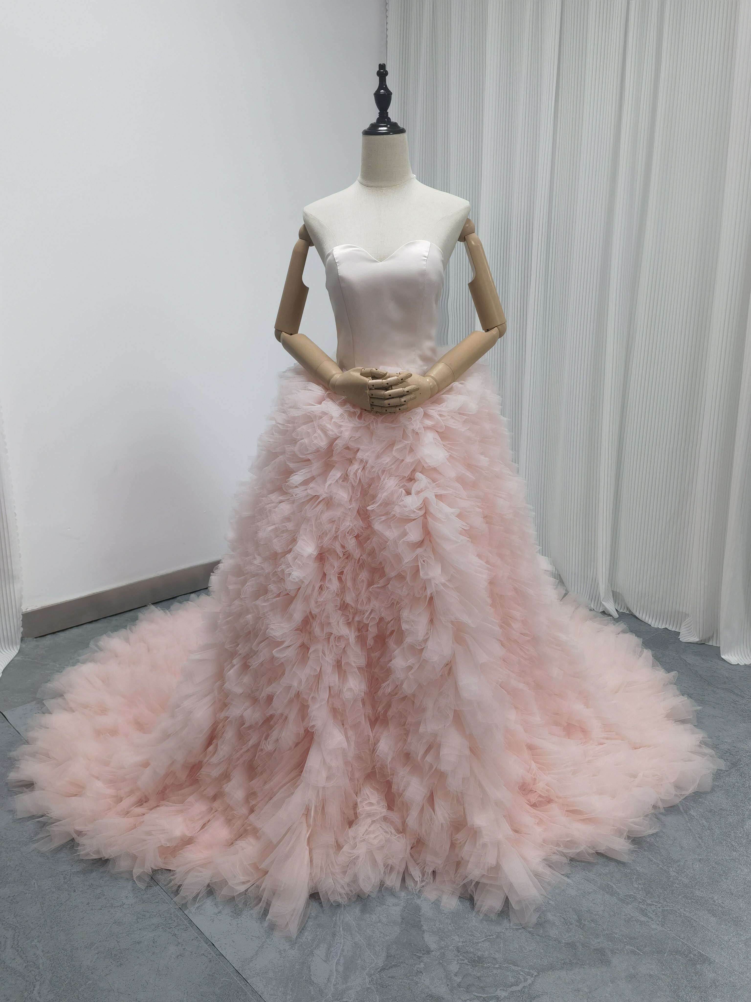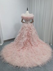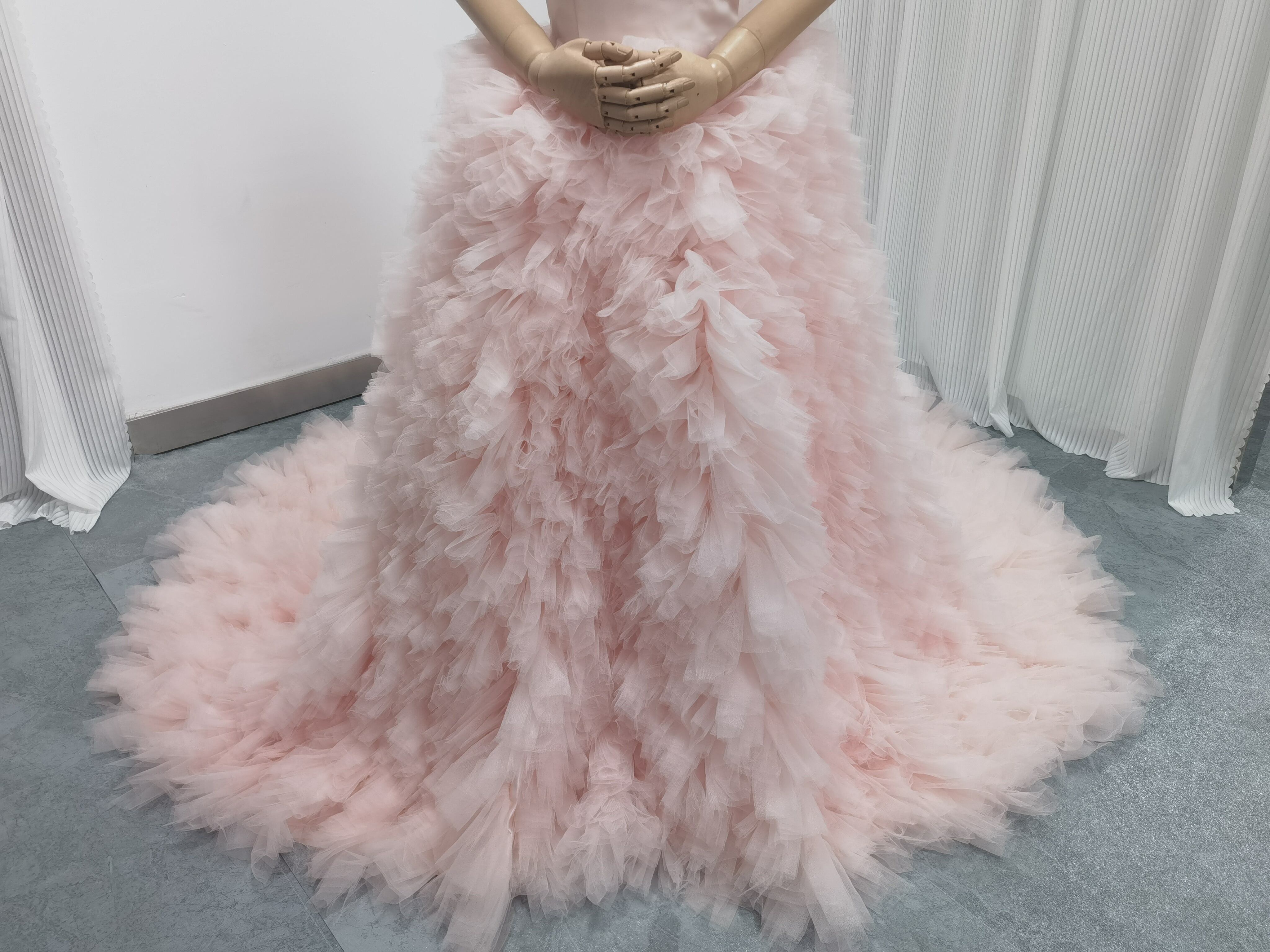 豪華! カラードレス ピンク 取り外しオフショルダー ラッフルフリル 編み上げ プリンセスライン