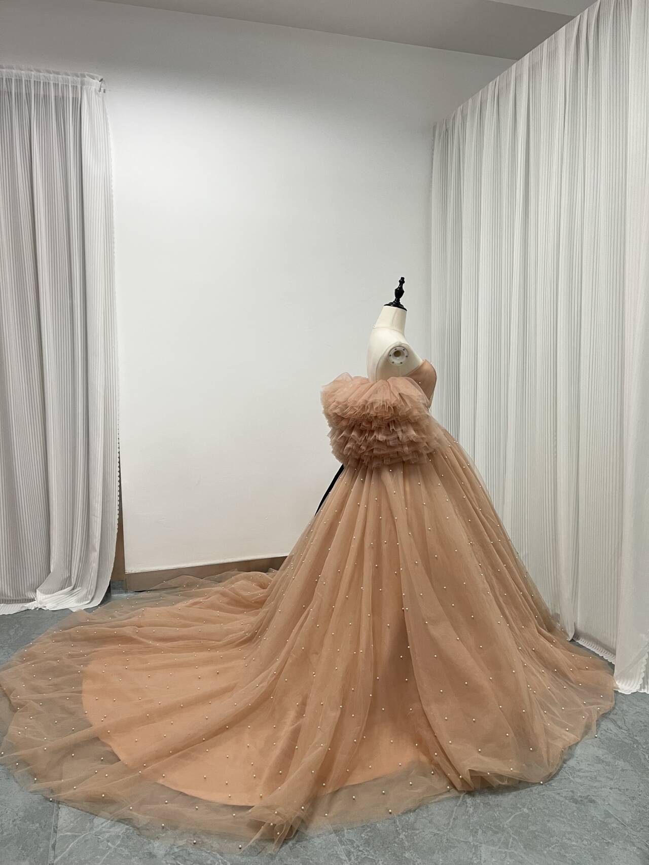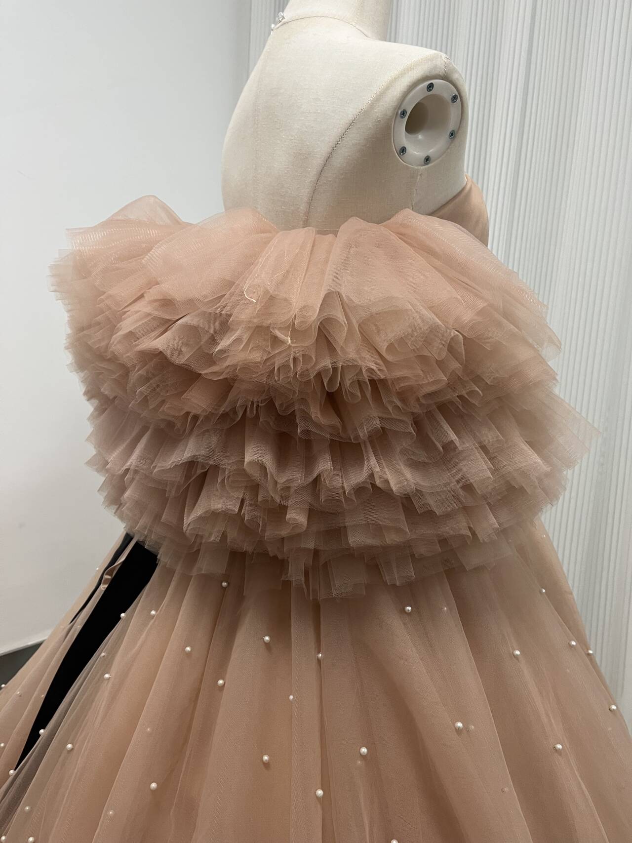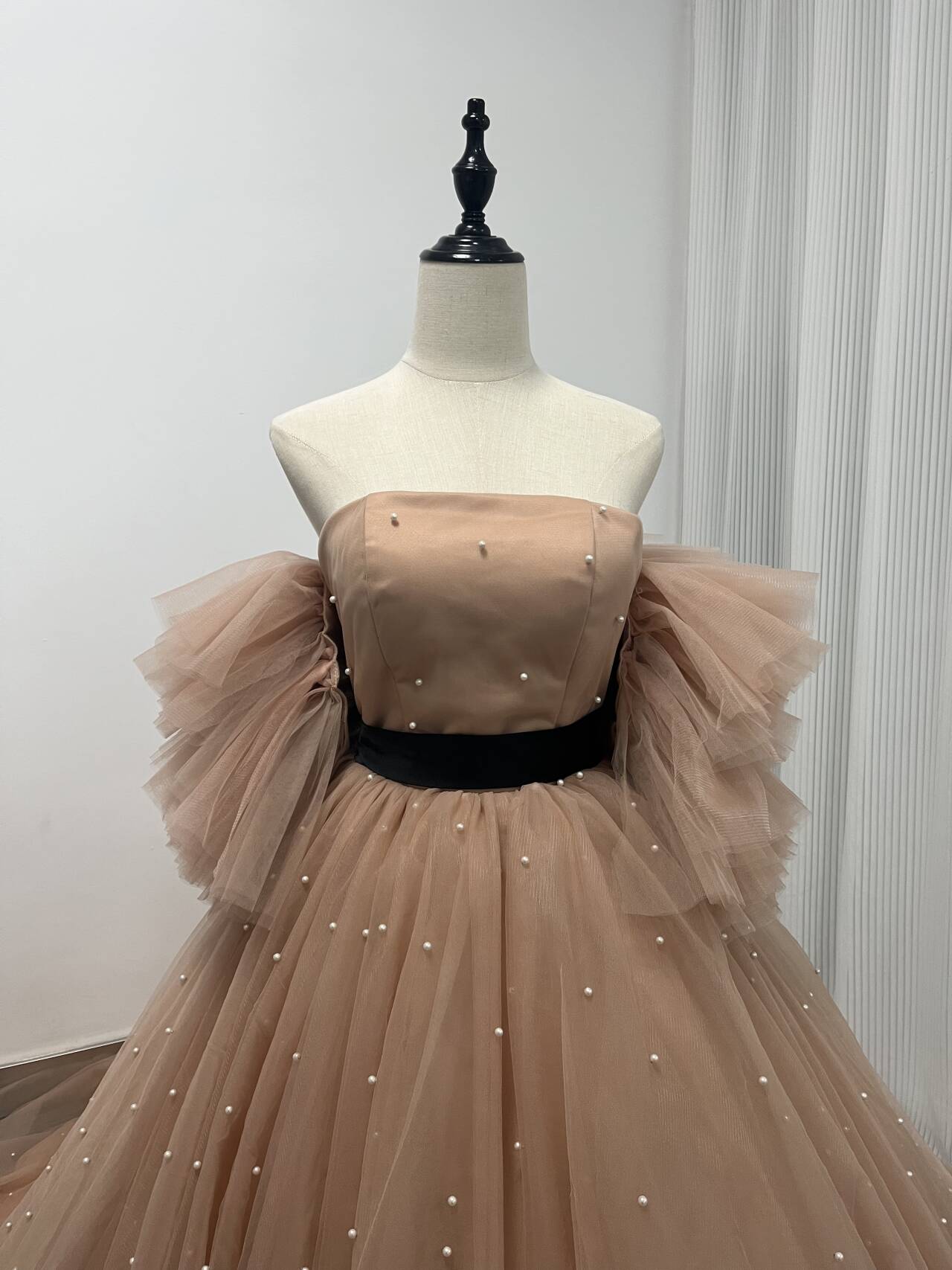 ウェディングドレス パール ベアトップ 編み上げ 可愛い シャンパン色 披露宴 花嫁 ラッフルフリル
