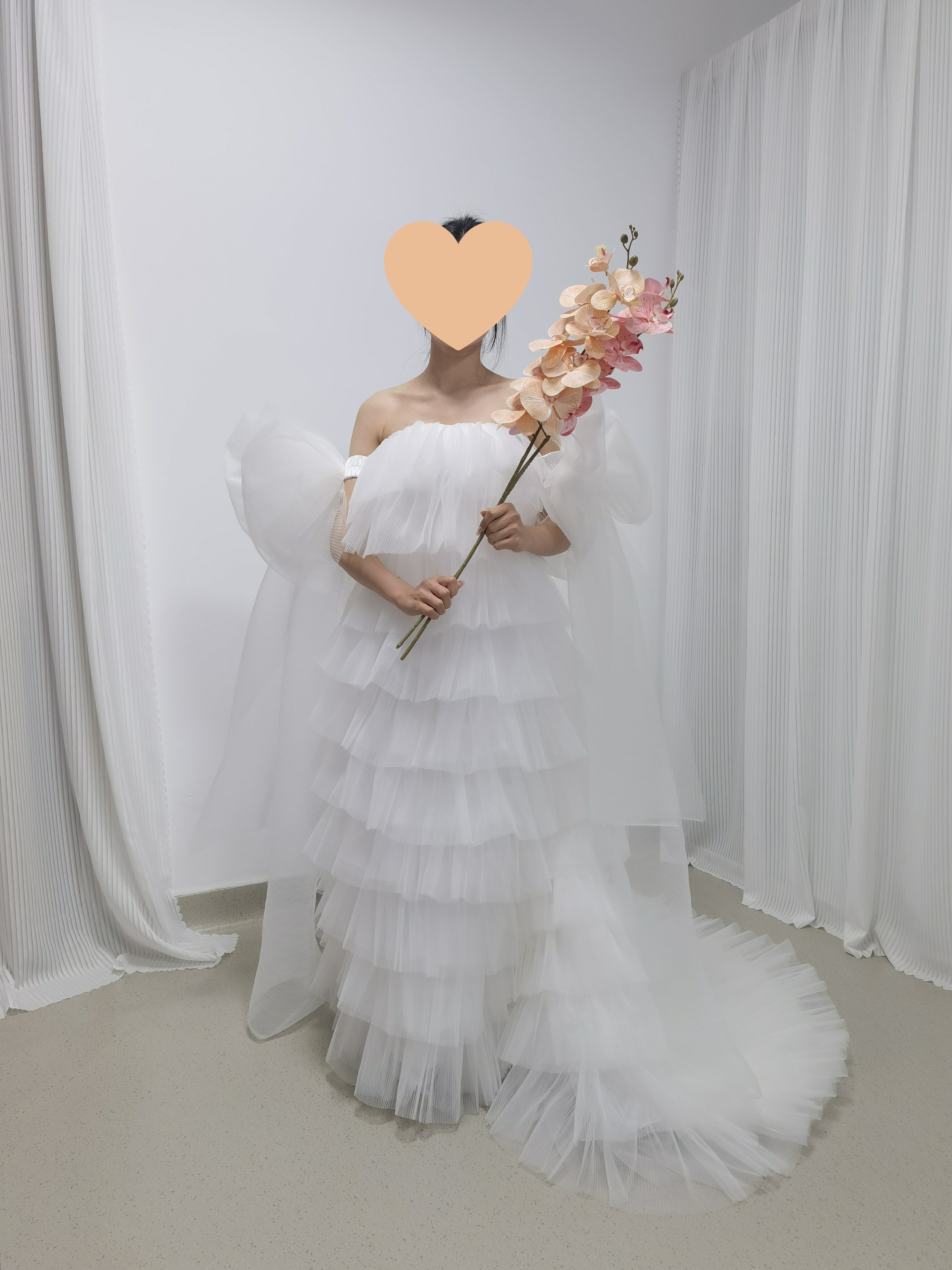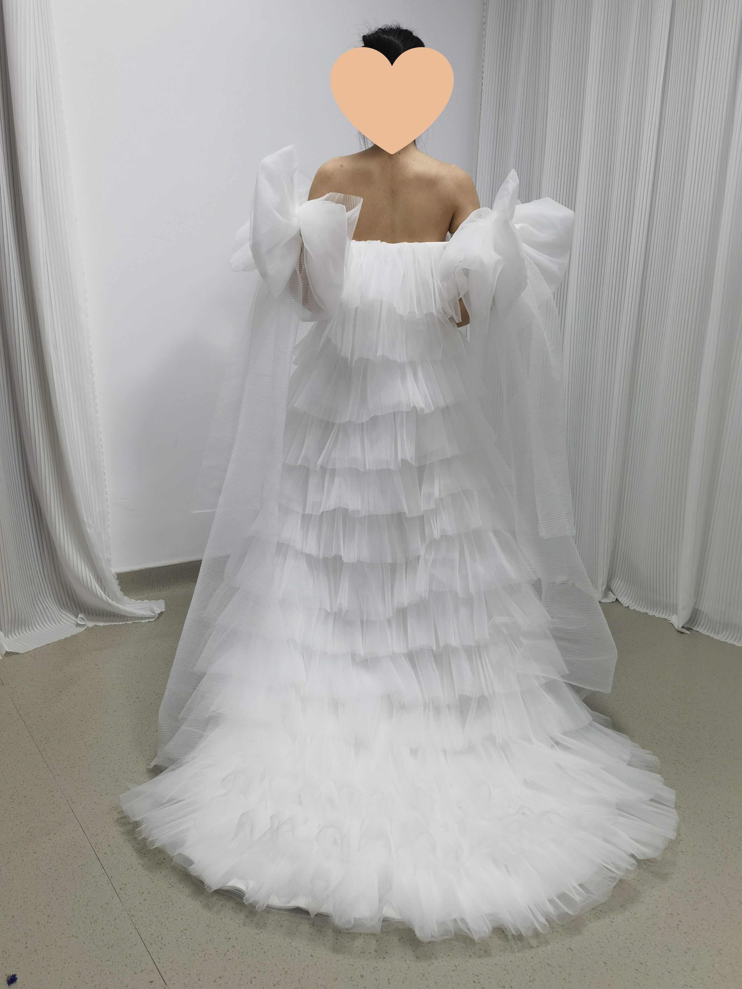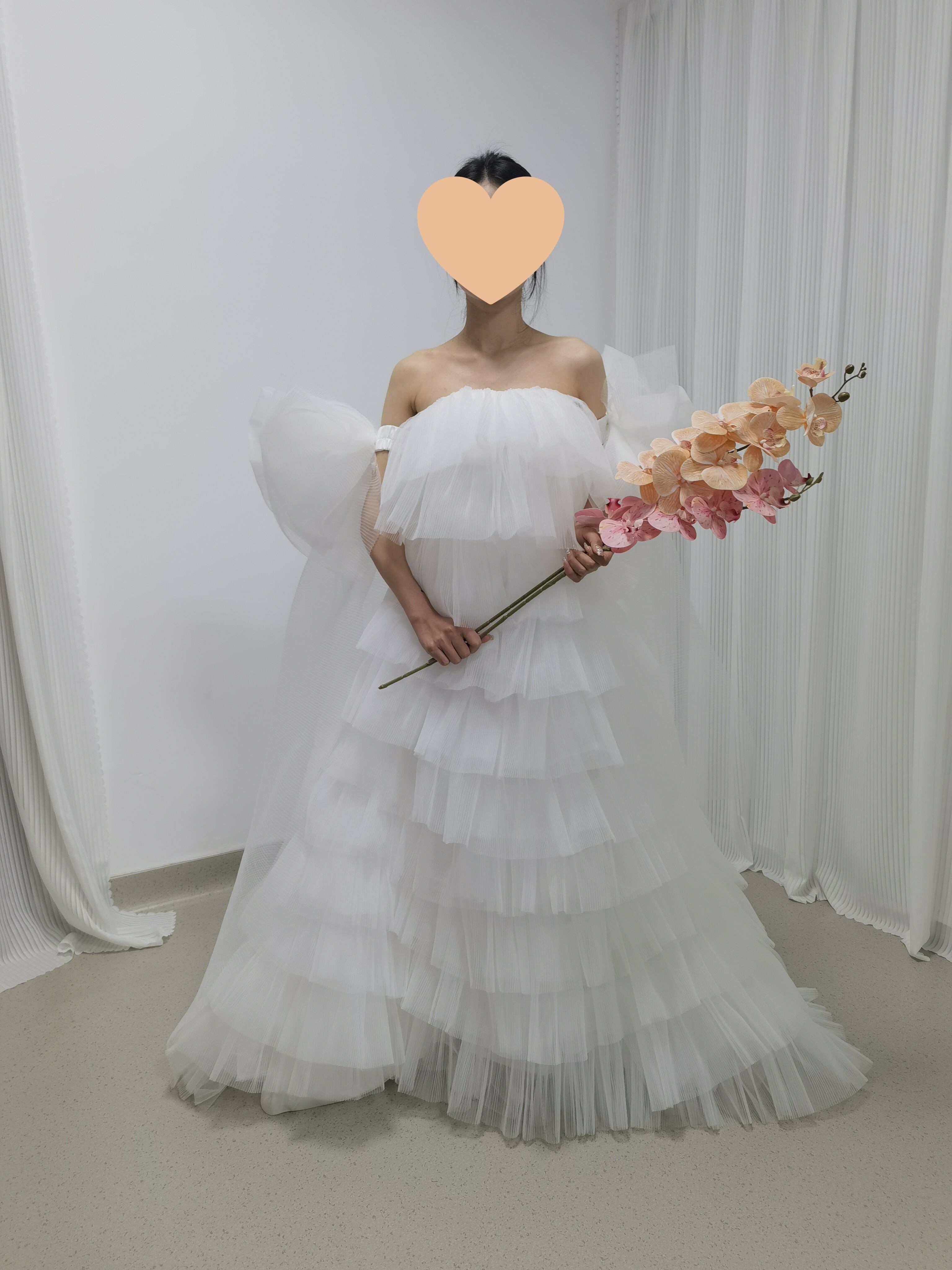 ウェディングドレス ベアトップ 姫袖 リボン 柔らかく重ねたチュールスカート 可愛い オフホワイト
